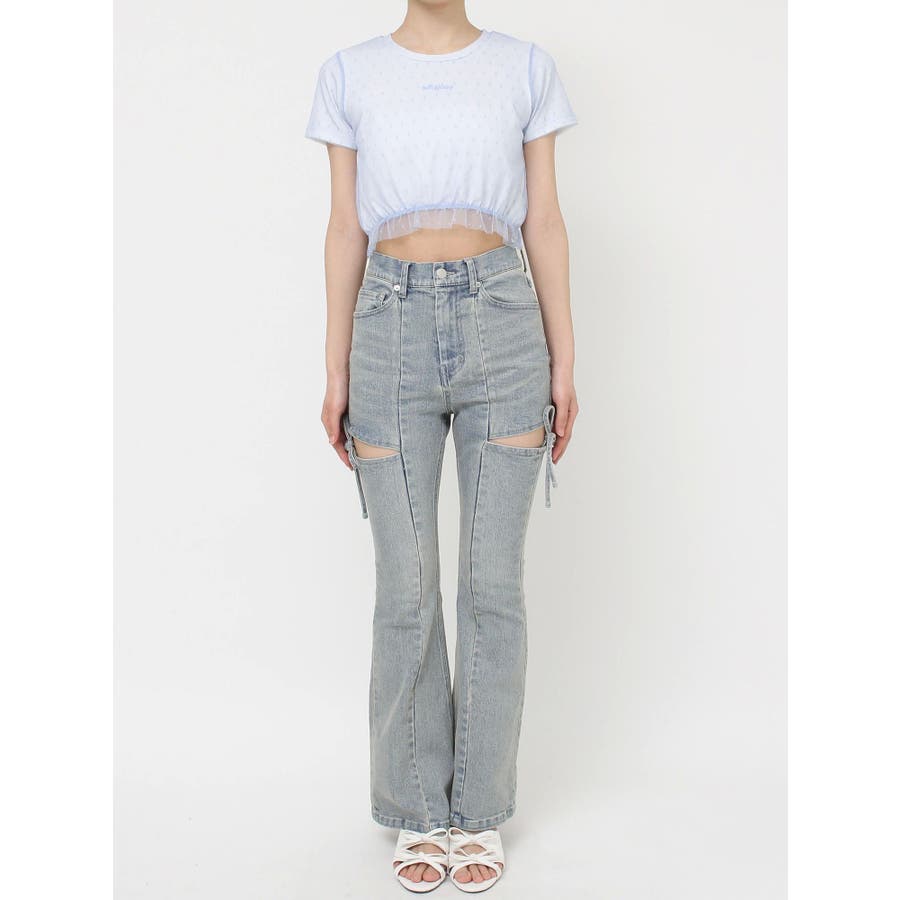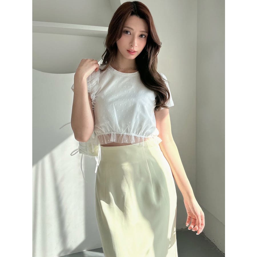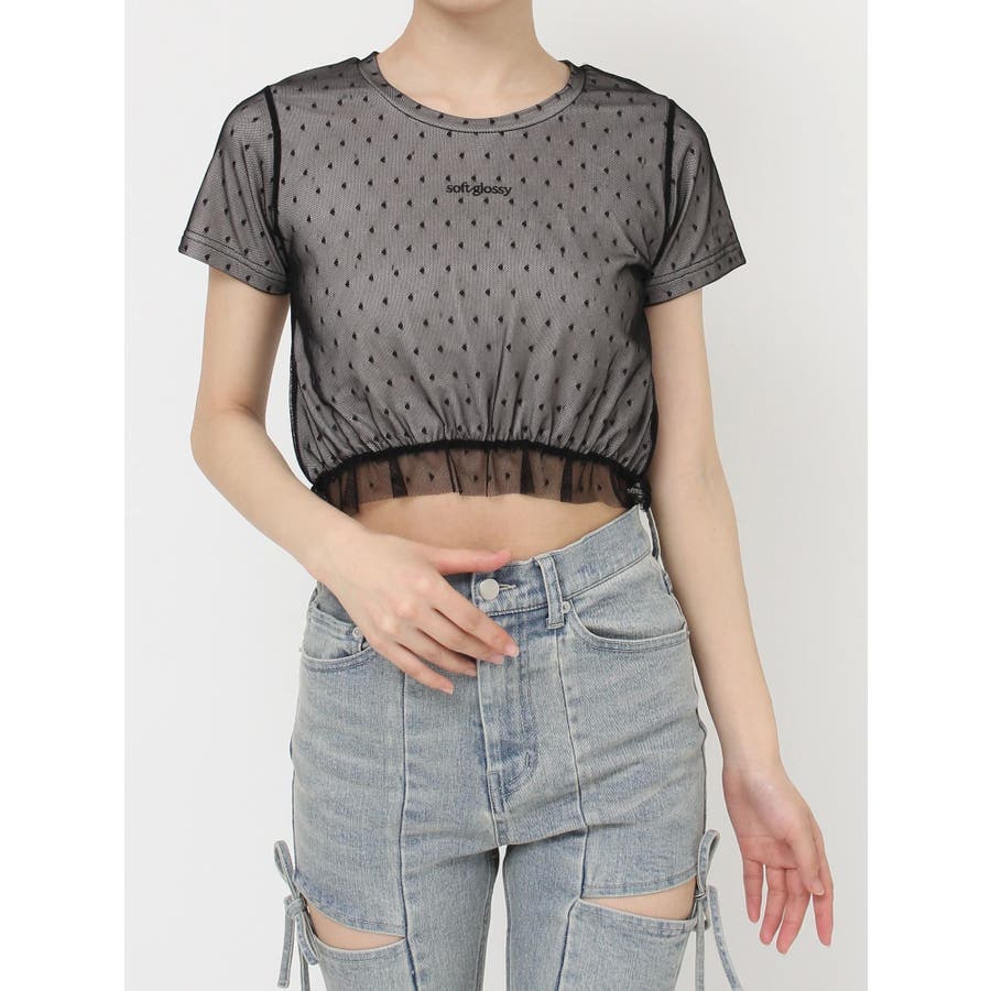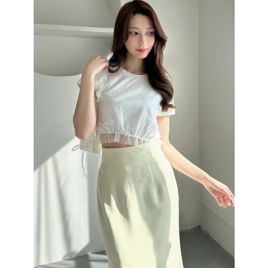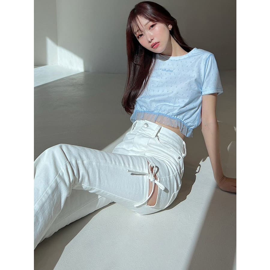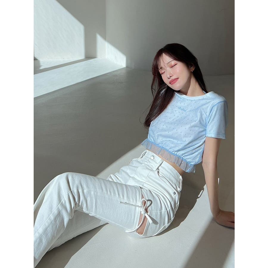 ドット柄のチュールを重ねたデザインTシャツ▽デザイン▽裾にはフリルを付け可愛いらしさをプラスし、カジュアルすぎず使いやすいコンパクトTシャツに。今季のシーズンコンセプトのロゴをさりげなく刺繍しワンポイントに。クロップド丈で裾は絞ったことでスタイルアップ効果抜群!▽カラー▽白・黒・青の3色展開。▽スタイリング▽ハイウエストボトム合わせがおすすめ!Tシャツだけどカジュアルすぎず、キレイ目なボトムにも合わせやすいアイテムです。※着用画像はフラッシュの加減で実際の製品と色味等が異なる場合がございますので、生地のズームアップ画像をご確認ください。※ご利用の端末画面の設定により実際の商品と色味が異なる場合がございます。【商品特徴】透け感:なし伸縮性:あり生地の厚さ:普通サイズ感:普通裏地:なしポケット:なし