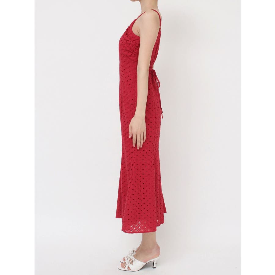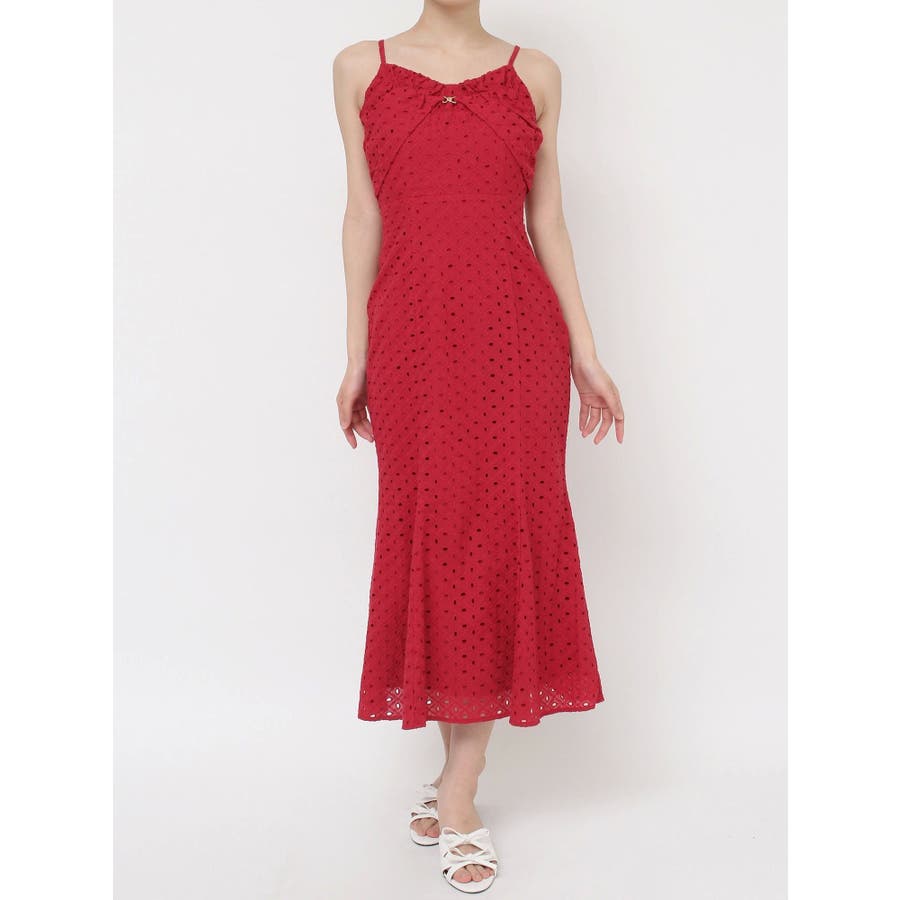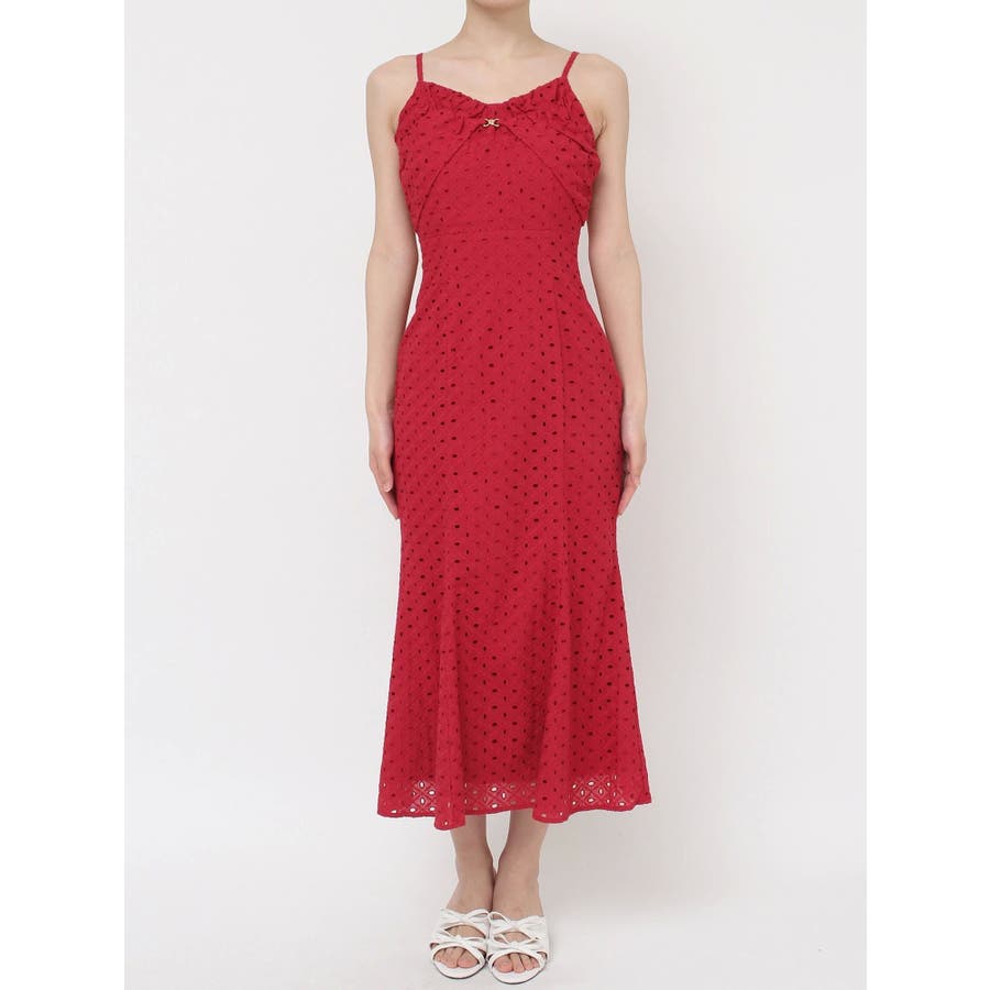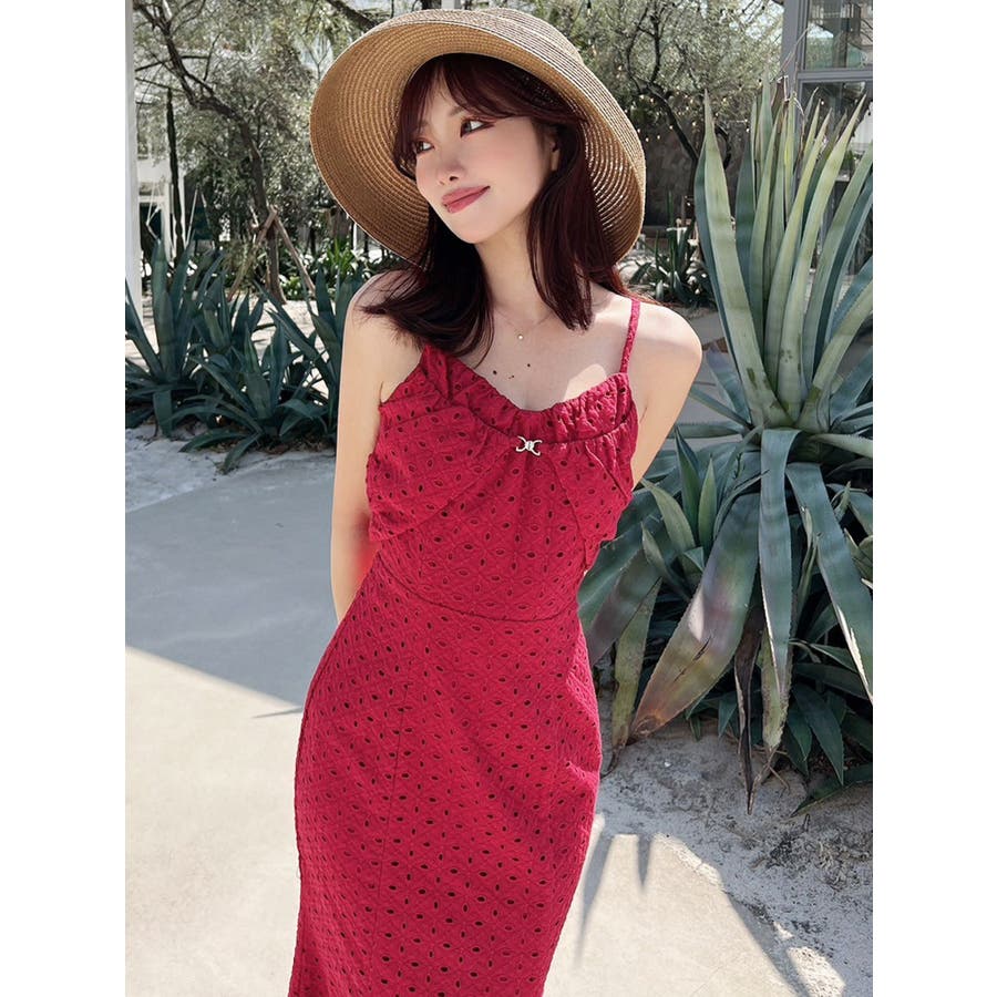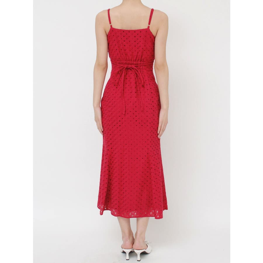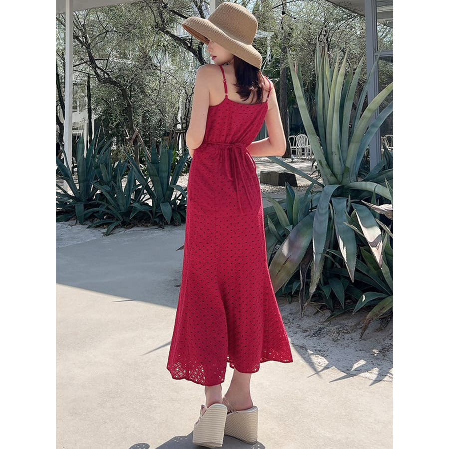 シーズンムードを高めるコットンレースのワンピース▽デザイン▽刺繍を施したコットンにドレープを重ねて上品な雰囲気を表現しました。華奢なゴールドパーツやマーメイドラインで素材とのコントラストを付け、今季らしいデザインに仕上げました。バックウエストはリボンでウエスト調節ができるので細見えシルエットが1枚で完成◎ハートネックデザインがデコルテをすっきりと見せ、女性らしい印象の夏ワンピース。▽カラー▽白・黒・赤の3色展開。▽スタイリング▽サラッと着用できて上品な印象に仕上がる1枚。マーメイドシルエットのキャミワンピなので薄手の羽織りも合わせやすく様々なシーンで活躍します。※着用画像はフラッシュの加減で実際の製品と色味等が異なる場合がございますので、生地のズームアップ画像をご確認ください。※ご利用の端末画面の設定により実際の商品と色味が異なる場合がございます。【商品特徴】透け感:なし伸縮性:なし生地の厚さ:薄手サイズ感:普通裏地:ありポケット:なしファスナー:あり(横)
