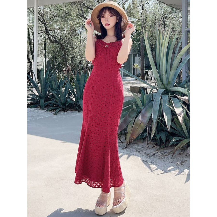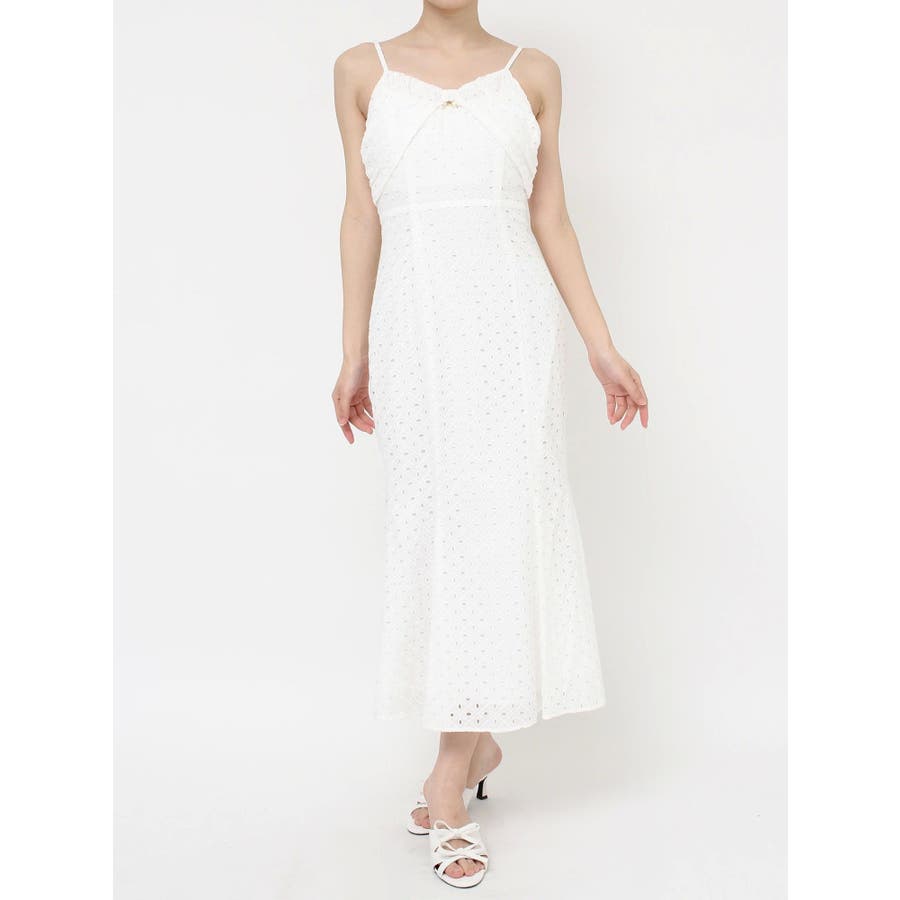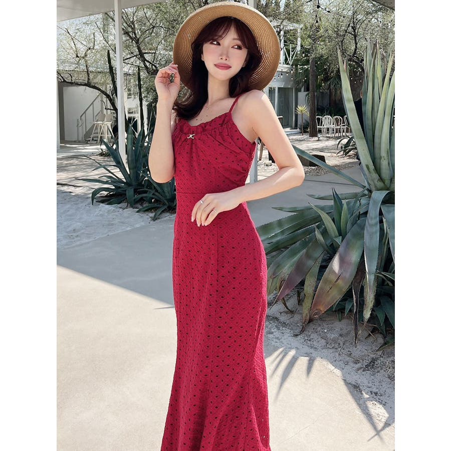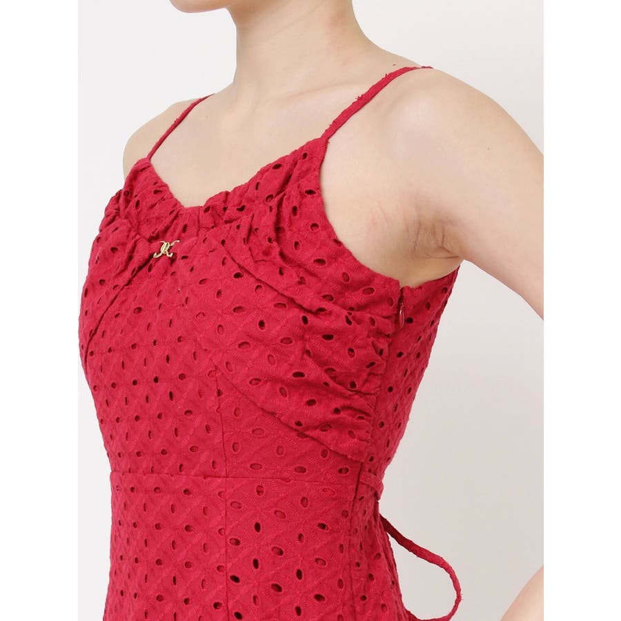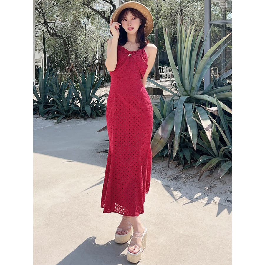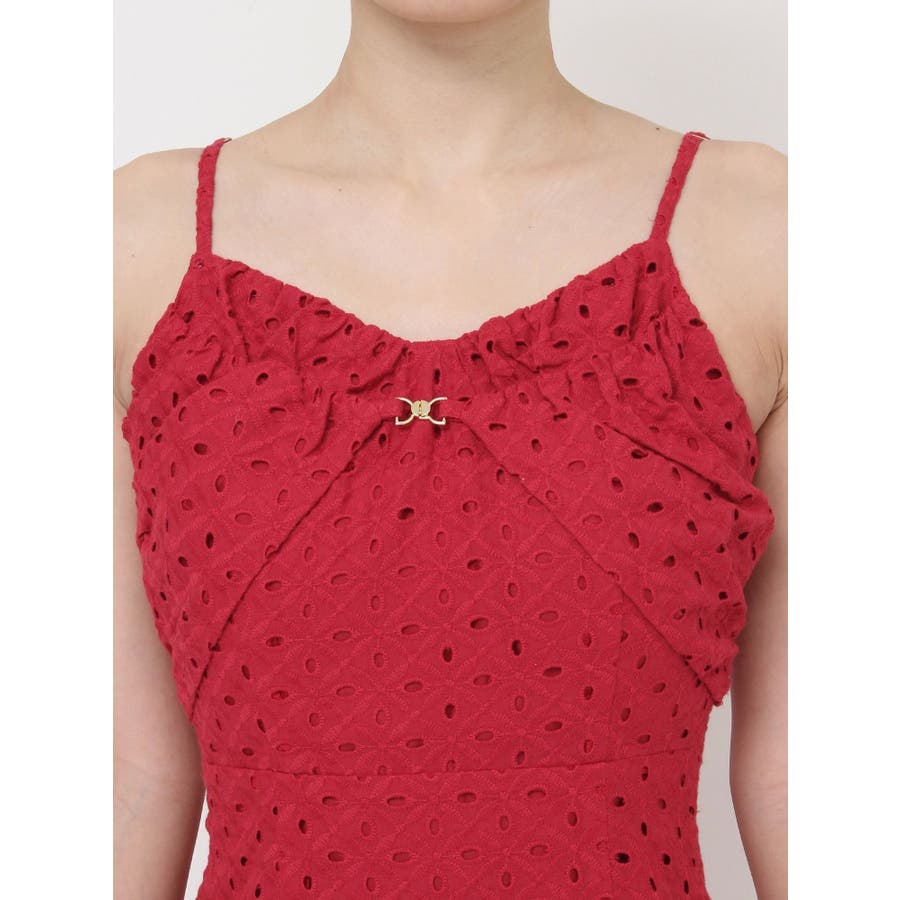 シーズンムードを高めるコットンレースのワンピース▽デザイン▽刺繍を施したコットンにドレープを重ねて上品な雰囲気を表現しました。華奢なゴールドパーツやマーメイドラインで素材とのコントラストを付け、今季らしいデザインに仕上げました。バックウエストはリボンでウエスト調節ができるので細見えシルエットが1枚で完成◎ハートネックデザインがデコルテをすっきりと見せ、女性らしい印象の夏ワンピース。▽カラー▽白・黒・赤の3色展開。▽スタイリング▽サラッと着用できて上品な印象に仕上がる1枚。マーメイドシルエットのキャミワンピなので薄手の羽織りも合わせやすく様々なシーンで活躍します。※着用画像はフラッシュの加減で実際の製品と色味等が異なる場合がございますので、生地のズームアップ画像をご確認ください。※ご利用の端末画面の設定により実際の商品と色味が異なる場合がございます。【商品特徴】透け感:なし伸縮性:なし生地の厚さ:薄手サイズ感:普通裏地:ありポケット:なしファスナー:あり(横)