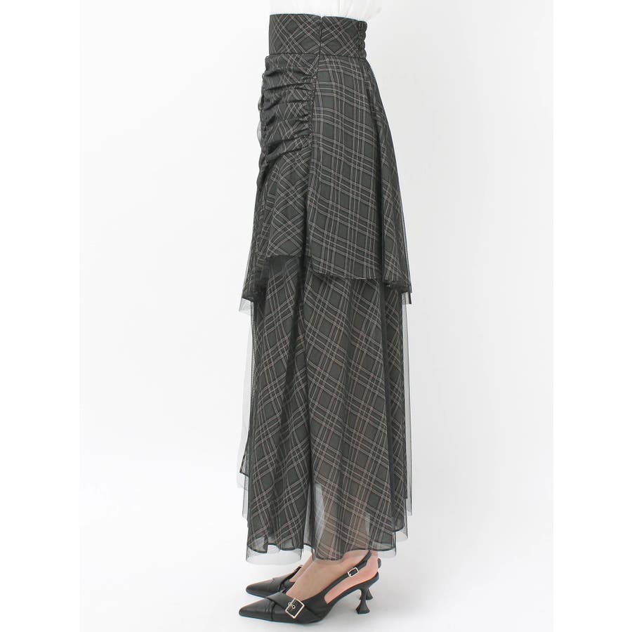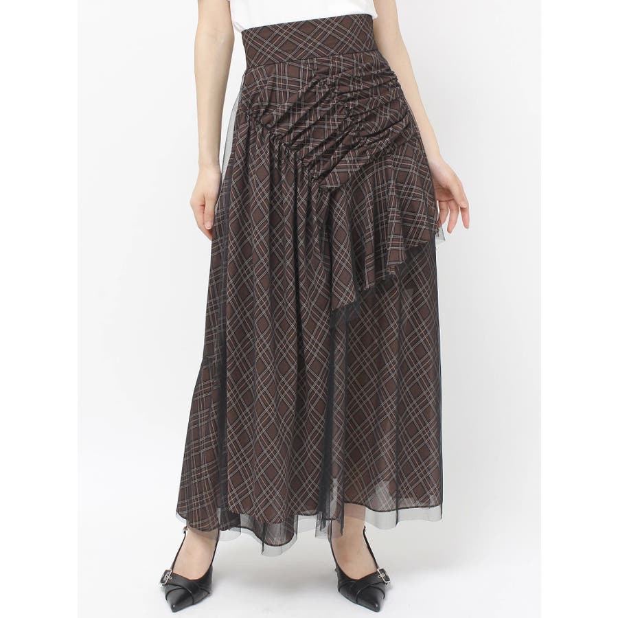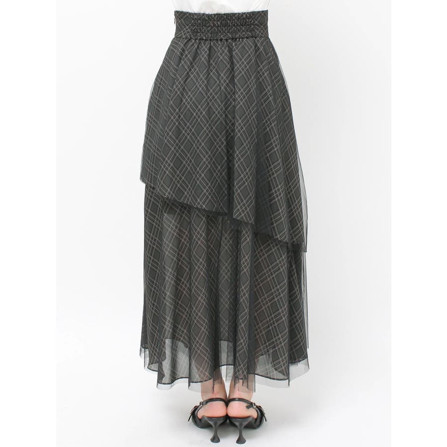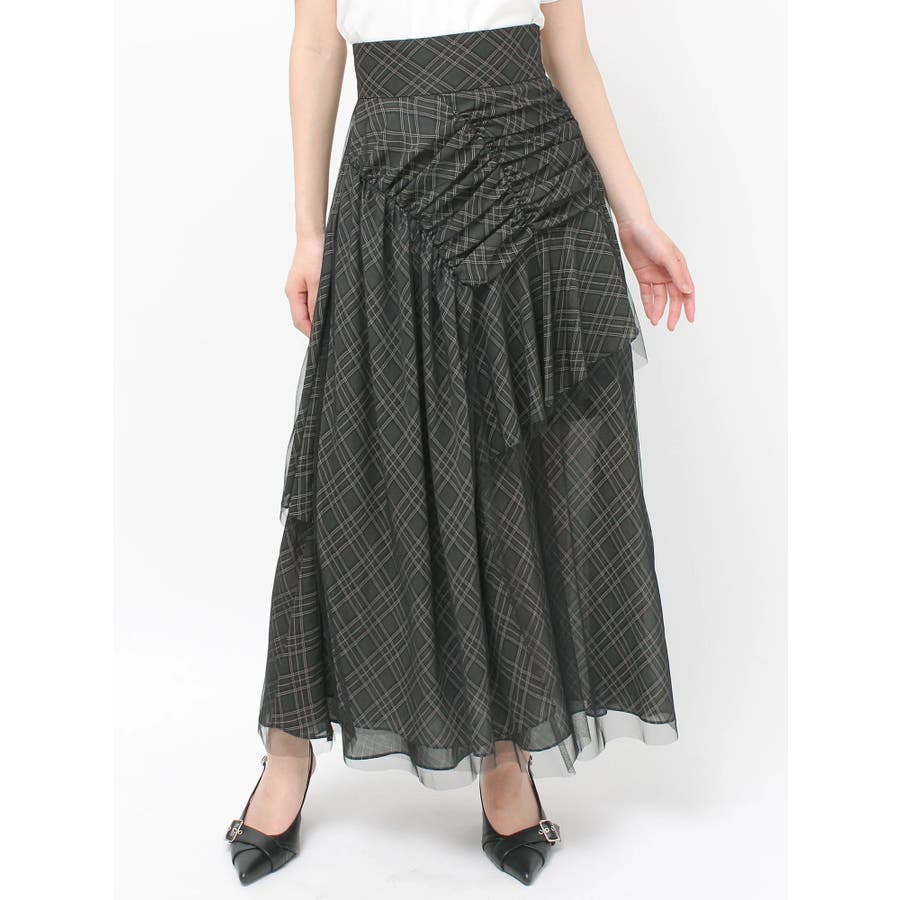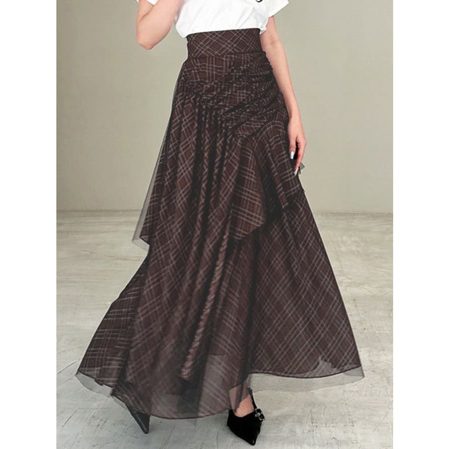 チュールをふんだんに使ったフレアスカート▽デザイン▽シフォン素材のチェック生地の上にチュールを重ねたレイヤードスカート。軽めの素材で仕上げたので晩夏にピッタリのアイテム。フロントにはギャザーをたっぷり寄せデザイン性のあるスカートに仕上げました。アシンメトリーなデザインでヒップ部分は生地が重なっているのでボディラインを拾わず後ろ姿もすっきり見え◎ハイウエストでバックウエストはシャーリングになっているのでタイトに見せてくれウエストから裾にかけてのフィットフレアシルエットが美しい1枚です。▽カラー▽ピンク・グリーン・ブラウンの3色展開。ピンクは無地で春先にも使いやすい明るいカラーに。グリーンとブラウンは深めの配色のチェック柄を使用しシーズンムードが高まります。▽スタイリング▽シーズンレスに活躍するフレアスカートです。Tシャツからニットまで、どんなトップスとも相性抜群◎※着用画像はフラッシュの加減で実際の製品と色味等が異なる場合がございますので、生地のズームアップ画像をご確認ください。※ご利用の端末画面の設定により実際の商品と色味が異なる場合がございます。【商品特徴】透け感:なし伸縮性:なし生地の厚さ:薄手サイズ感:普通裏地:ありポケット:なし