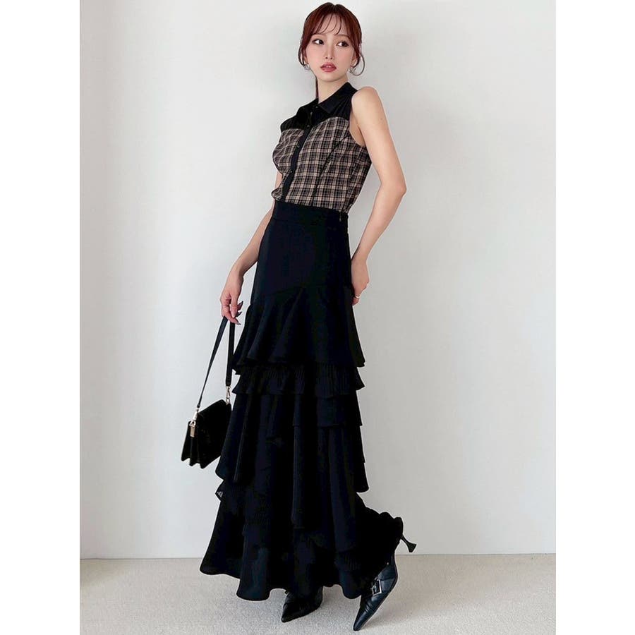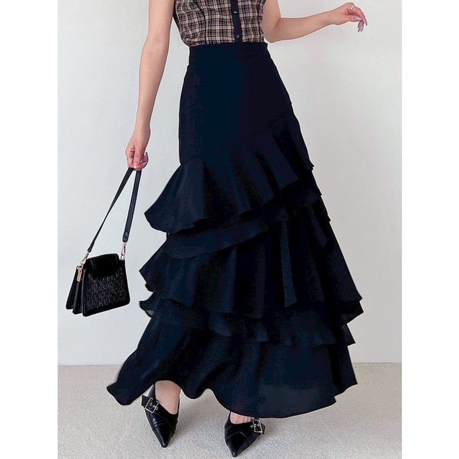 ラッフルを重ねた存在感のあるスカート▽デザイン▽シアー生地と重ねたラッフルがポイントのスカート。シアー部分には消しプリーツを入れ、同色ながら華やかさをプラス。揺れ感が女性らしさUP!ハイウエストでヒップの下から切り替えをいれているのでボディラインは拾いすぎずに細見えが叶う1枚です。▽カラー▽黒・青・ベージュの3色展開。▽スタイリング▽どんなトップスでも万能にマッチ!ラッフルデザインなのでタイトなシルエットのトップスや、Tシャツやブラウスはインしたスタイリングがすっきり見えおすすめ!※着用画像はフラッシュの加減で実際の製品と色味等が異なる場合がございますので、生地のズームアップ画像をご確認ください。※ご利用の端末画面の設定により実際の商品と色味が異なる場合がございます。【商品特徴】透け感:なし伸縮性:なし生地の厚さ:普通サイズ感:普通裏地:ありポケット:なし