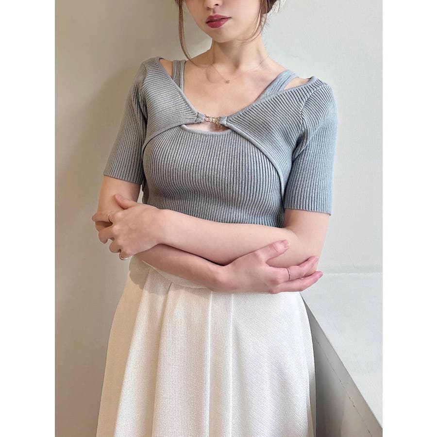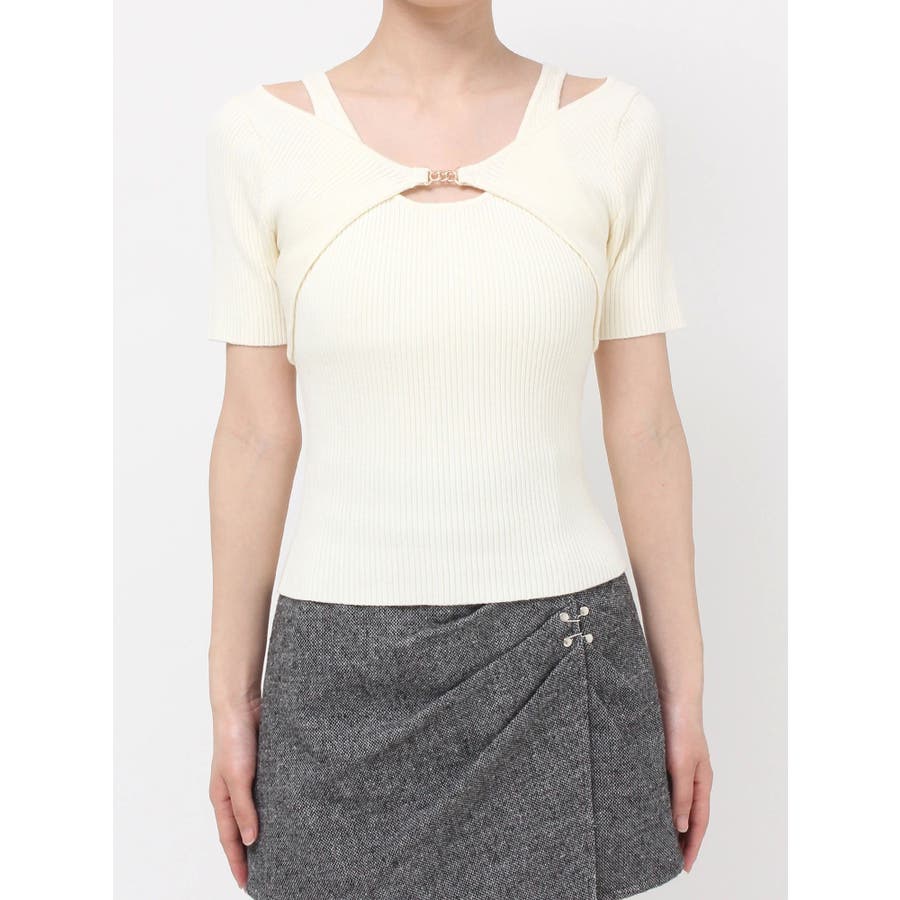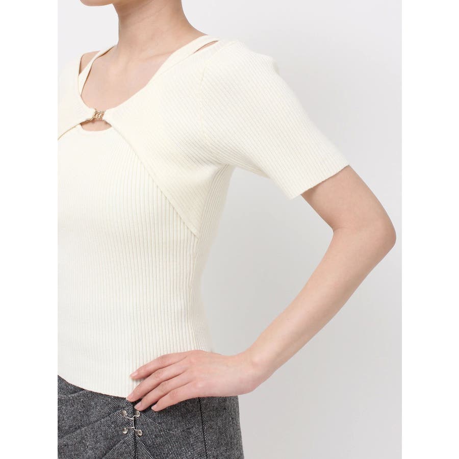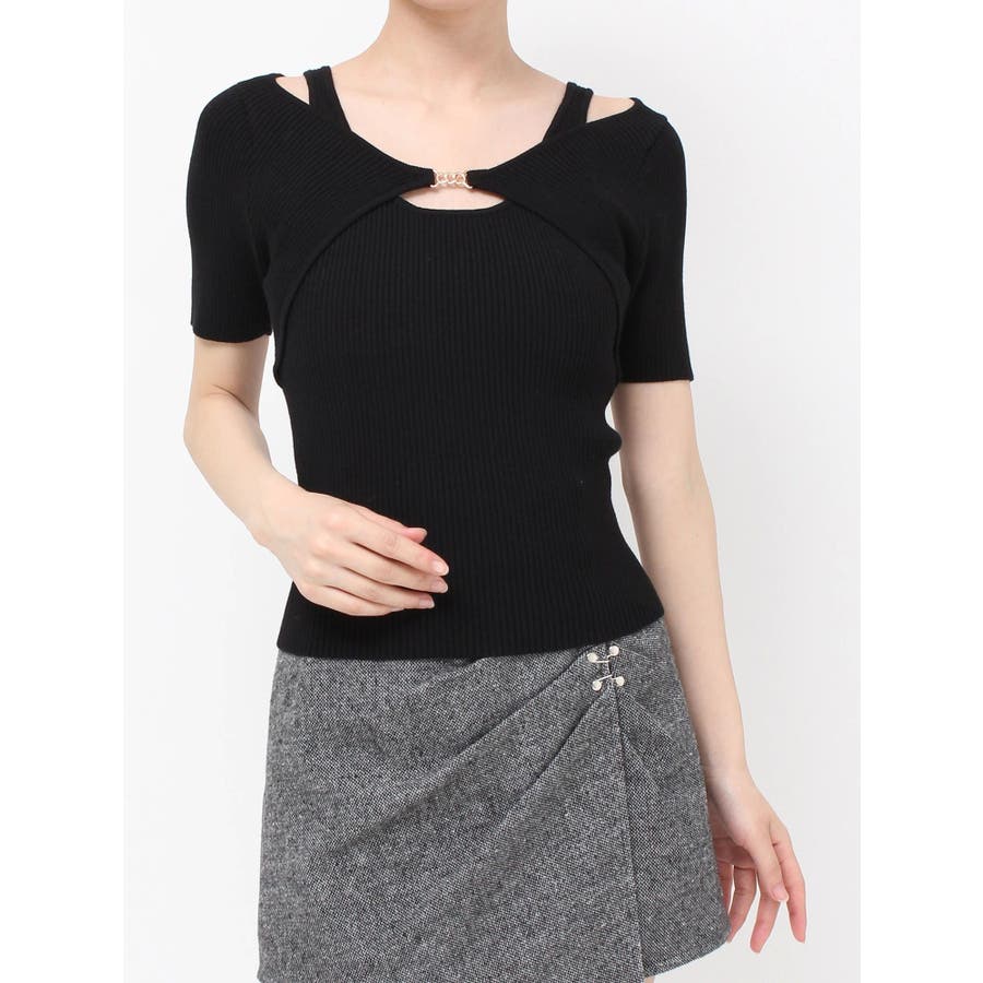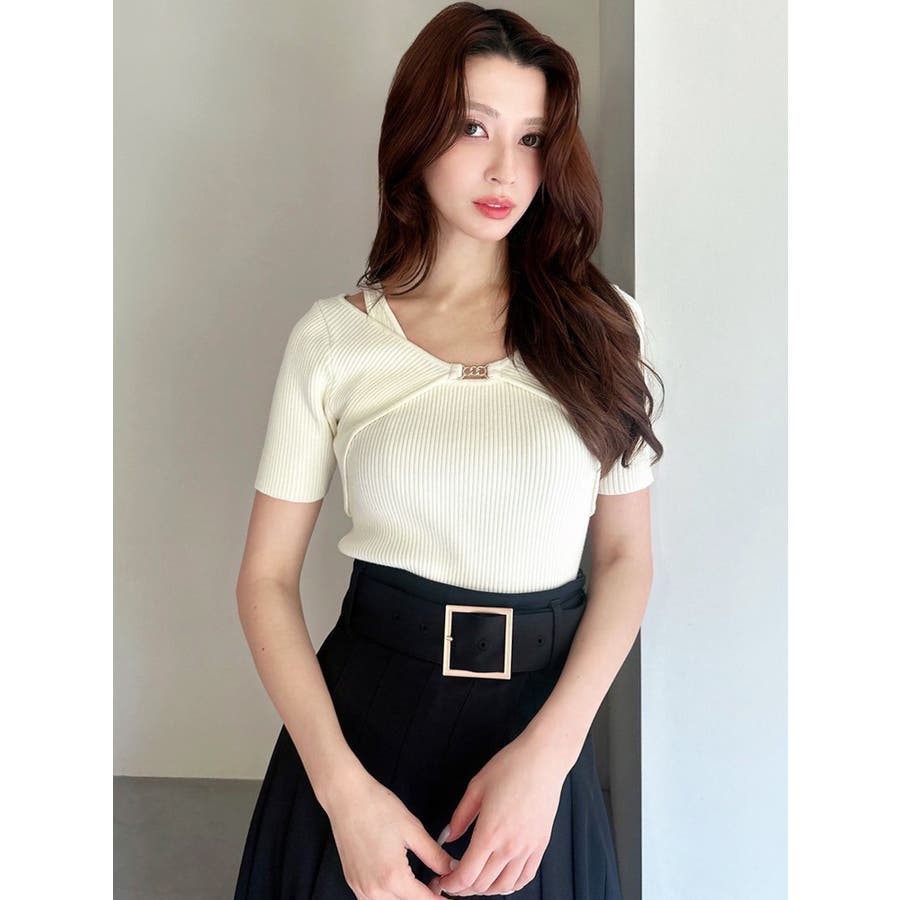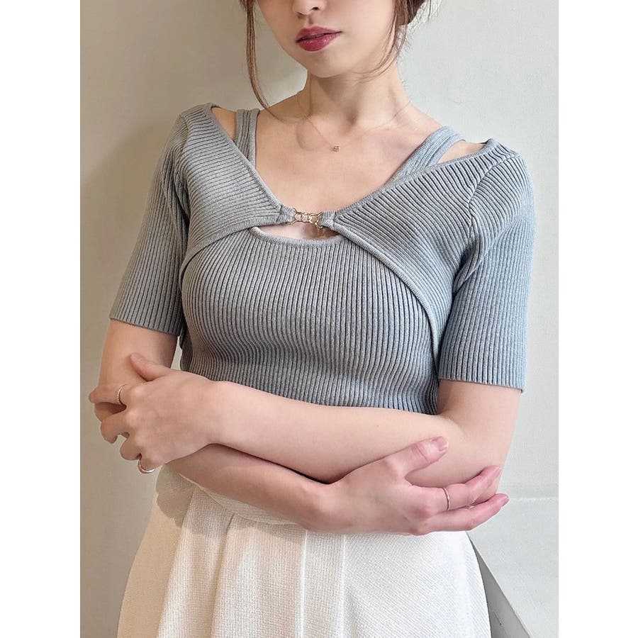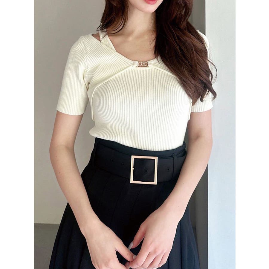 デコルテを美しく魅せるニットトップス▽デザイン▽さらっとした風合いでストレッチ性にすぐれ、体にフィットします。タイトな袖が二の腕周りもすっきり見せ。GOLDのチャームを施し、さりげないアクセントに。スタンダードな半袖ニットにフロントの肌見せデザインが目を惹く1枚です。▽カラー▽白・黒・青の3色展開。▽スタイリング▽ベーシックなトップスなのでデニムからスカートまで、カジュアルコーデにもキレイ目コーデにも使える万能アイテム。※着用画像はフラッシュの加減で実際の製品と色味等が異なる場合がございますので、生地のズームアップ画像をご確認ください。※ご利用の端末画面の設定により実際の商品と色味が異なる場合がございます。【商品特徴】透け感:なし伸縮性:ややあり 生地の厚さ:普通 サイズ感:普通裏地:なしポケット:なし