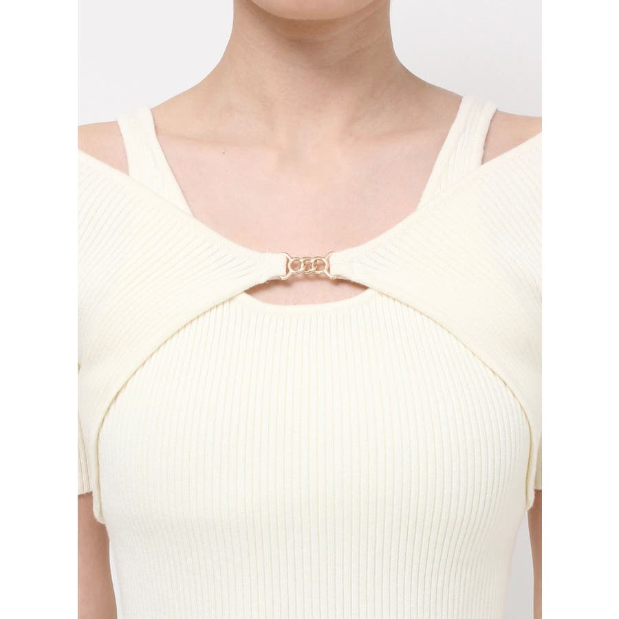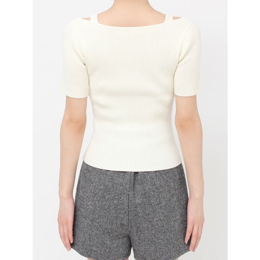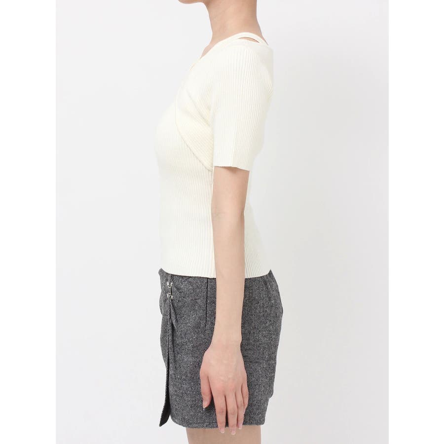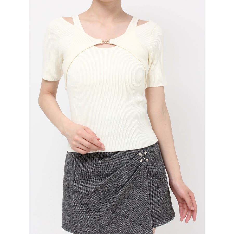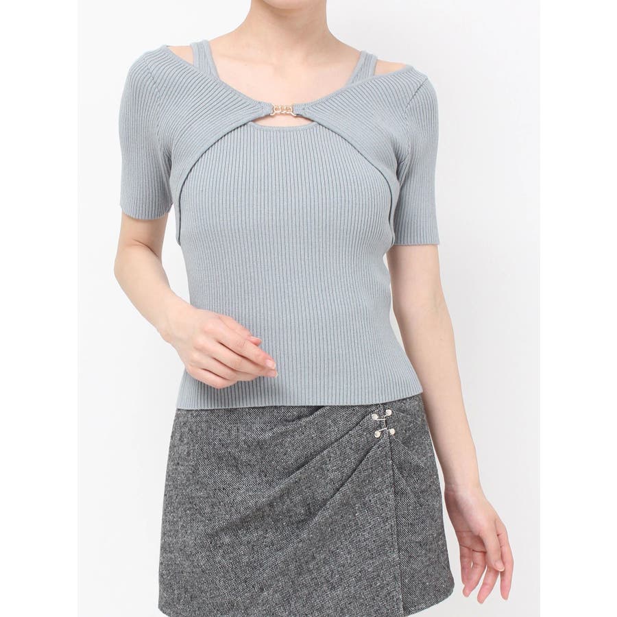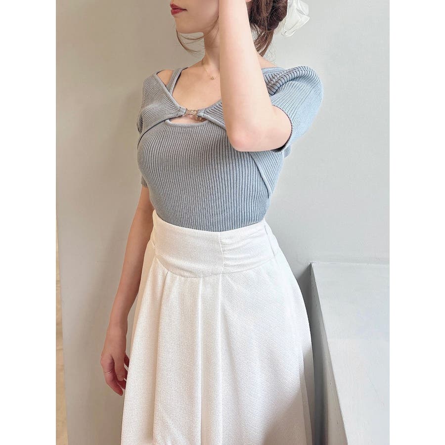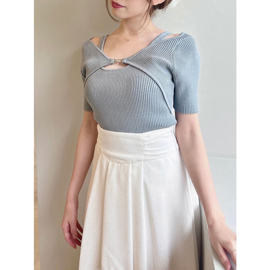 デコルテを美しく魅せるニットトップス▽デザイン▽さらっとした風合いでストレッチ性にすぐれ、体にフィットします。タイトな袖が二の腕周りもすっきり見せ。GOLDのチャームを施し、さりげないアクセントに。スタンダードな半袖ニットにフロントの肌見せデザインが目を惹く1枚です。▽カラー▽白・黒・青の3色展開。▽スタイリング▽ベーシックなトップスなのでデニムからスカートまで、カジュアルコーデにもキレイ目コーデにも使える万能アイテム。※着用画像はフラッシュの加減で実際の製品と色味等が異なる場合がございますので、生地のズームアップ画像をご確認ください。※ご利用の端末画面の設定により実際の商品と色味が異なる場合がございます。【商品特徴】透け感:なし伸縮性:ややあり 生地の厚さ:普通 サイズ感:普通裏地:なしポケット:なし