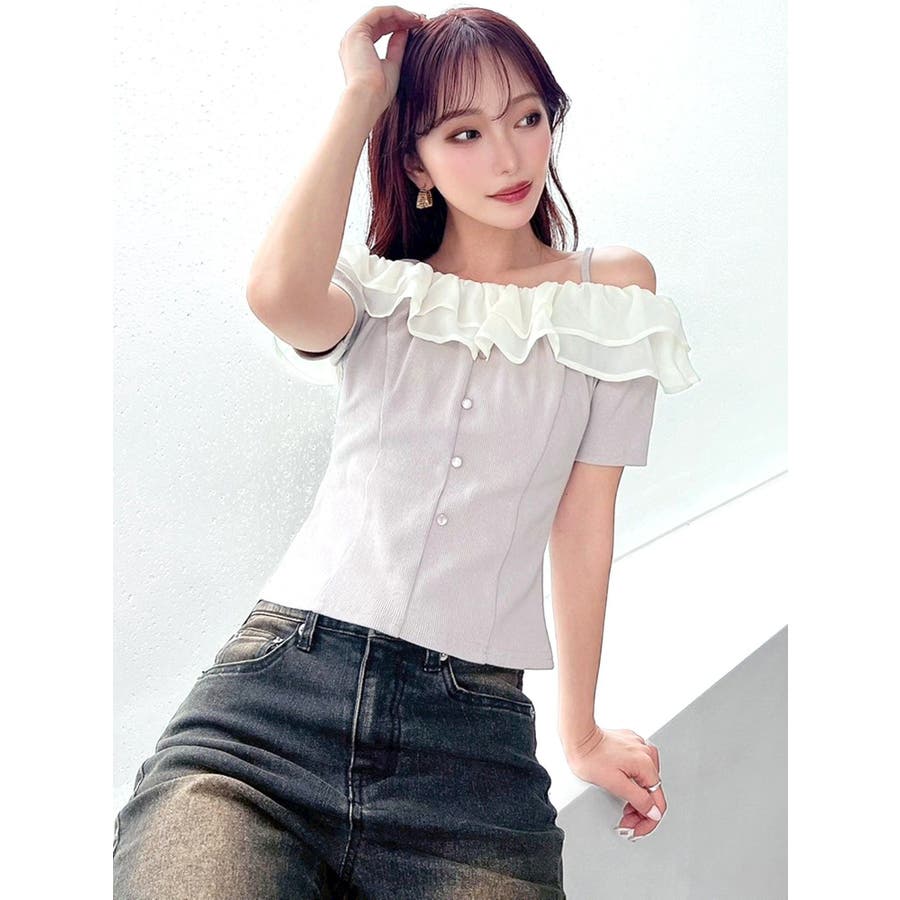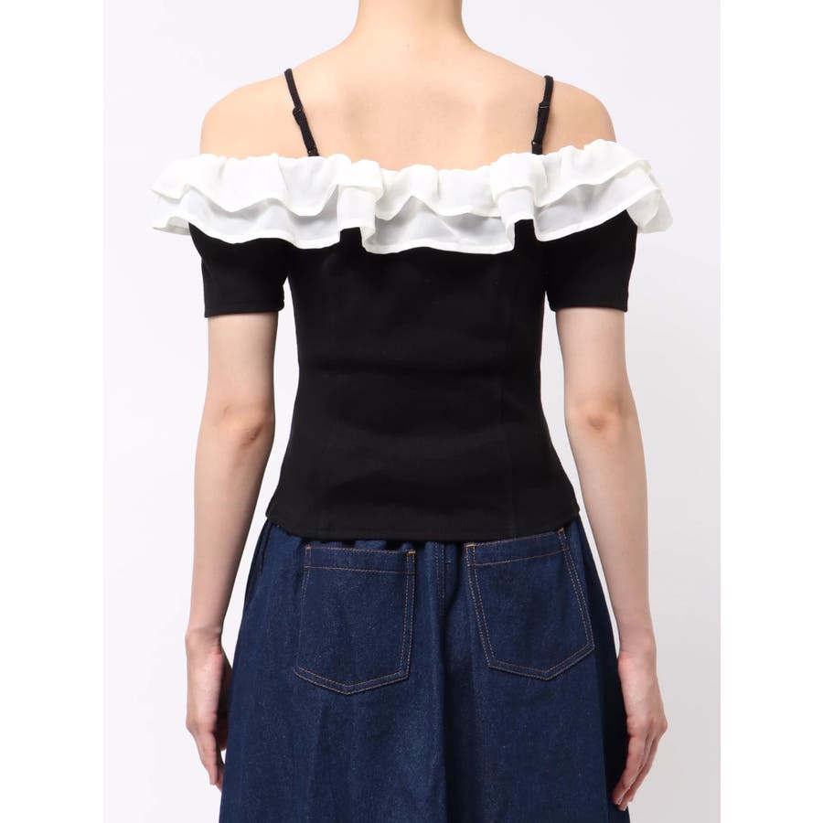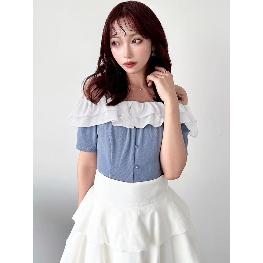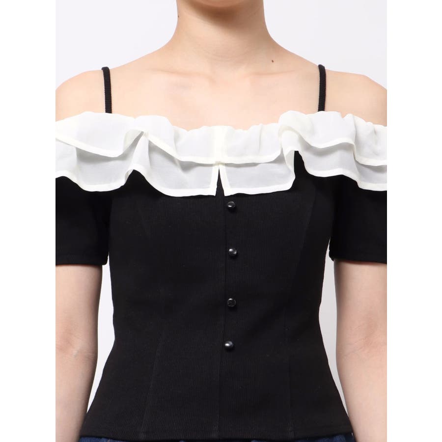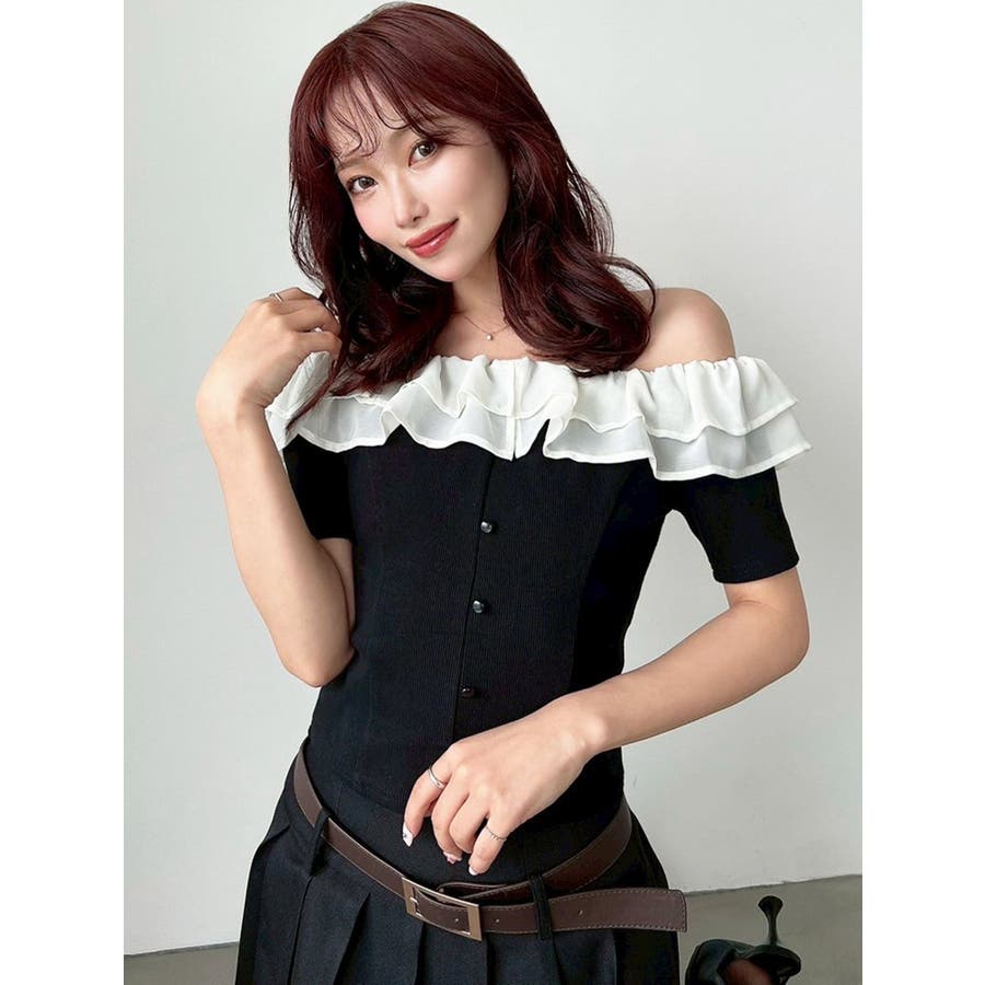 配色のフリルデザインがアクセントになるトップス▽デザイン▽カット素材のトップスに、シアー素材のフリルをドッキングした1枚。見頃はカット素材なので伸縮性があり、夏場でも涼し気に着用していただけます。半袖にしたことで二の腕周りのカバーもでき細見え効果抜群◎フリルは2段にしたことで程よいボリューム感とフェミニンさをプラスしました。オフショルデザインでデコルテや肩周りをすっきりと見せてくれます。▽カラー▽黒・青・ベージュの3色展開。▽スタイリング▽イン・アウトどちらでもすっきりと着用できるトップス。スカート合わせでフェミニンなコーデから、デニム合わせで韓国風のコーデもおすすめ!