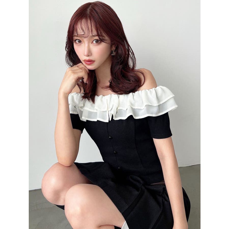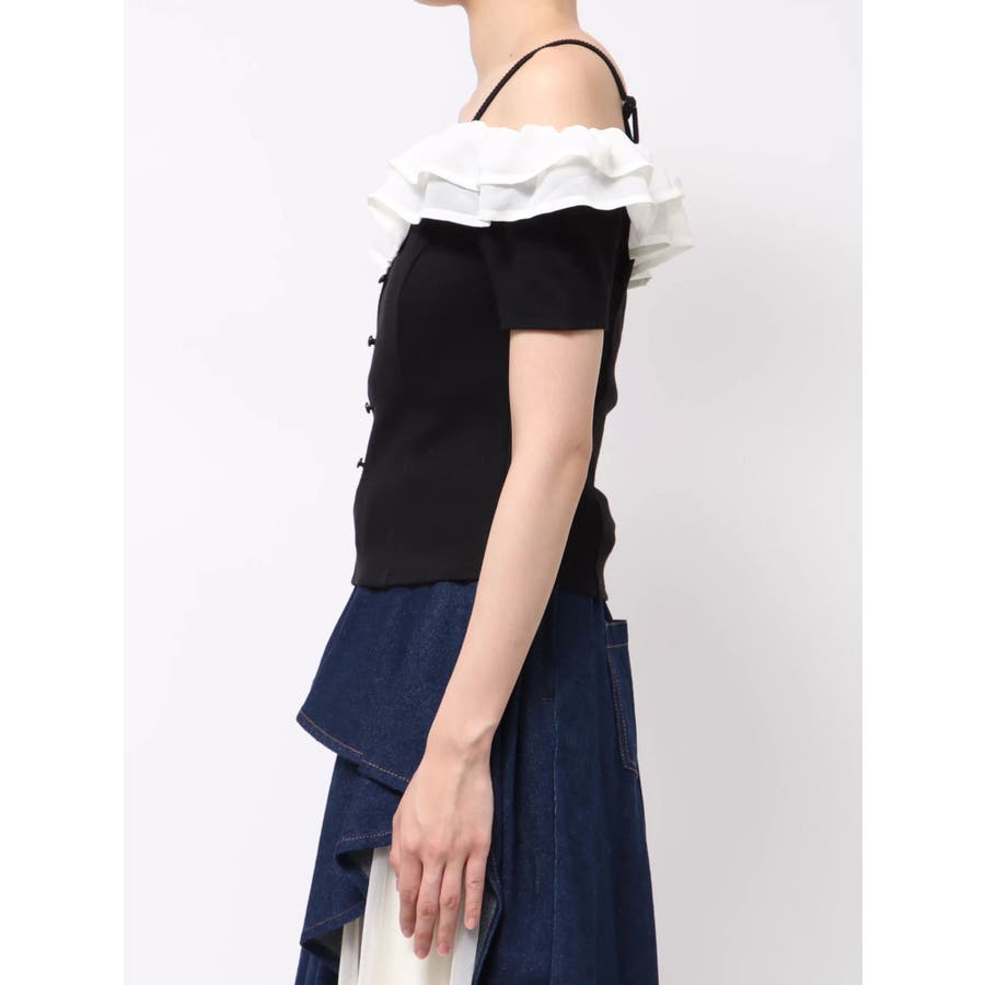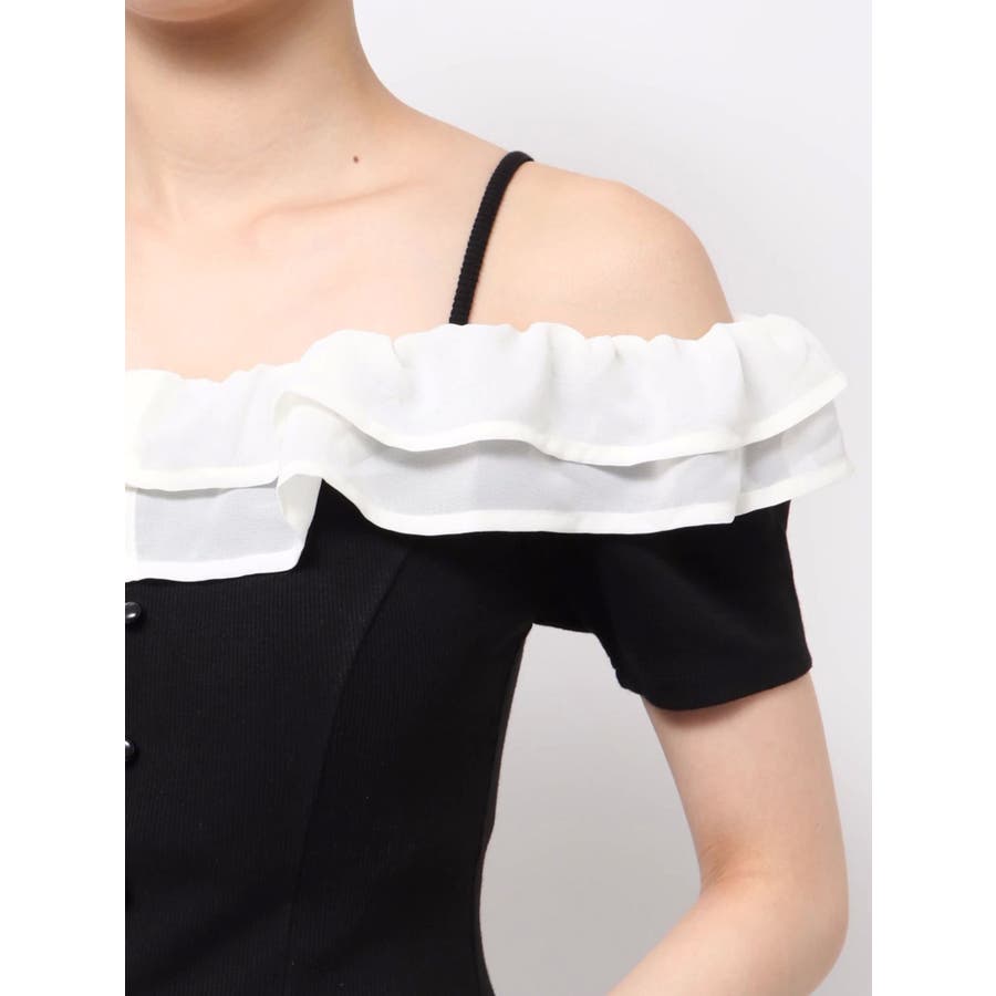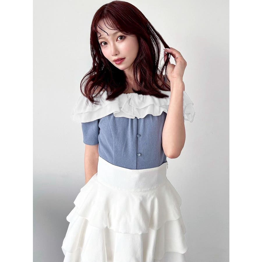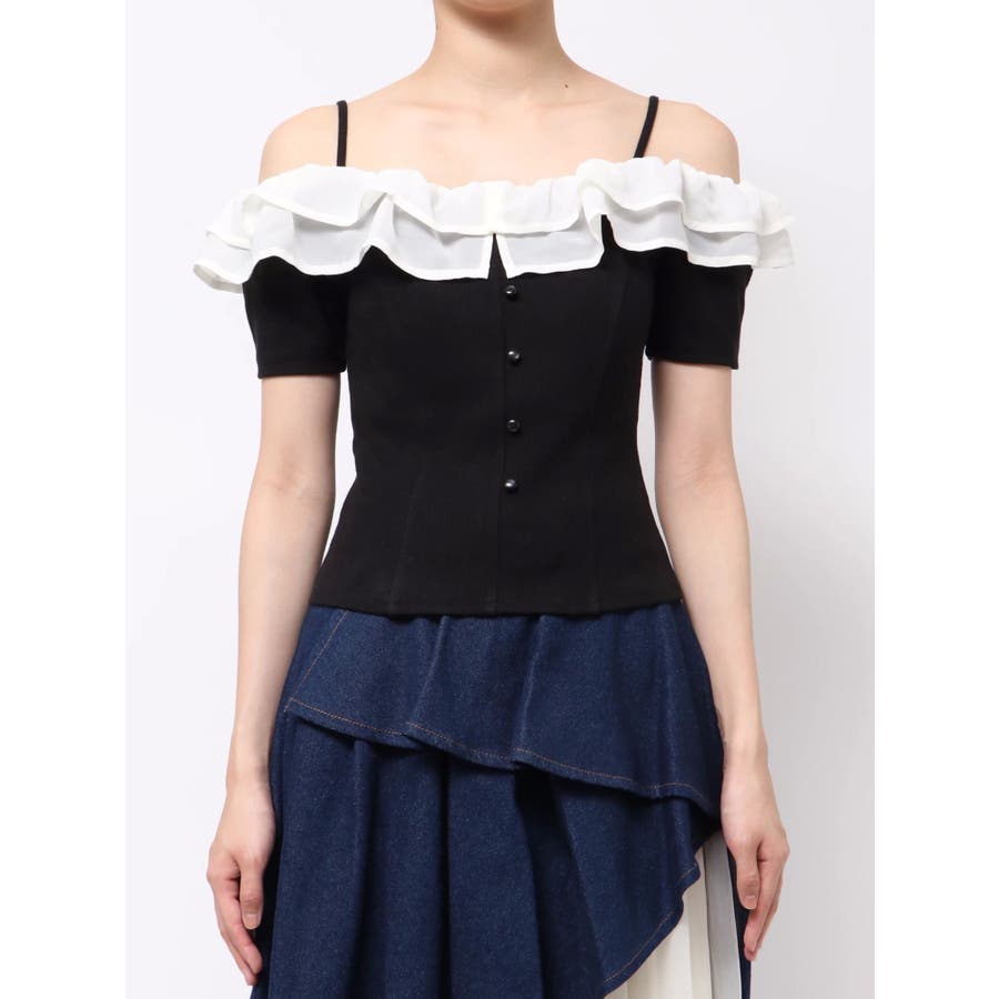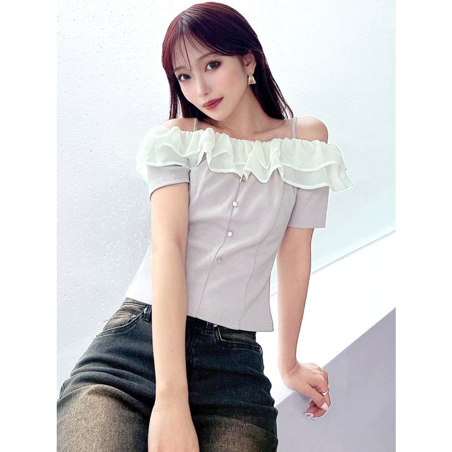 配色のフリルデザインがアクセントになるトップス▽デザイン▽カット素材のトップスに、シアー素材のフリルをドッキングした1枚。見頃はカット素材なので伸縮性があり、夏場でも涼し気に着用していただけます。半袖にしたことで二の腕周りのカバーもでき細見え効果抜群◎フリルは2段にしたことで程よいボリューム感とフェミニンさをプラスしました。オフショルデザインでデコルテや肩周りをすっきりと見せてくれます。▽カラー▽黒・青・ベージュの3色展開。▽スタイリング▽イン・アウトどちらでもすっきりと着用できるトップス。スカート合わせでフェミニンなコーデから、デニム合わせで韓国風のコーデもおすすめ!