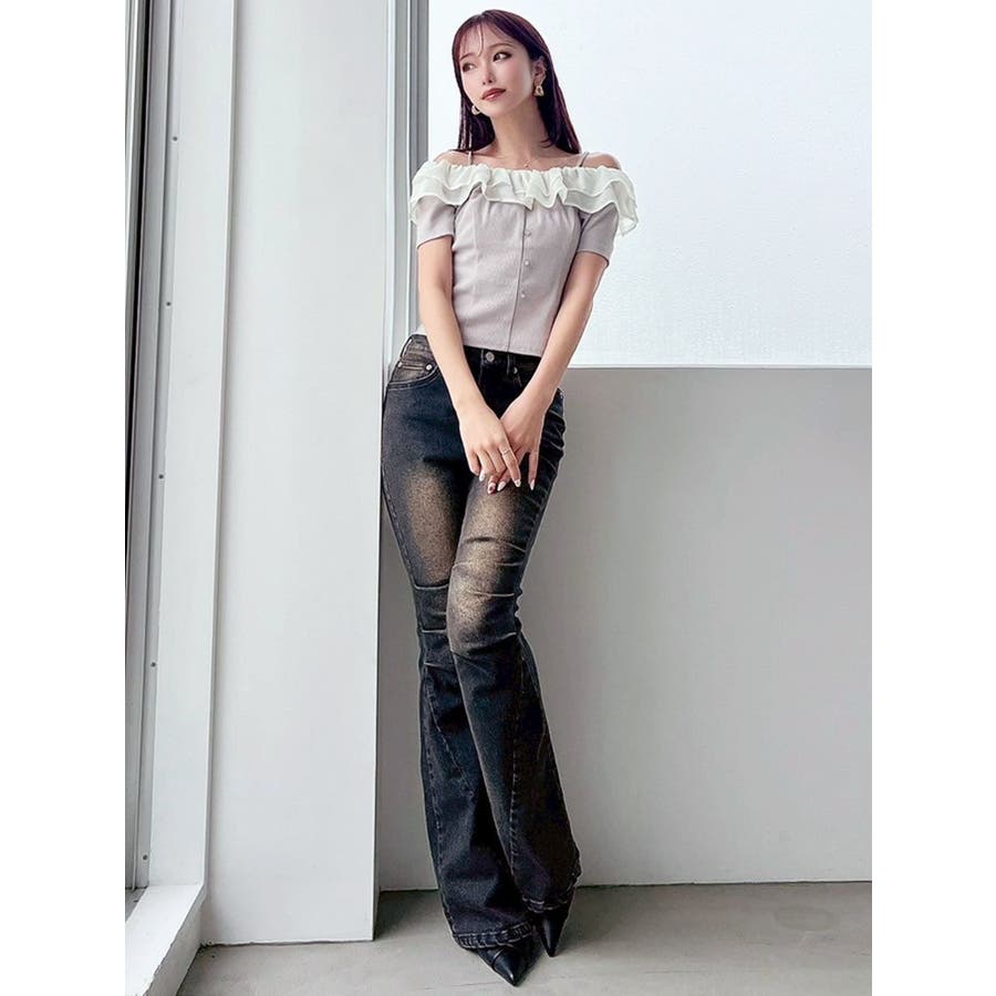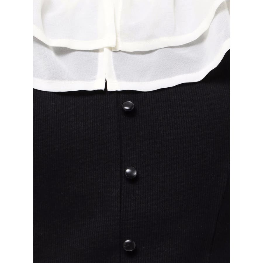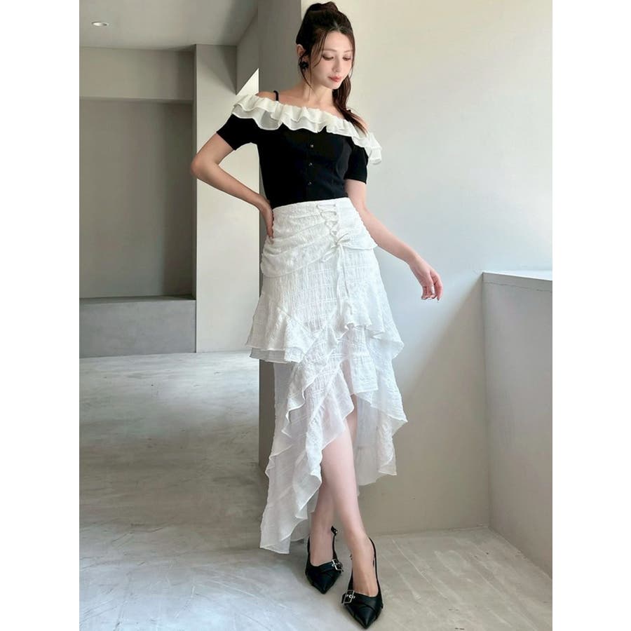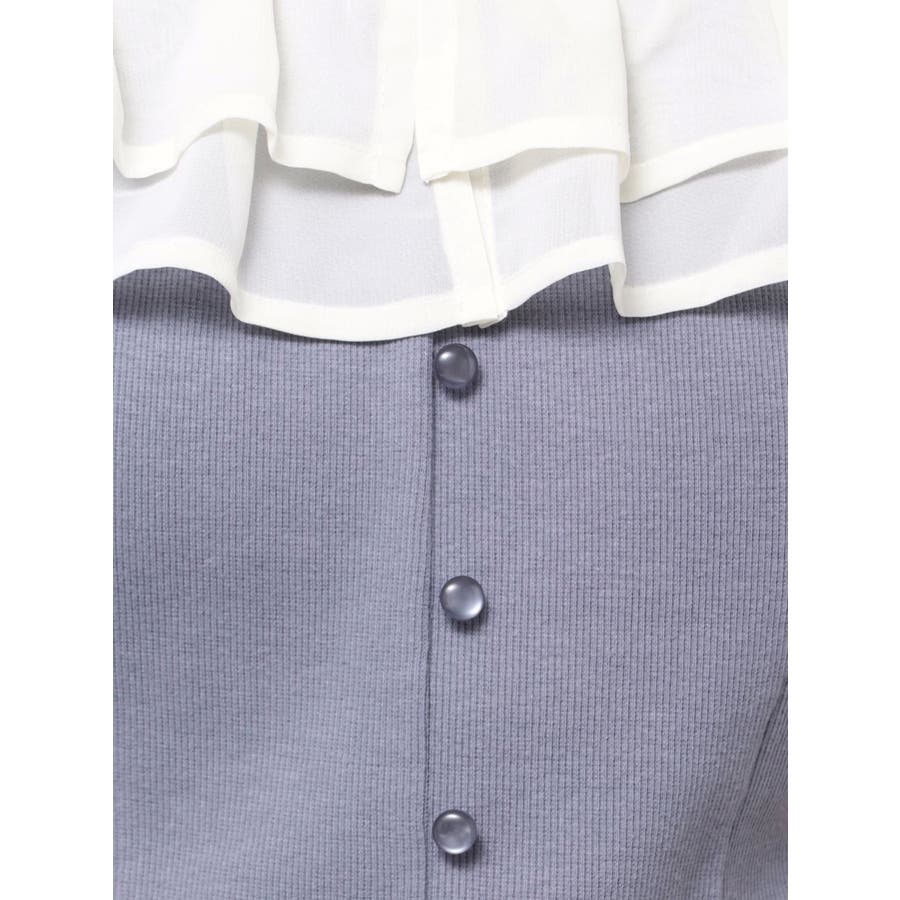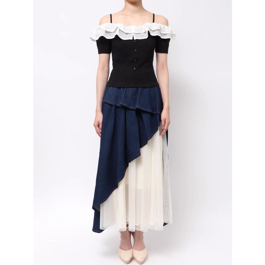 配色のフリルデザインがアクセントになるトップス▽デザイン▽カット素材のトップスに、シアー素材のフリルをドッキングした1枚。見頃はカット素材なので伸縮性があり、夏場でも涼し気に着用していただけます。半袖にしたことで二の腕周りのカバーもでき細見え効果抜群◎フリルは2段にしたことで程よいボリューム感とフェミニンさをプラスしました。オフショルデザインでデコルテや肩周りをすっきりと見せてくれます。▽カラー▽黒・青・ベージュの3色展開。▽スタイリング▽イン・アウトどちらでもすっきりと着用できるトップス。スカート合わせでフェミニンなコーデから、デニム合わせで韓国風のコーデもおすすめ!