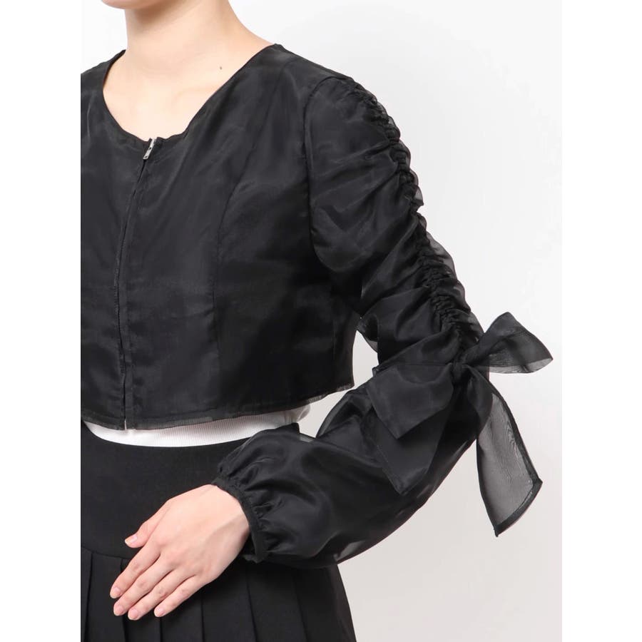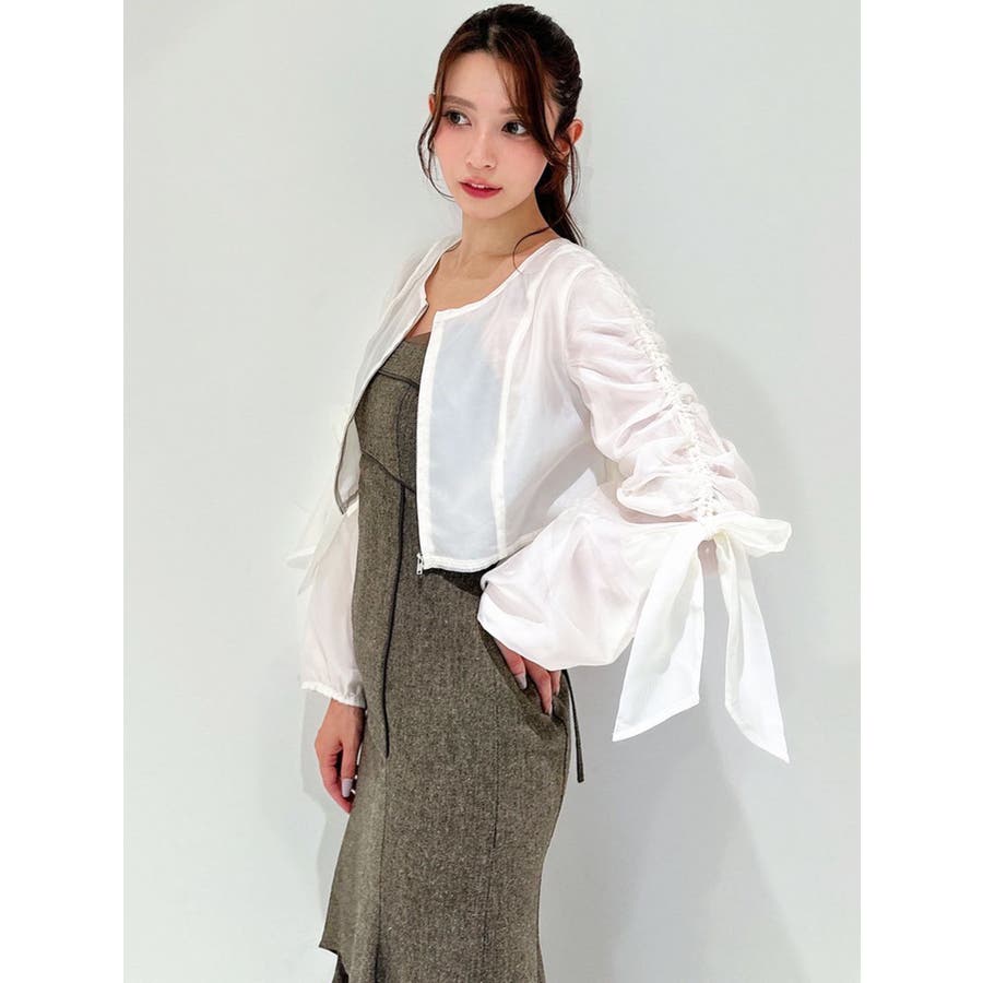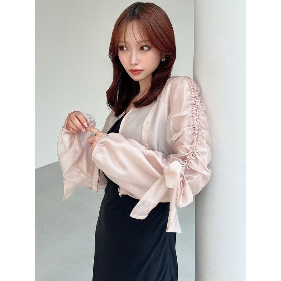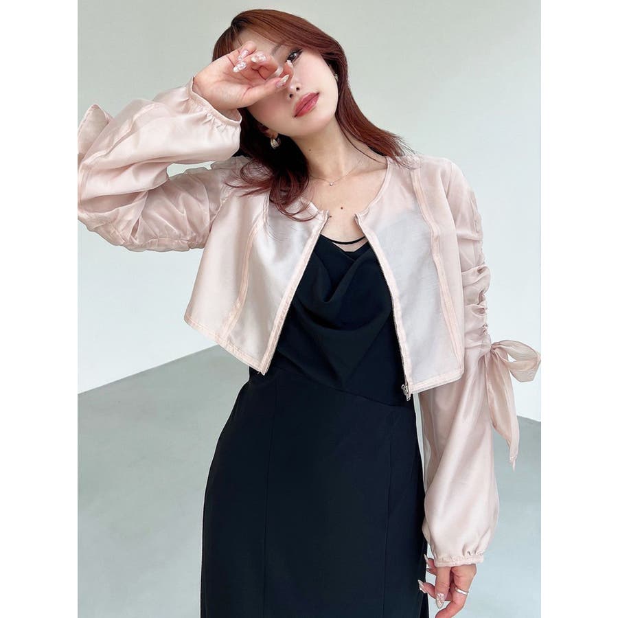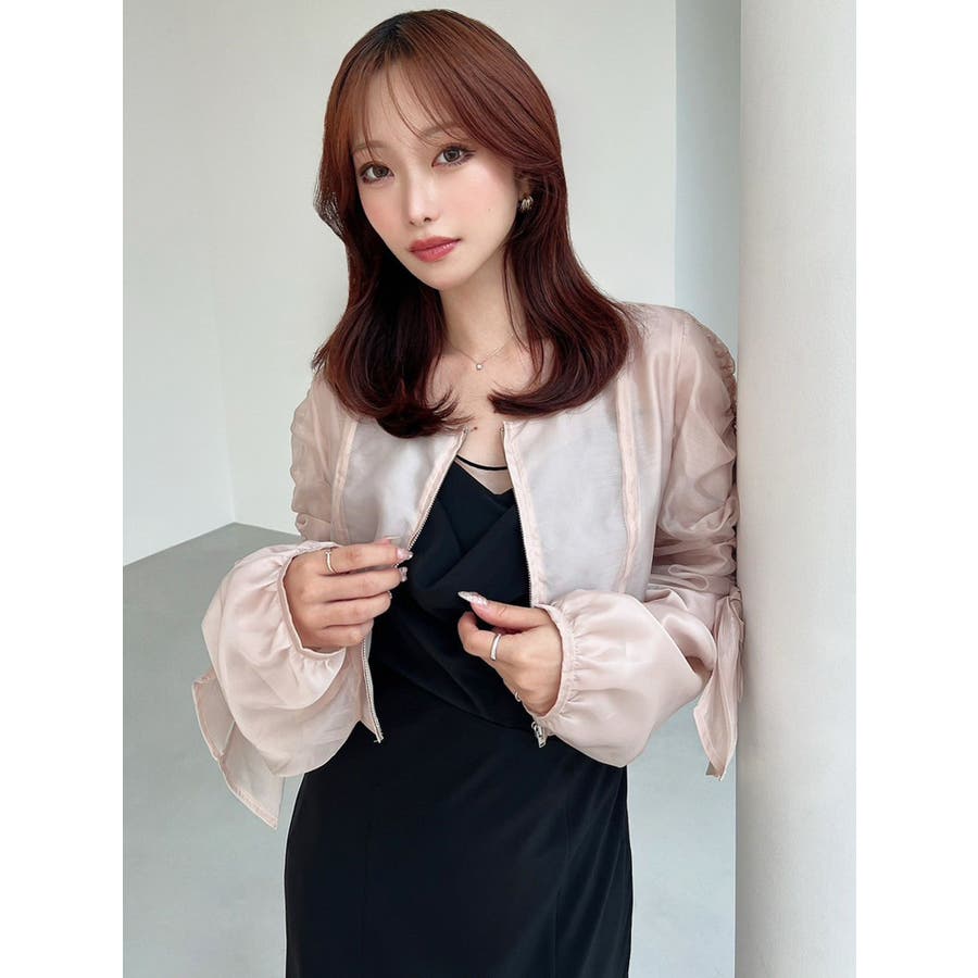 シアー素材×リボンディテールが目を惹くフェミニンブルゾン▽デザイン▽ほんのり光沢感のあるシアー素材が、上品さと抜け感を演出するショートブルゾン。袖にはたっぷりとギャザーを寄せてボリューム感を出しつつ、リボンディテールでフェミニンさをプラス。フロントはジップ仕様で、甘さの中にモード感もあるバランス良いアイテムに。トレンドのシアー感を取り入れつつ、周りと差がつくディテールが魅力の1枚です。▽カラー▽白・黒・ピンクの3色展開。▽スタイリング▽ョート丈なので、ハイウエストボトムと相性抜群◎スカートやパンツスタイルはもちろん、ワンピースの羽織りとしてもおすすめ。シアー素材なので重たくなく、秋口にかけてサラッと羽織れるアイテムです。※着用画像はフラッシュの加減で実際の製品と色味等が異なる場合がございますので、生地のズームアップ画像をご確認ください。※ご利用の端末画面の設定により実際の商品と色味が異なる場合がございます。【商品特徴】透け感:あり伸縮性:なし生地の厚さ:薄手サイズ感:普通裏地:ありポケット:なし