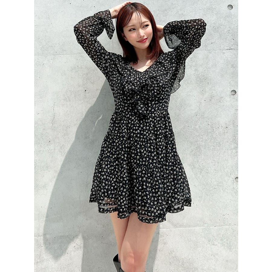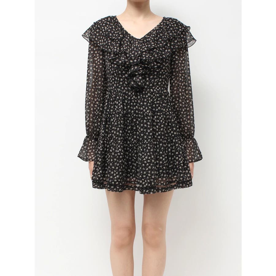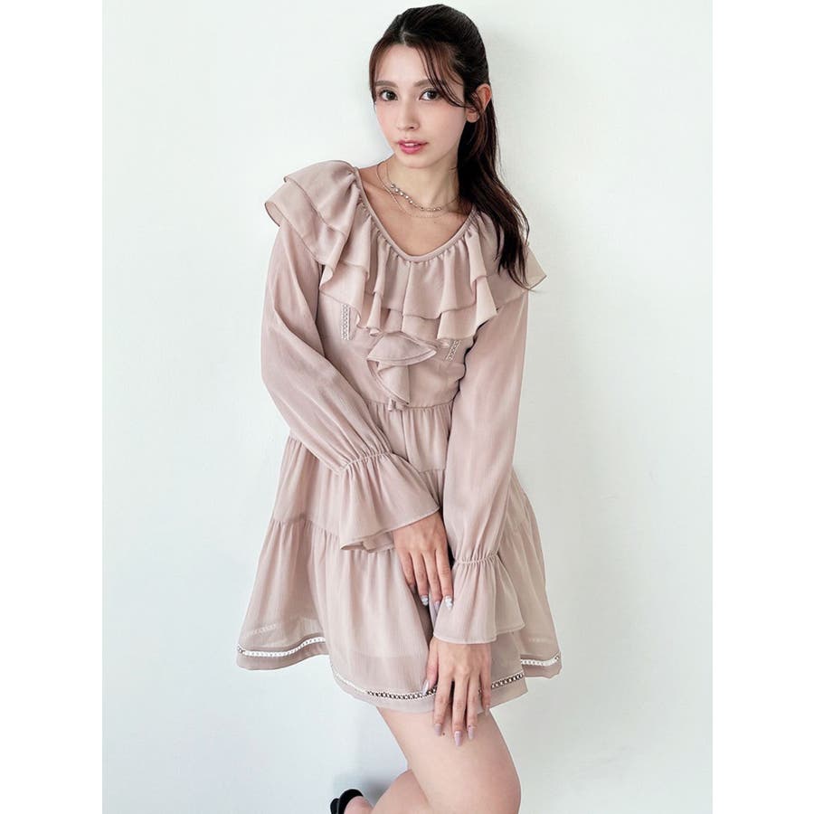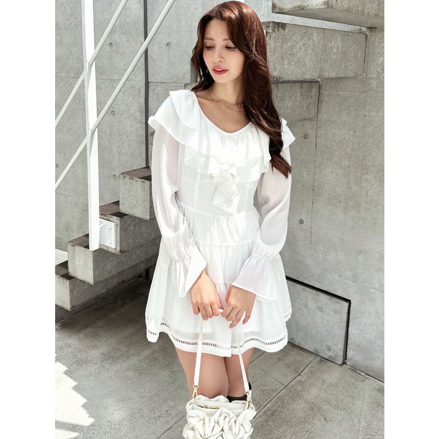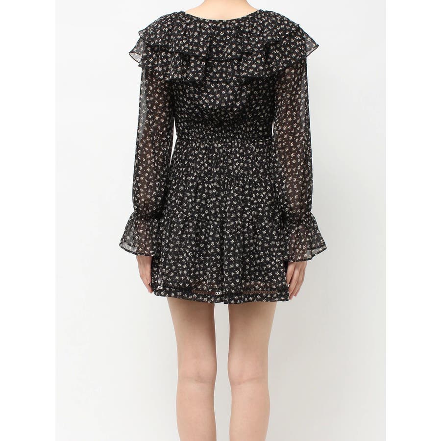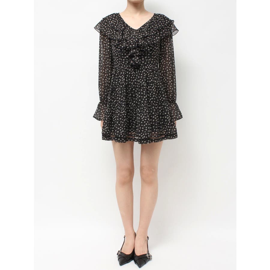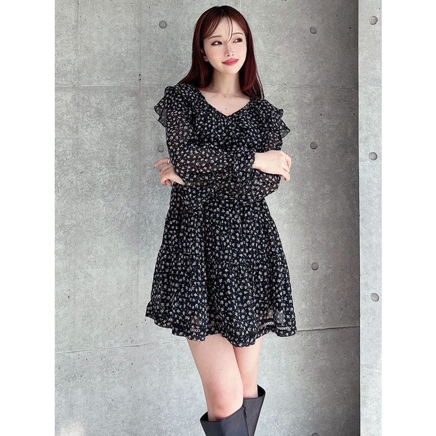 ラッフルデザインがポイントのミニワンピース▽デザイン▽シアー生地の透け感とふんわりしたシルエットで女性らしさUP!Vネックでデコルテはすっきりと見せつつ、ボリューム感のあるラッフルデザインが際立ち顔回りを華やかに。ウエストラインはタイトに見せることで裾に向かって広がるフレアシルエットがメリハリがあるバランスの取れたコーデに仕上げます。はしごレースがさりげなくデザイン性をプラス。▽カラー▽白・黒・ベージュの3色展開。白・ベージュは無地で、黒は小花柄で仕上げました♪▽スタイリング▽1枚でサラッと着れて、秋や春など季節の変わり目に重宝します。レザージャケットを合わせた甘辛MIXなコーデがおすすめ◎※着用画像はフラッシュの加減で実際の製品と色味等が異なる場合がございますので、生地のズームアップ画像をご確認ください。※ご利用の端末画面の設定により実際の商品と色味が異なる場合がございます。【商品特徴】透け感:(袖)あり伸縮性:なし生地の厚さ:薄手サイズ感:普通裏地:ありポケット:なしファスナー:あり(横)