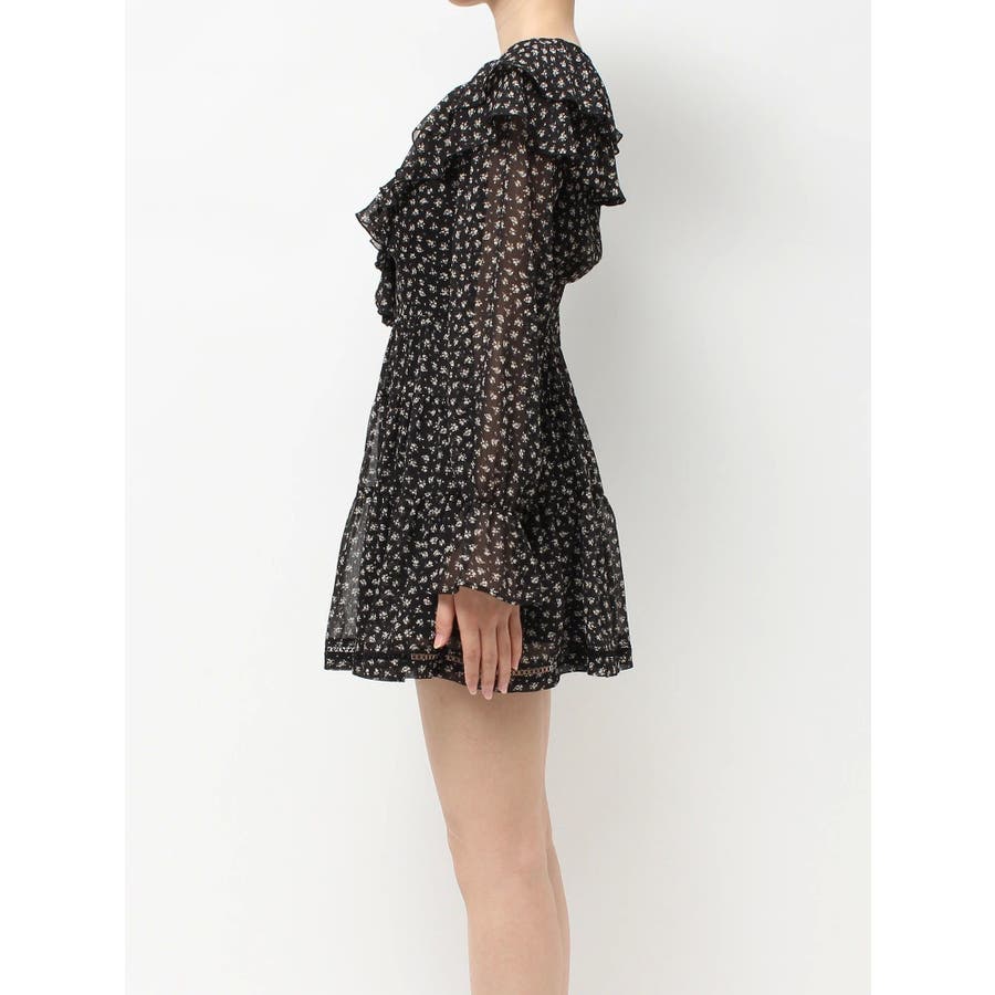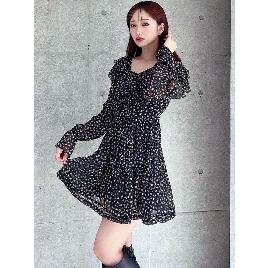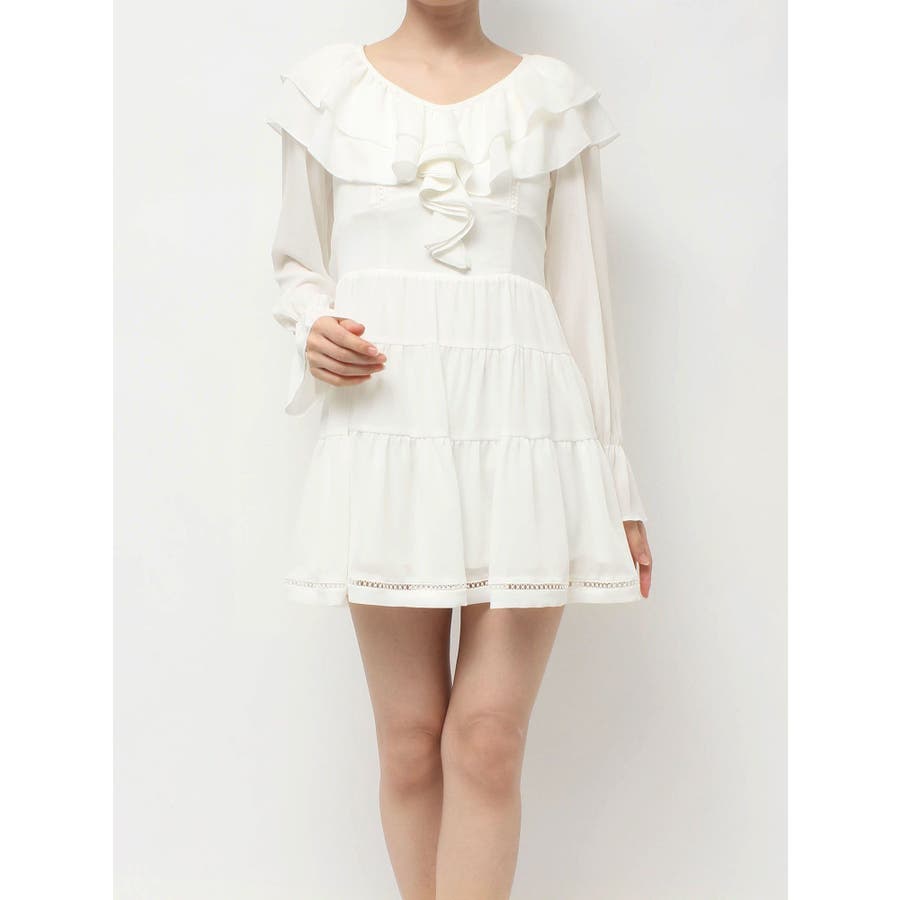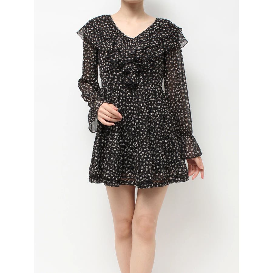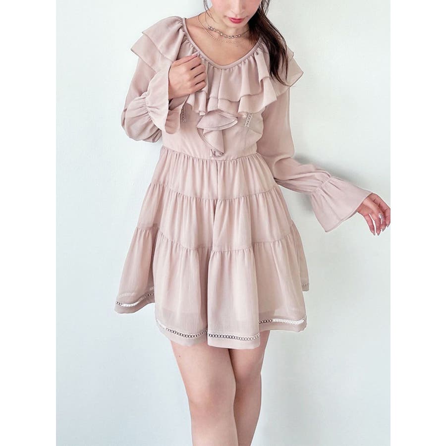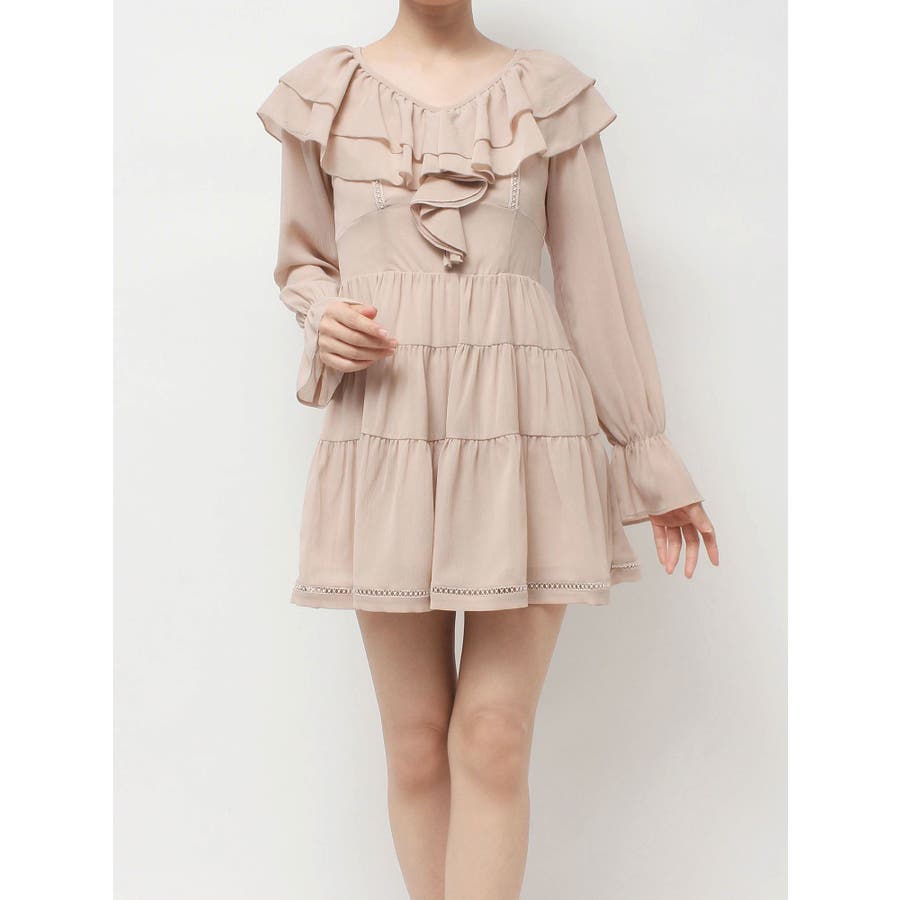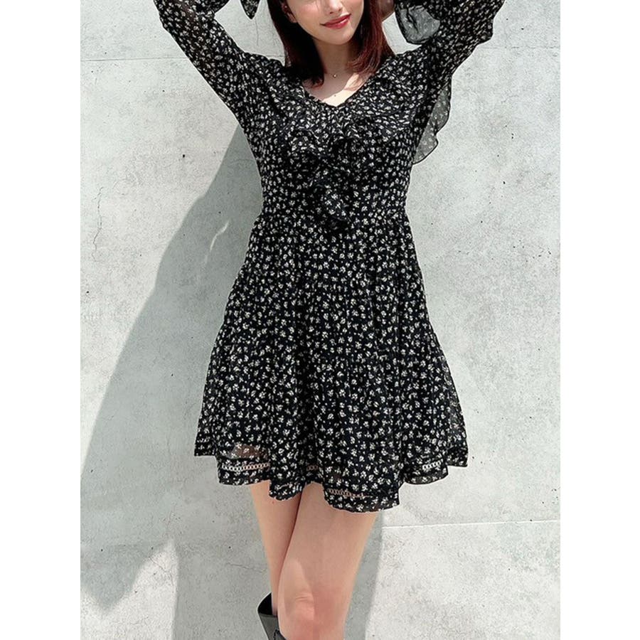 ラッフルデザインがポイントのミニワンピース▽デザイン▽シアー生地の透け感とふんわりしたシルエットで女性らしさUP!Vネックでデコルテはすっきりと見せつつ、ボリューム感のあるラッフルデザインが際立ち顔回りを華やかに。ウエストラインはタイトに見せることで裾に向かって広がるフレアシルエットがメリハリがあるバランスの取れたコーデに仕上げます。はしごレースがさりげなくデザイン性をプラス。▽カラー▽白・黒・ベージュの3色展開。白・ベージュは無地で、黒は小花柄で仕上げました♪▽スタイリング▽1枚でサラッと着れて、秋や春など季節の変わり目に重宝します。レザージャケットを合わせた甘辛MIXなコーデがおすすめ◎※着用画像はフラッシュの加減で実際の製品と色味等が異なる場合がございますので、生地のズームアップ画像をご確認ください。※ご利用の端末画面の設定により実際の商品と色味が異なる場合がございます。【商品特徴】透け感:(袖)あり伸縮性:なし生地の厚さ:薄手サイズ感:普通裏地:ありポケット:なしファスナー:あり(横)