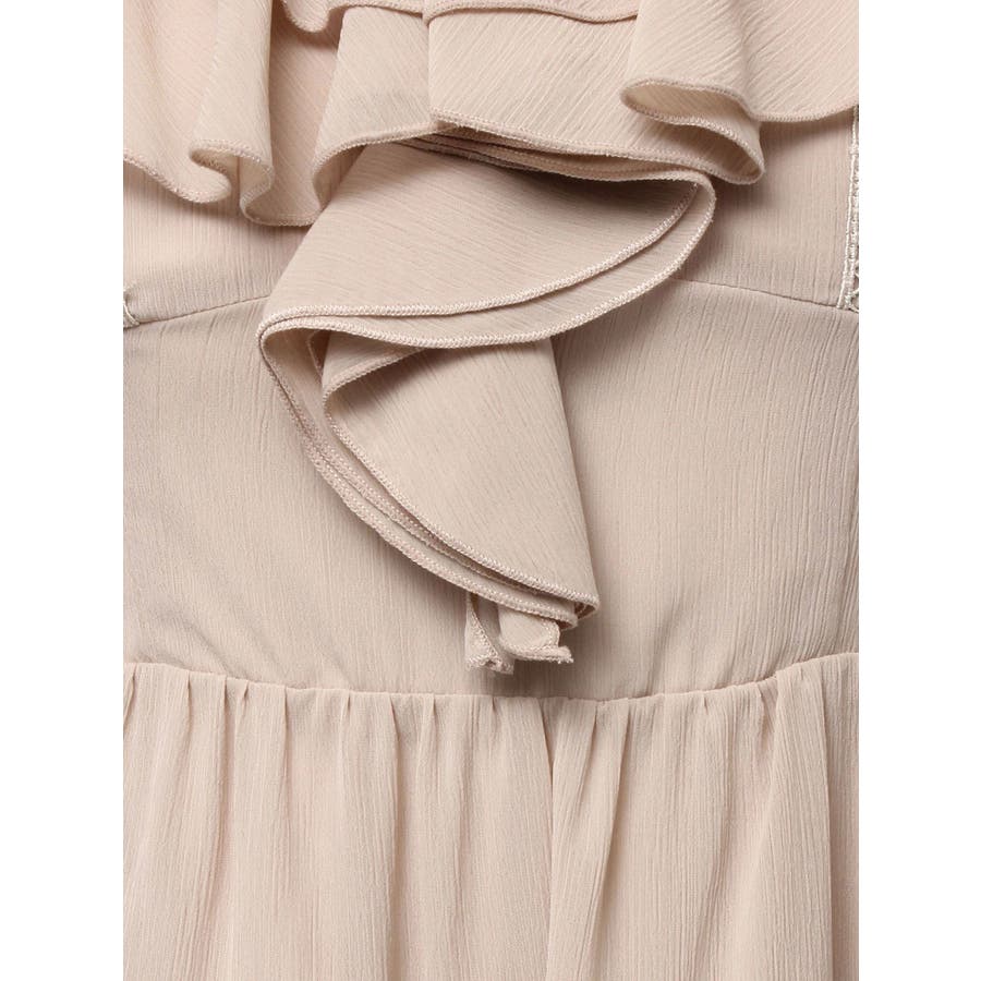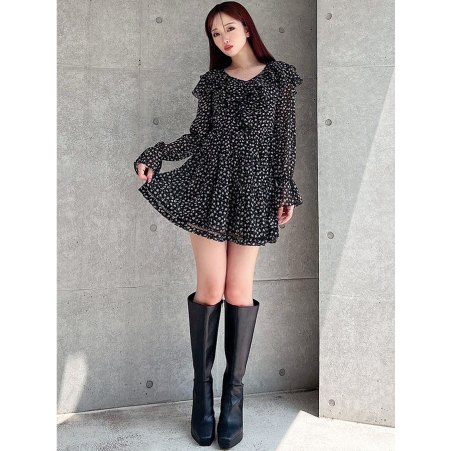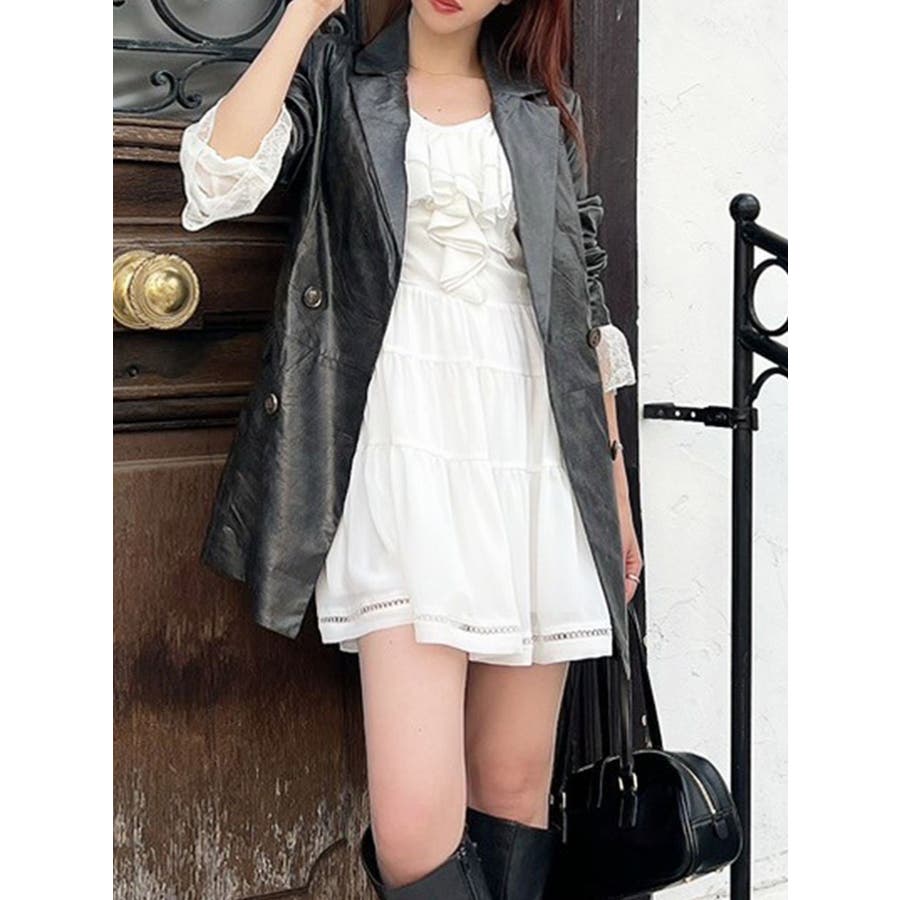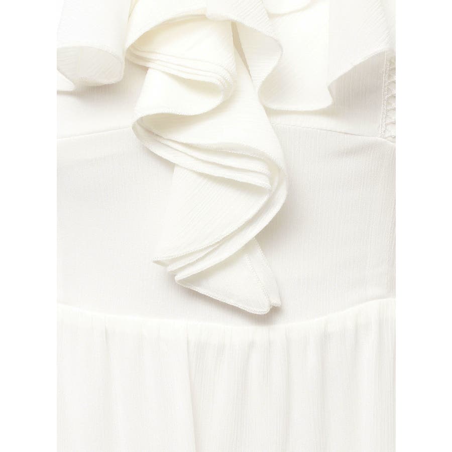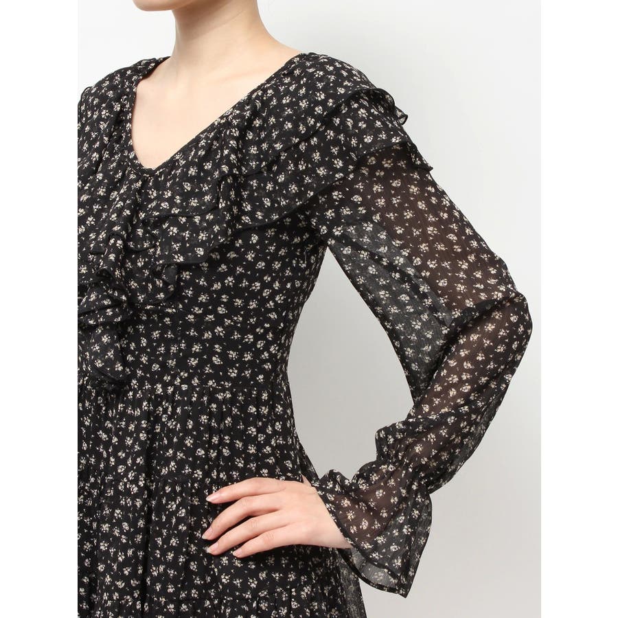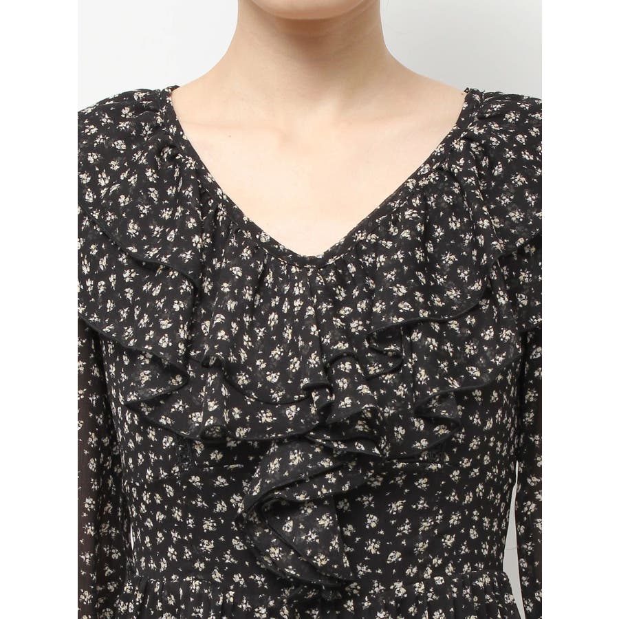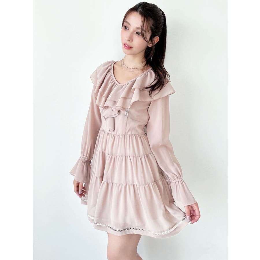 ラッフルデザインがポイントのミニワンピース▽デザイン▽シアー生地の透け感とふんわりしたシルエットで女性らしさUP!Vネックでデコルテはすっきりと見せつつ、ボリューム感のあるラッフルデザインが際立ち顔回りを華やかに。ウエストラインはタイトに見せることで裾に向かって広がるフレアシルエットがメリハリがあるバランスの取れたコーデに仕上げます。はしごレースがさりげなくデザイン性をプラス。▽カラー▽白・黒・ベージュの3色展開。白・ベージュは無地で、黒は小花柄で仕上げました♪▽スタイリング▽1枚でサラッと着れて、秋や春など季節の変わり目に重宝します。レザージャケットを合わせた甘辛MIXなコーデがおすすめ◎※着用画像はフラッシュの加減で実際の製品と色味等が異なる場合がございますので、生地のズームアップ画像をご確認ください。※ご利用の端末画面の設定により実際の商品と色味が異なる場合がございます。【商品特徴】透け感:(袖)あり伸縮性:なし生地の厚さ:薄手サイズ感:普通裏地:ありポケット:なしファスナー:あり(横)