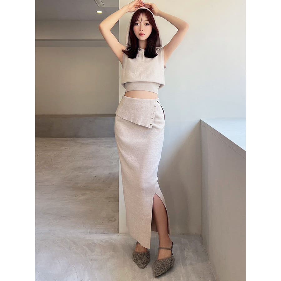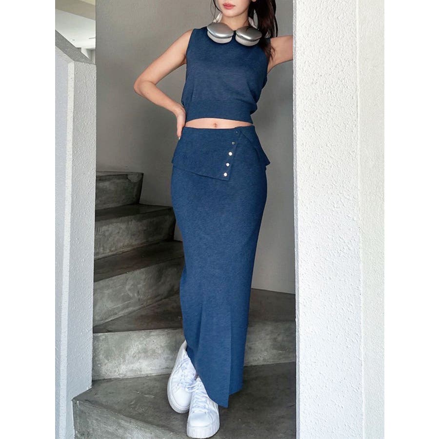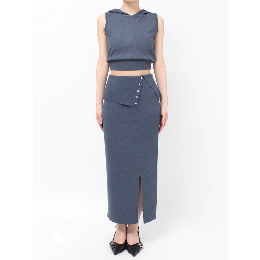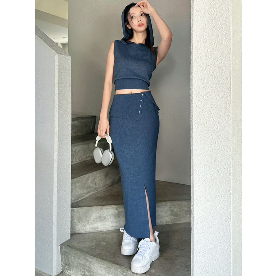ウエストの折り返しデザインがポイントのタイトスカート▽デザイン▽サラッとした肌ざわりで厚手過ぎないニットなので晩夏でも爽やかに着用いただけます。ウエストの折り返しデザインと小ぶりのゴールドボタンがアクセントに。スリット入りでタイトシルエットながら足さばきも良く、伸縮性のあるニットで着心地の良いアイテムです。▽カラー▽青・チャコールグレー・ベージュの3色展開。▽スタイリング▽同色のニットトップスを合わせればセットアップとして着用可能◎ハイウエストでウエストデザインのあるスカートなのでクロップド丈のコンパクトなトップス合わせがおすすめです!スニーカーでカジュアルダウンしたコーデもおすすめ!【セットアップアイテムはコチラ】152552612401:フーディーノースリニットトップス