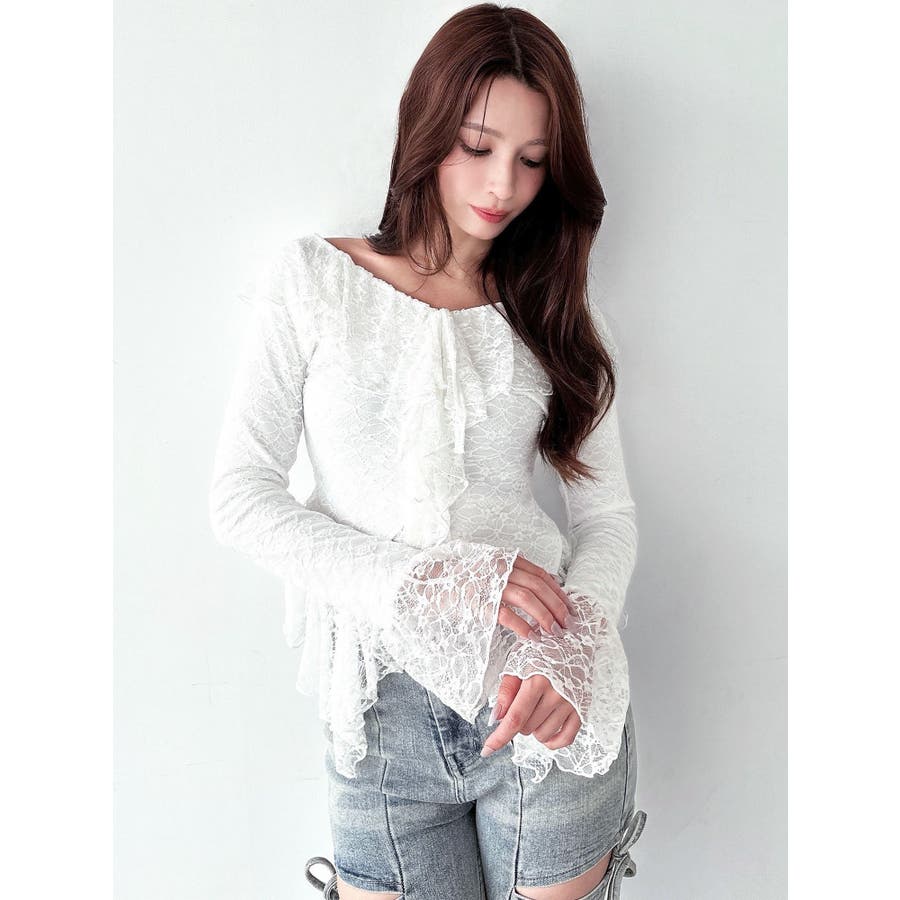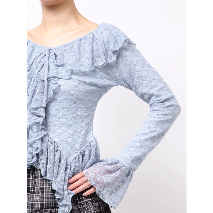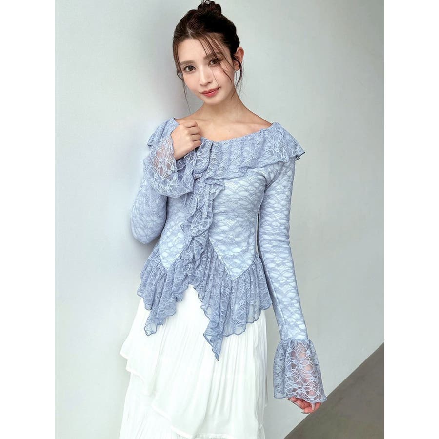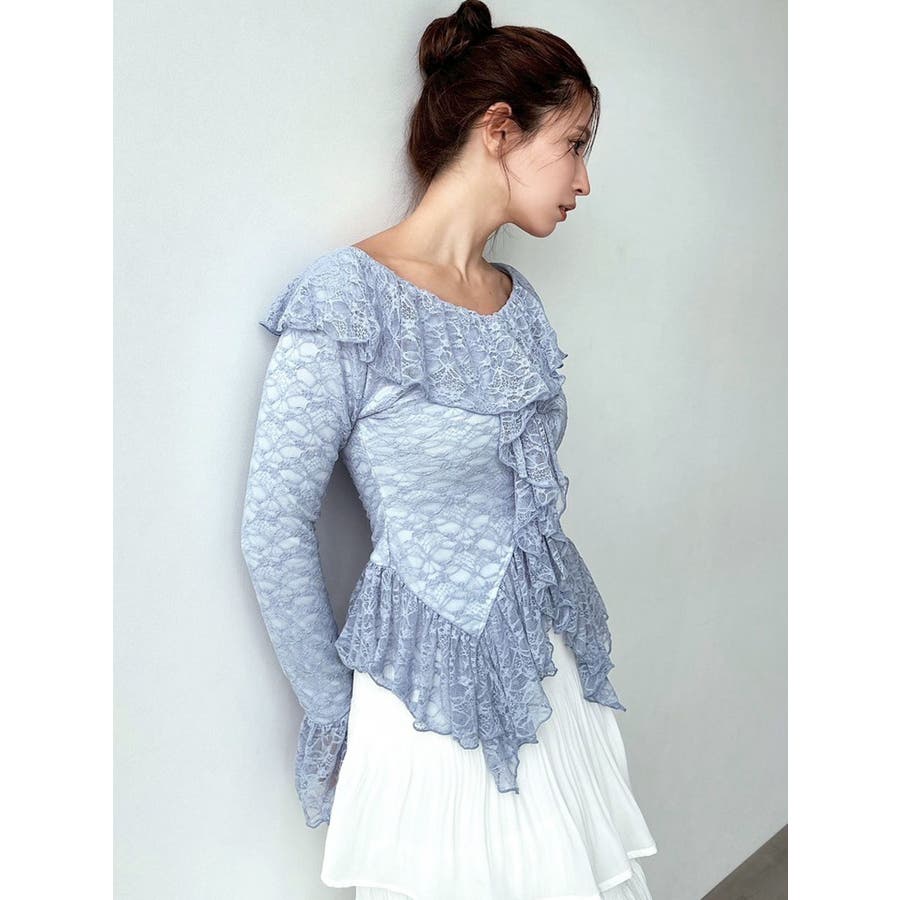 トレンド感満載のレースブラウスが登場!▽デザイン▽ボリューム感のあるラッフルとレース生地の組み合わせでデコラティブなデザインブラウスを作りました。襟ぐりのラッフルデザインで顔周りが華やかな印象に♪ウエストラインはタイトに見せ、裾と袖口のレースやデザインが女性らしさを惹きたてます。生地はストレッチが効いているので着心地も抜群な1着です。▽カラー▽白・黒・青の3色展開。▽スタイリング▽アウトスタイリングで、デニムやスカートに合わせるだけでトレンド感のある韓国風のキレイ目コーデが完成!アウターにも響かないので春先までロングシーズン活躍します。※着用画像はフラッシュの加減で実際の製品と色味等が異なる場合がございますので、生地のズームアップ画像をご確認ください。※ご利用の端末画面の設定により実際の商品と色味が異なる場合がございます。【商品特徴】透け感:なし伸縮性:あり生地の厚さ:普通サイズ感:普通裏地:なしポケット:なし