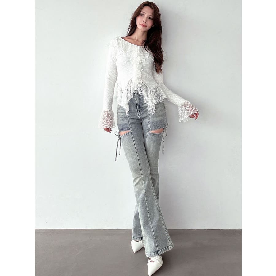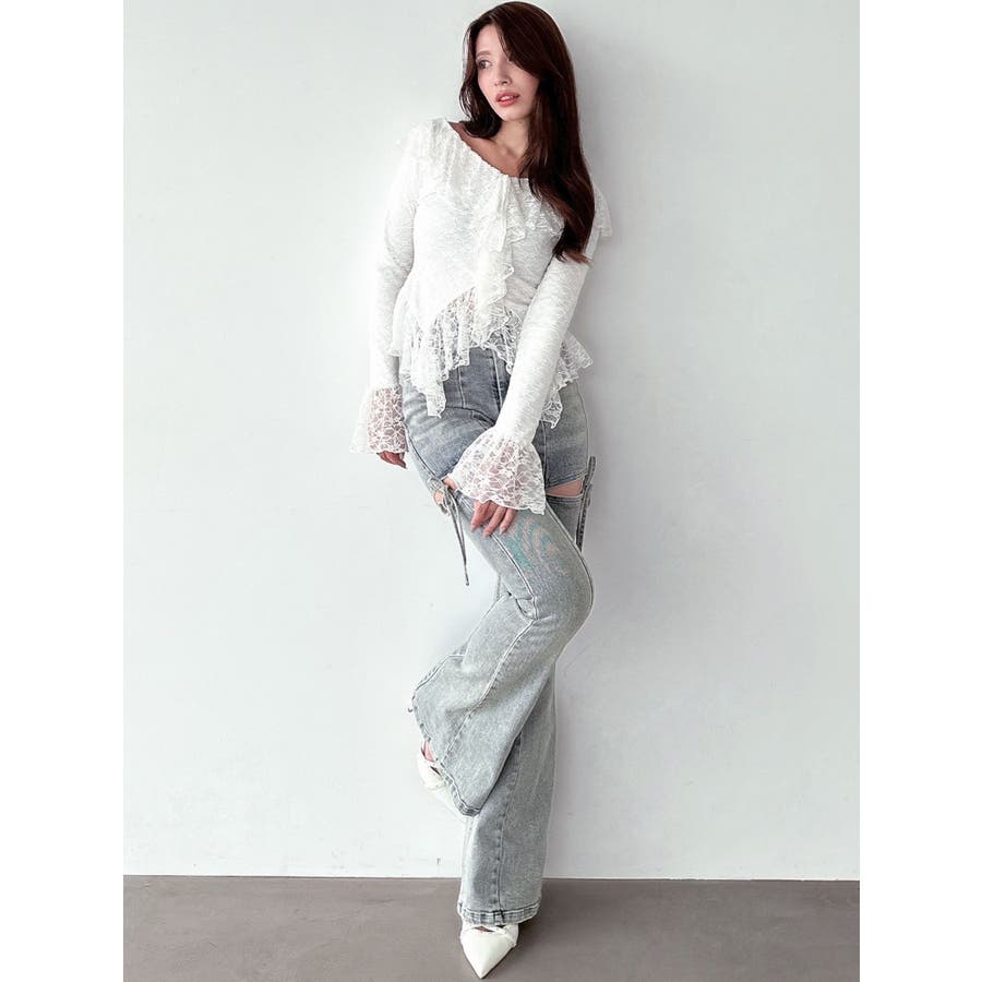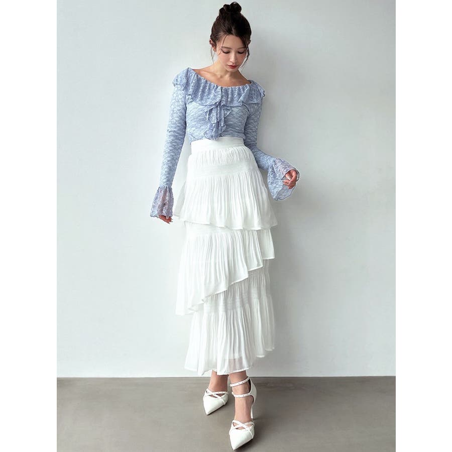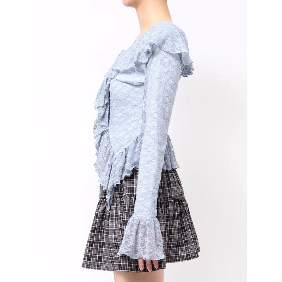 トレンド感満載のレースブラウスが登場!▽デザイン▽ボリューム感のあるラッフルとレース生地の組み合わせでデコラティブなデザインブラウスを作りました。襟ぐりのラッフルデザインで顔周りが華やかな印象に♪ウエストラインはタイトに見せ、裾と袖口のレースやデザインが女性らしさを惹きたてます。生地はストレッチが効いているので着心地も抜群な1着です。▽カラー▽白・黒・青の3色展開。▽スタイリング▽アウトスタイリングで、デニムやスカートに合わせるだけでトレンド感のある韓国風のキレイ目コーデが完成!アウターにも響かないので春先までロングシーズン活躍します。※着用画像はフラッシュの加減で実際の製品と色味等が異なる場合がございますので、生地のズームアップ画像をご確認ください。※ご利用の端末画面の設定により実際の商品と色味が異なる場合がございます。【商品特徴】透け感:なし伸縮性:あり生地の厚さ:普通サイズ感:普通裏地:なしポケット:なし