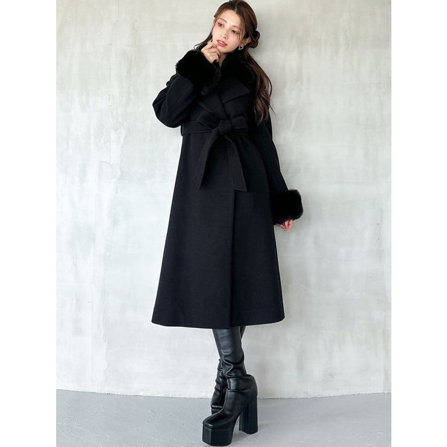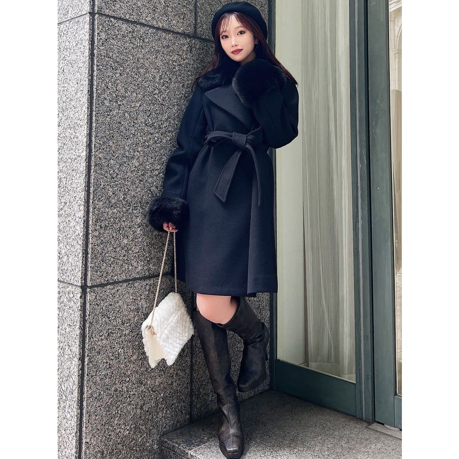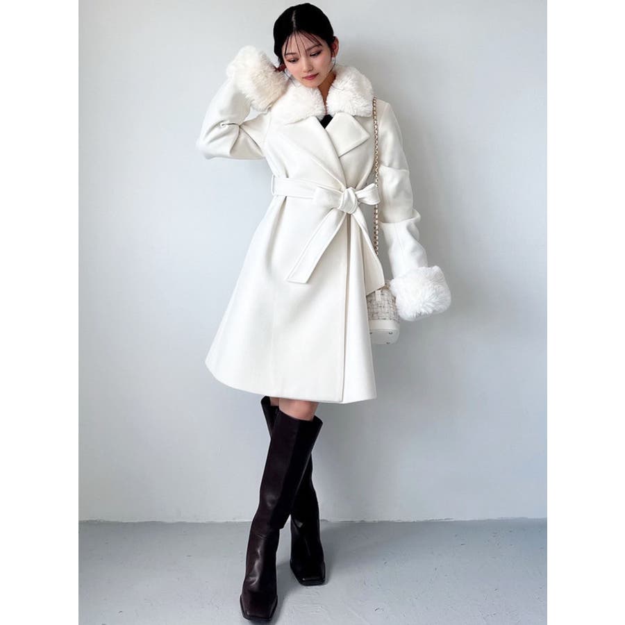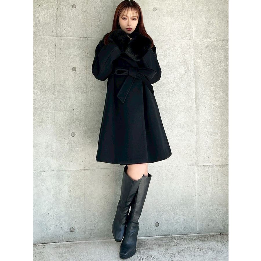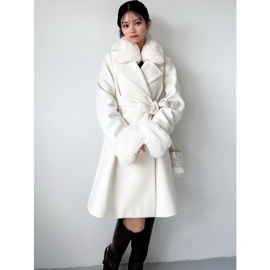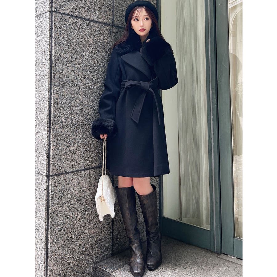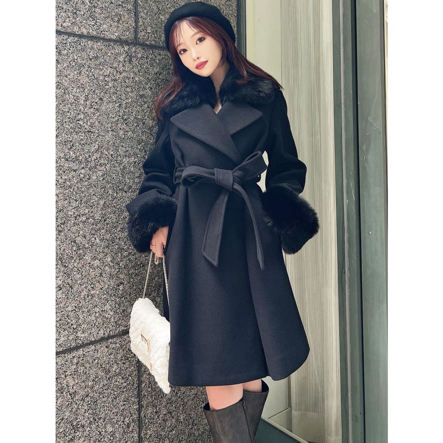 ワンピースのようなAラインシルエットが女性らしいキレイ目コート。襟と袖口のフェイクファーは肌触りの良いものを使用し大きめの襟で小顔効果も叶う、高級感溢れるコート。