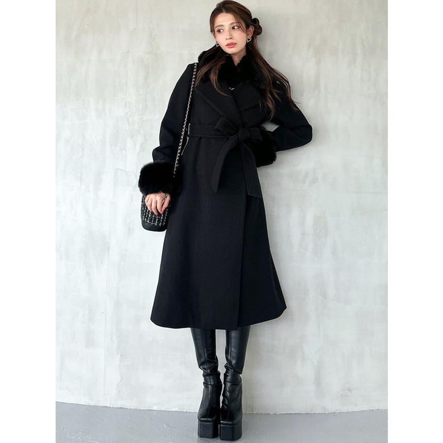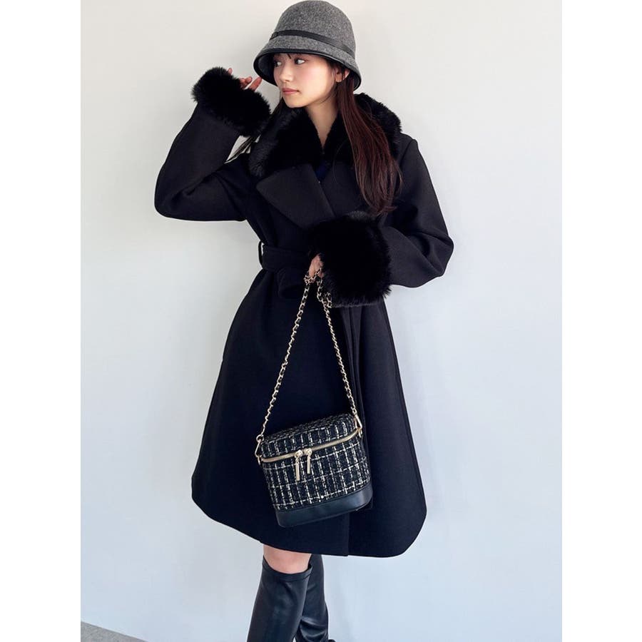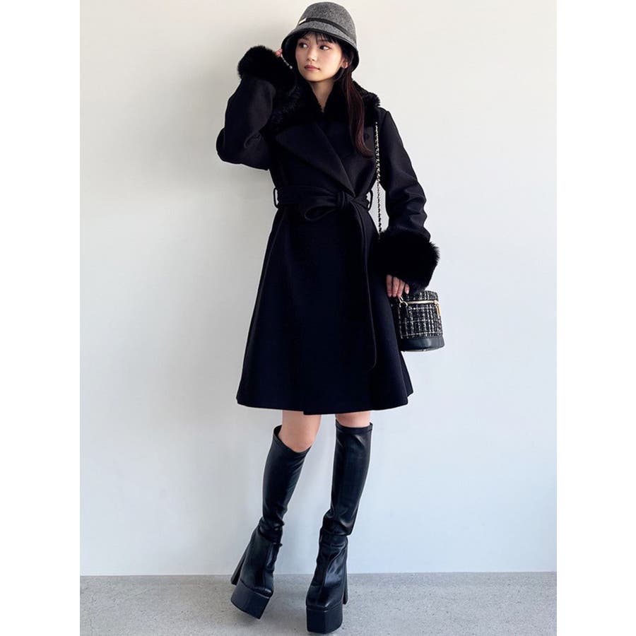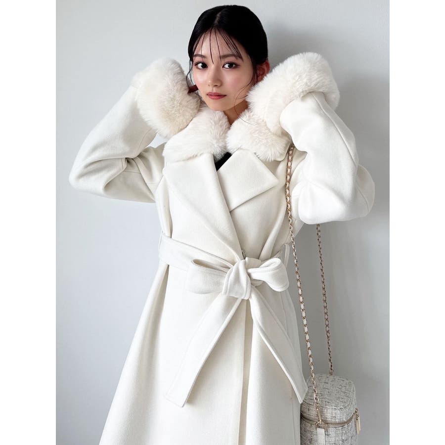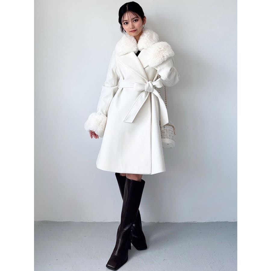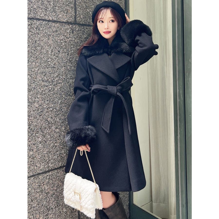 ワンピースのようなAラインシルエットが女性らしいキレイ目コート。襟と袖口のフェイクファーは肌触りの良いものを使用し大きめの襟で小顔効果も叶う、高級感溢れるコート。
