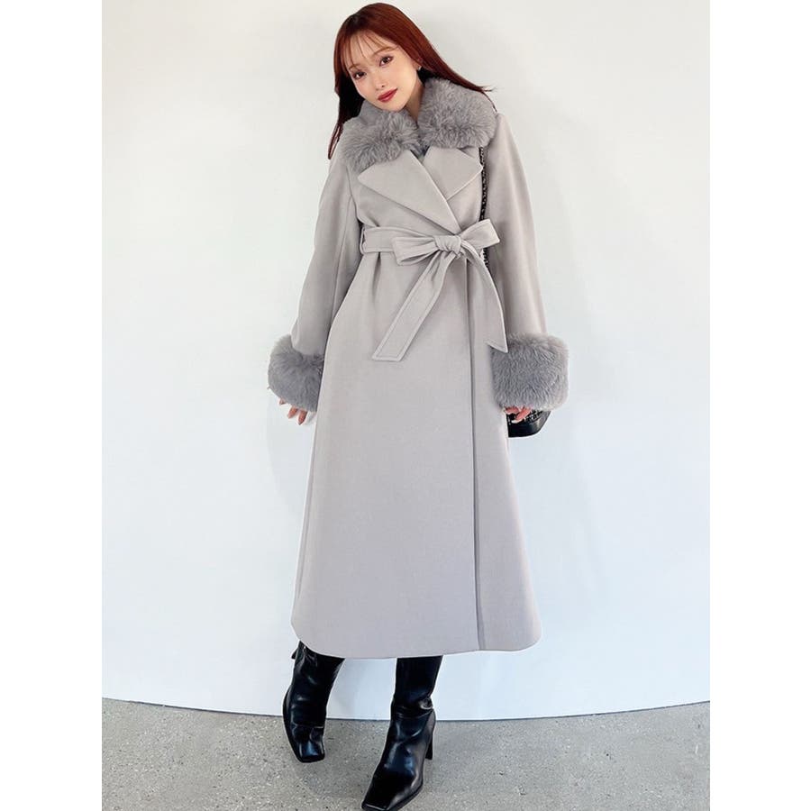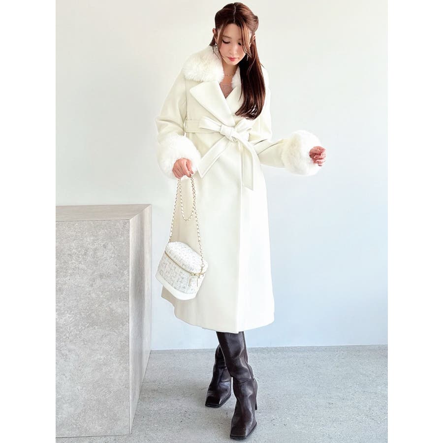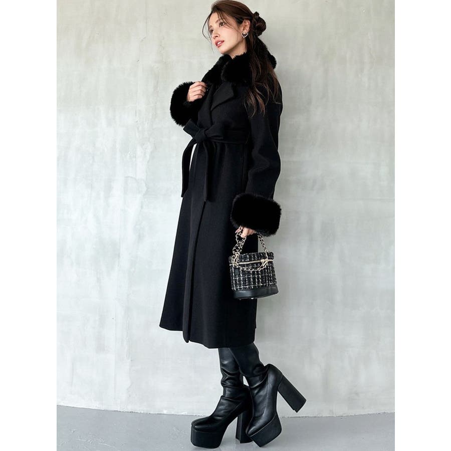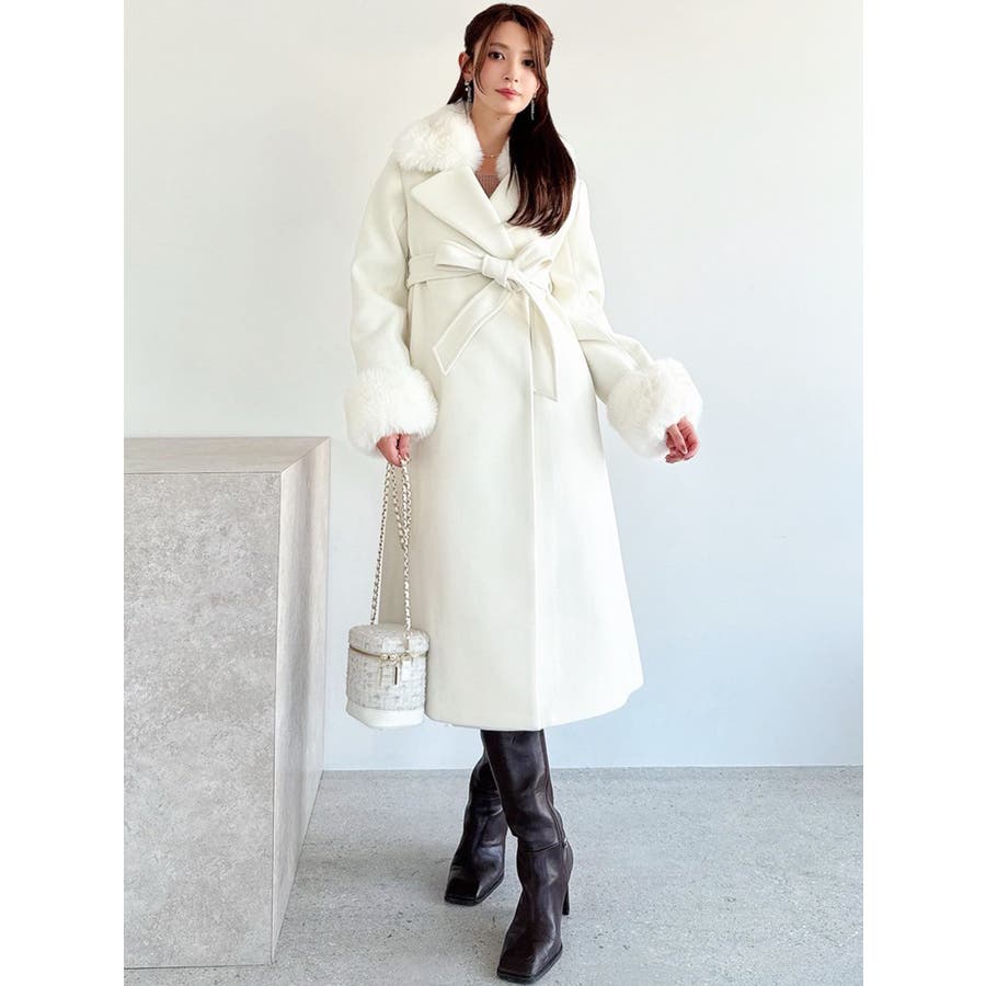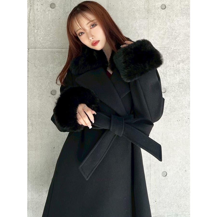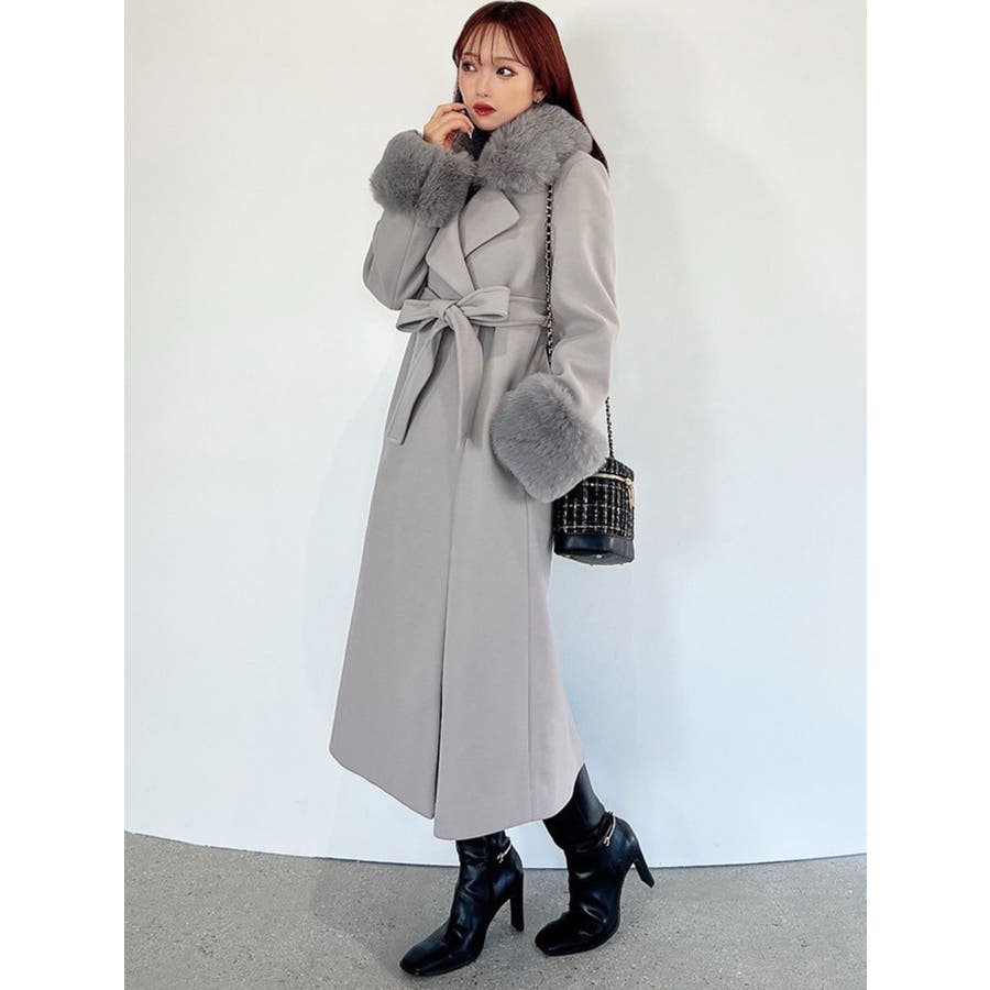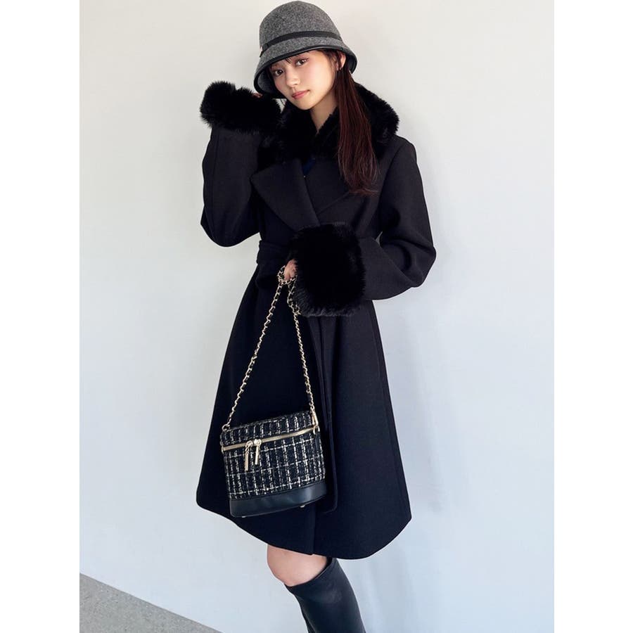 ワンピースのようなAラインシルエットが女性らしいキレイ目コート。襟と袖口のフェイクファーは肌触りの良いものを使用し大きめの襟で小顔効果も叶う、高級感溢れるコート。