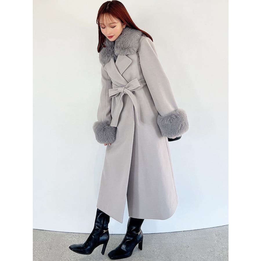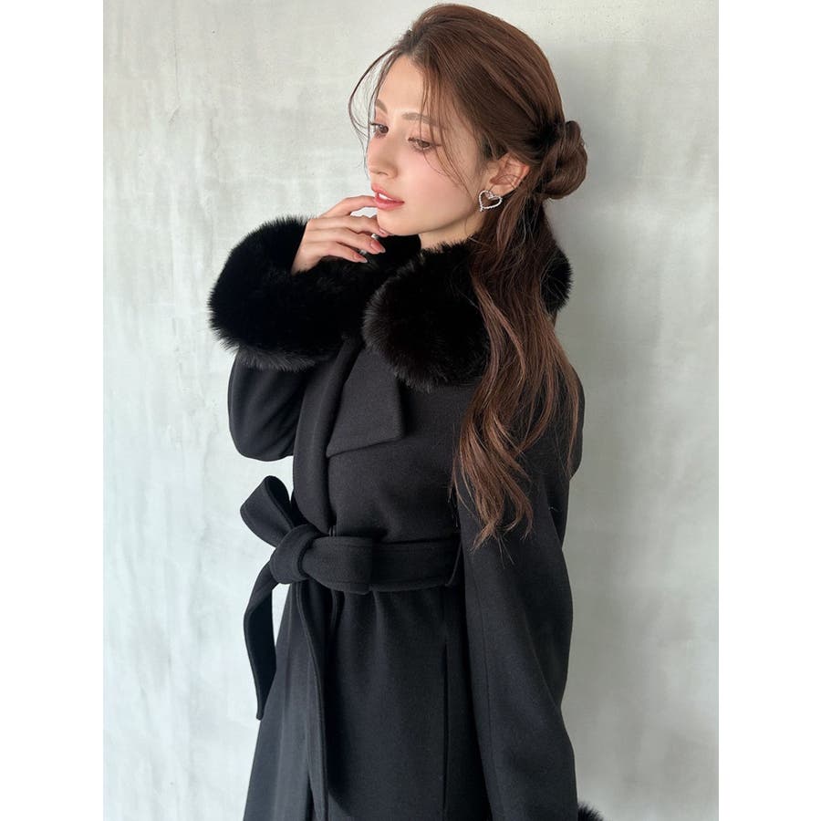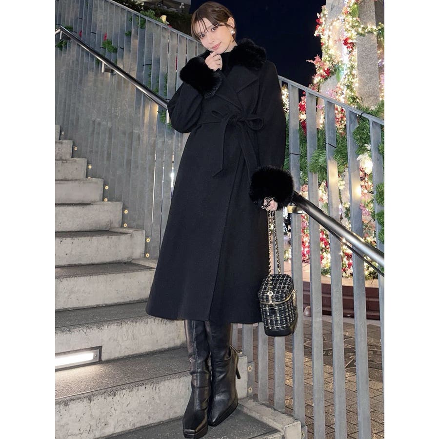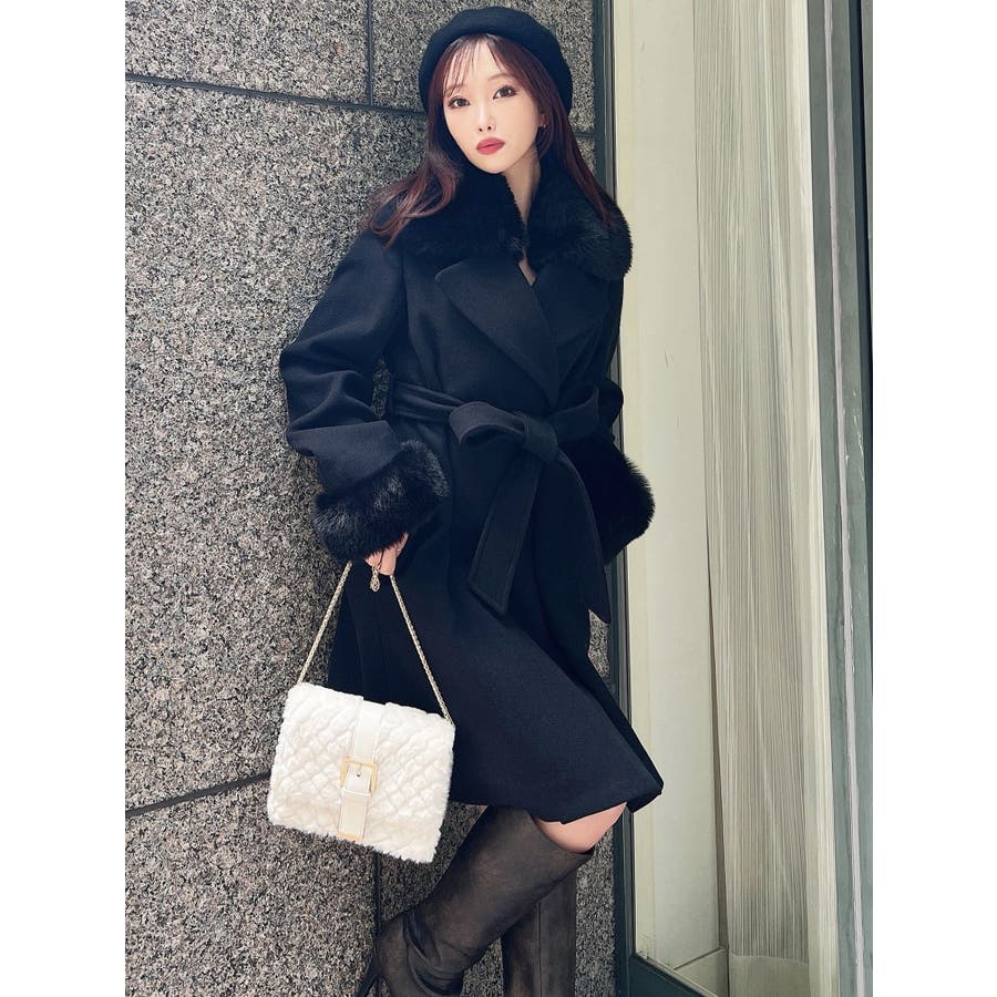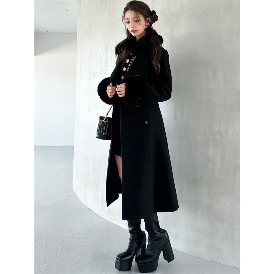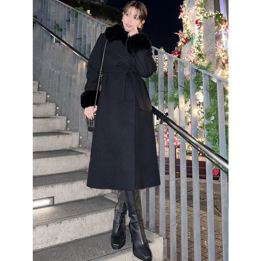ワンピースのようなAラインシルエットが女性らしいキレイ目コート。襟と袖口のフェイクファーは肌触りの良いものを使用し大きめの襟で小顔効果も叶う、高級感溢れるコート。