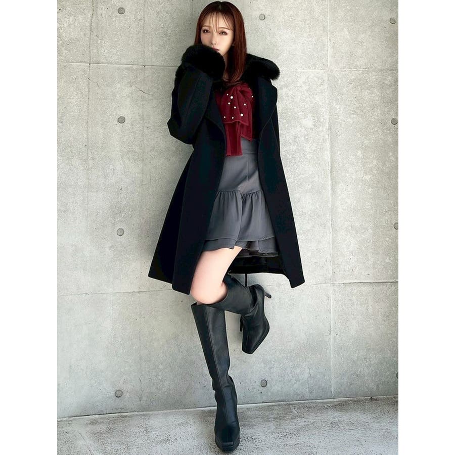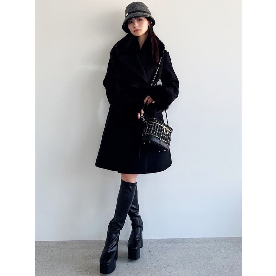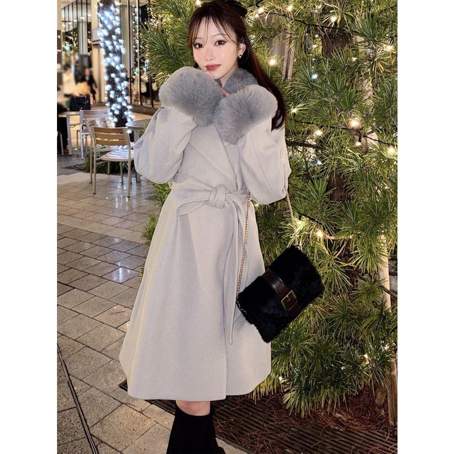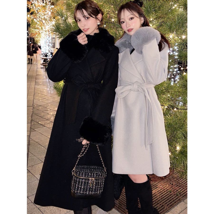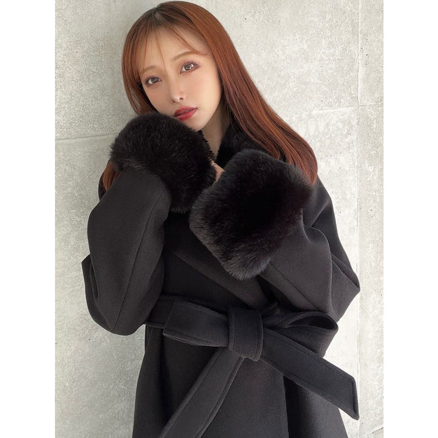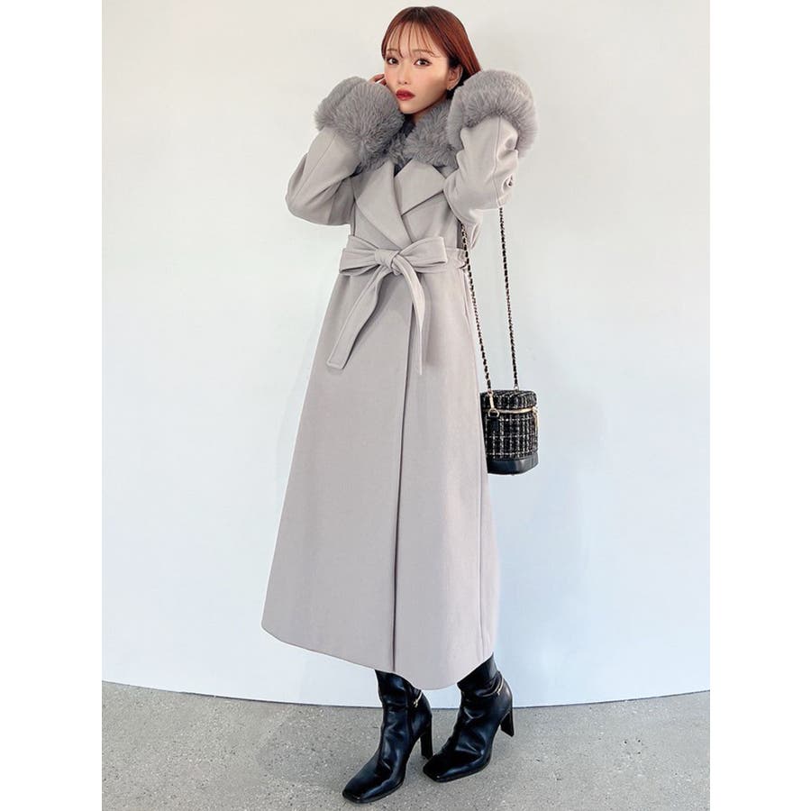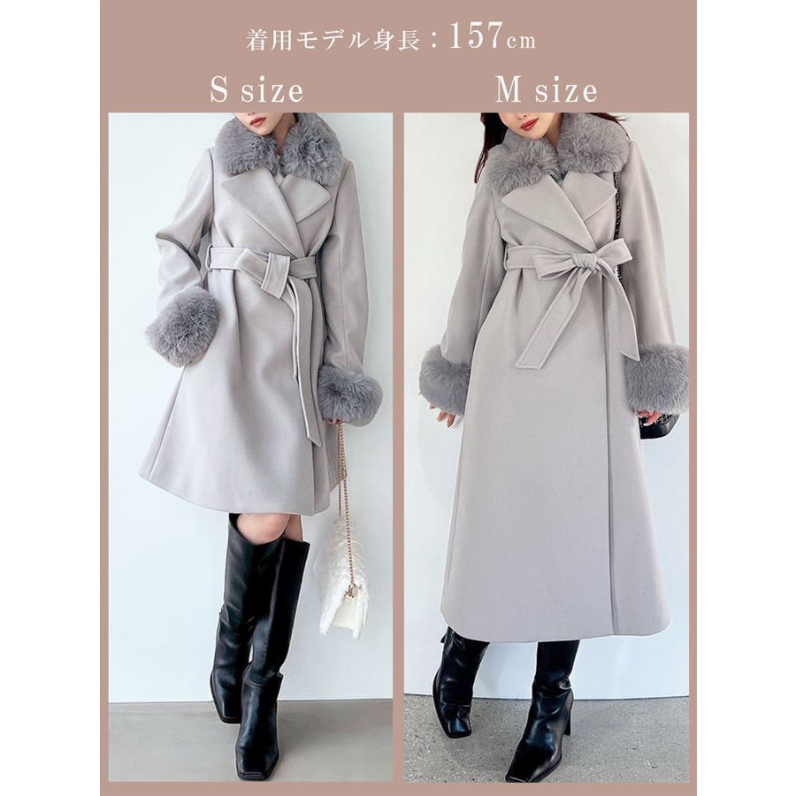 ワンピースのようなAラインシルエットが女性らしいキレイ目コート。襟と袖口のフェイクファーは肌触りの良いものを使用し大きめの襟で小顔効果も叶う、高級感溢れるコート。