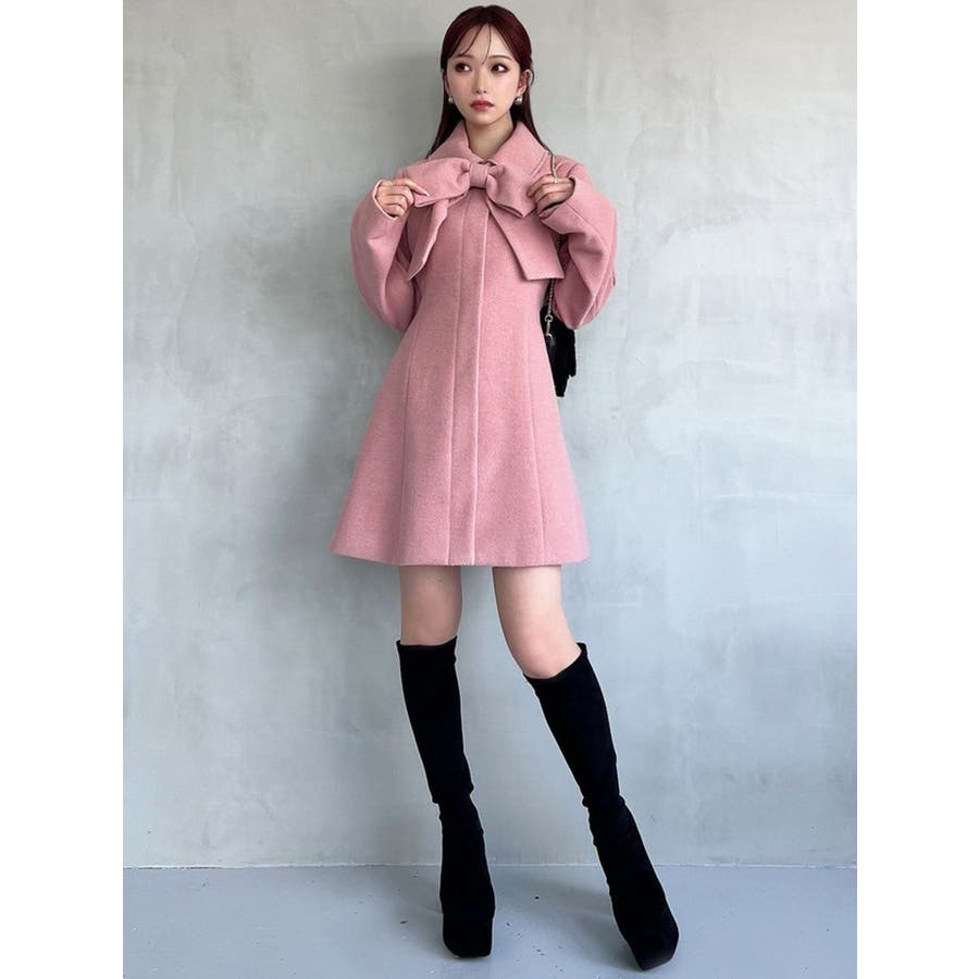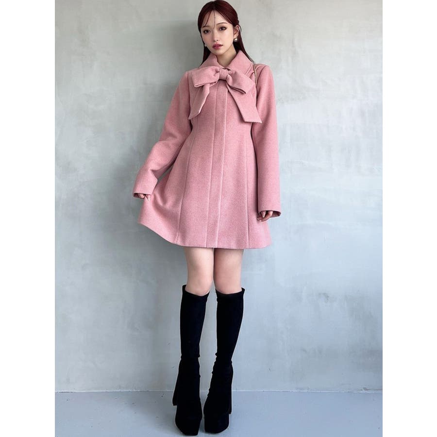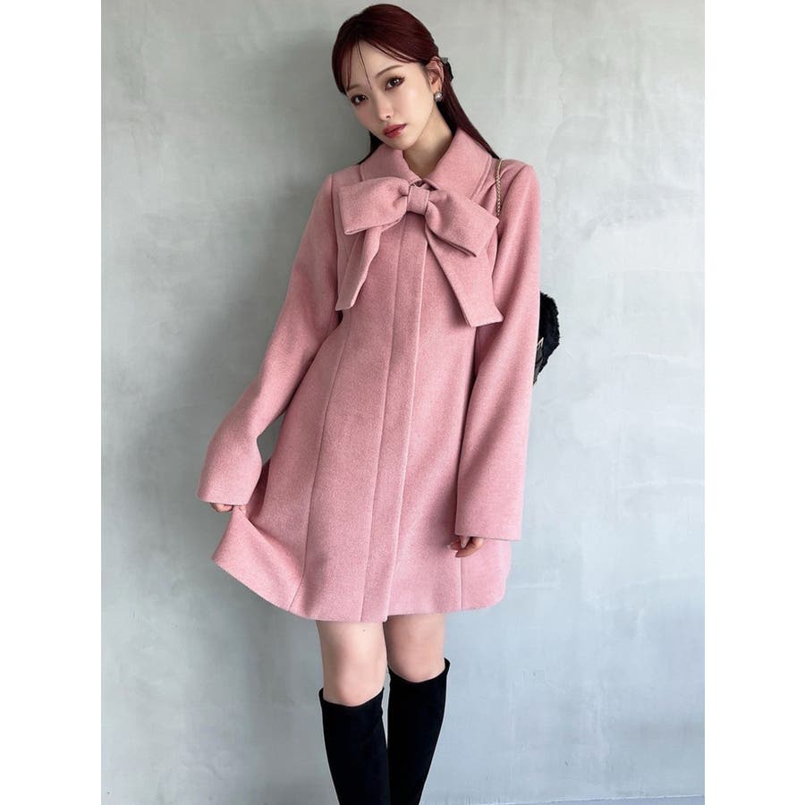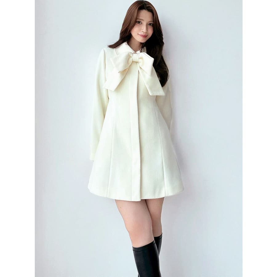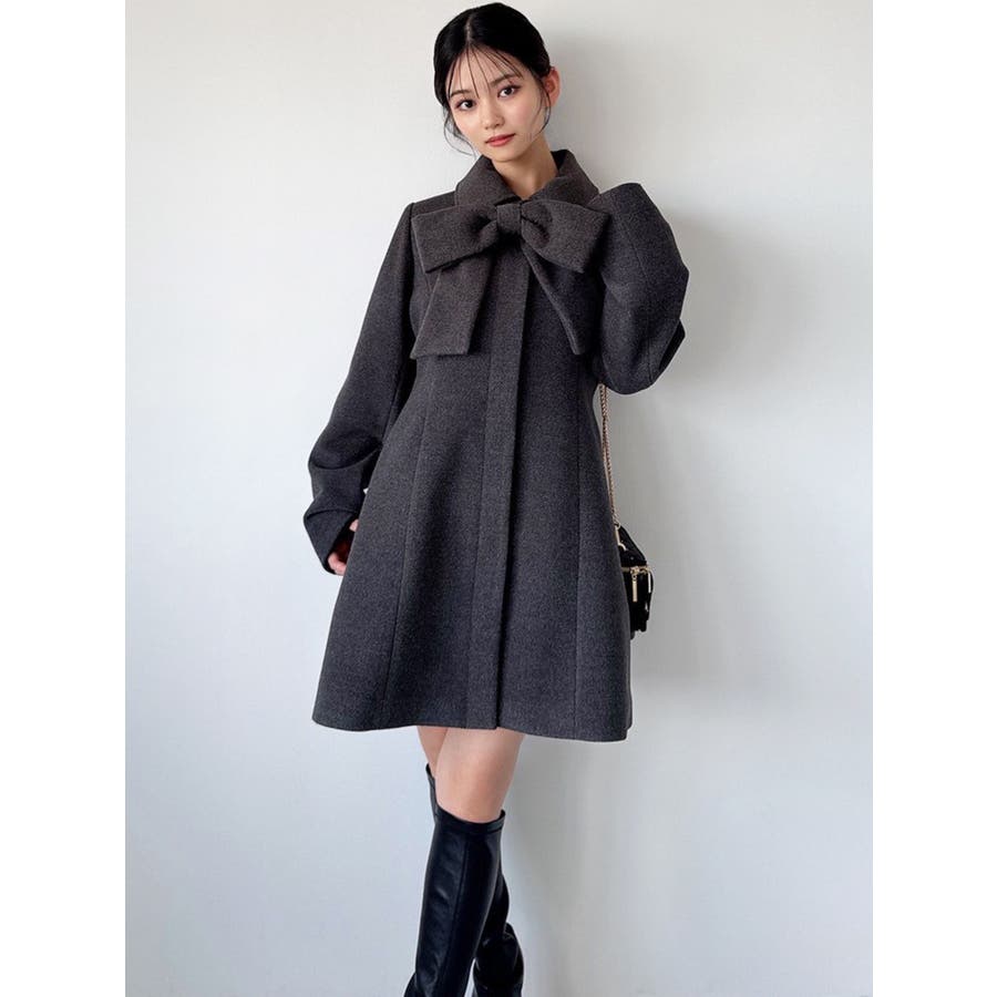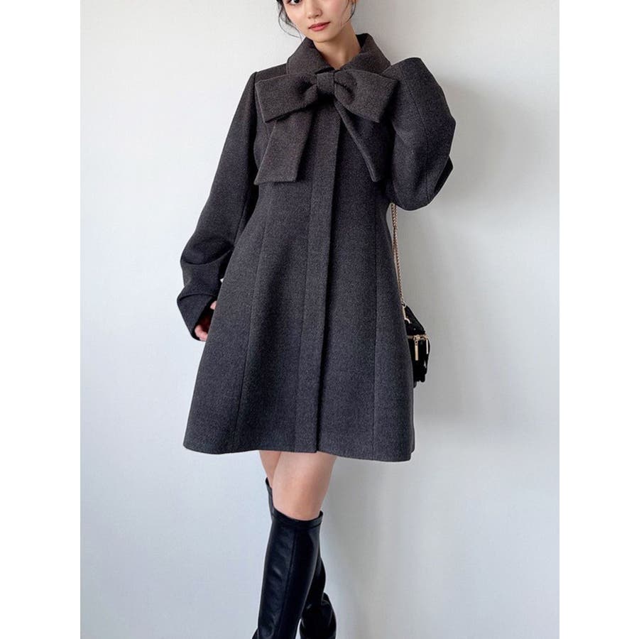 フロントのビッグリボンが目を惹くコート▽デザイン▽首元のビッグリボンで女性らしさUP♪他にないデザインで周りと差がつくキレイ目コートが登場。リボンはボタンで取り外し可能になっているので付けても外しても着用できる2WAY仕様に♪首元はしっかり閉じるので防寒も◎ミディ丈のコートでスタイリングをコンパクトにまとめます。前を閉じるだけでウエストラインが綺麗に出て、フレアミニワンピースのようなシルエットで着用できます。▽カラー▽白・チャコールグレー・ピンクの3色展開。▽スタイリング▽ミニ丈のワンピースやボトムを合わせてワンピース風に着るのがおすすめ◎リボンを取ればシンプルなコートなのでトレンドに左右されず長く着用いただけます。