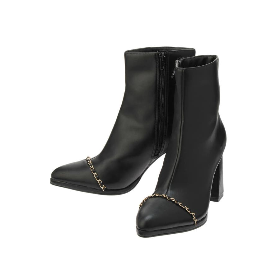 チェーンデザインがアクセントのショートブーツ▽デザイン▽ベーシックなショートブーツに、デザイン性をプラスした1足。滑らかなポインテットトウにチェーンをあしらい、上品な印象に仕上げました。ホワイトはバイカラーにすることでモダンなデザインに。太ヒールなので安定感があり、履きやすさ抜群◎▽カラー▽白・黒の2色展開。【スタッフ着用レビュー】 スタッフA(普段のサイズ: 23.5cm/足の幅: 9.0cm/甲の高さ: 5.7cm/ふくらはぎ周り:34cm)Mサイズを着用し丁度良いサイズ感でした。シンプルなデザインでどんなコーディネートにも合いそうです。内側にファスナーも付いているので着脱もしやすいです。