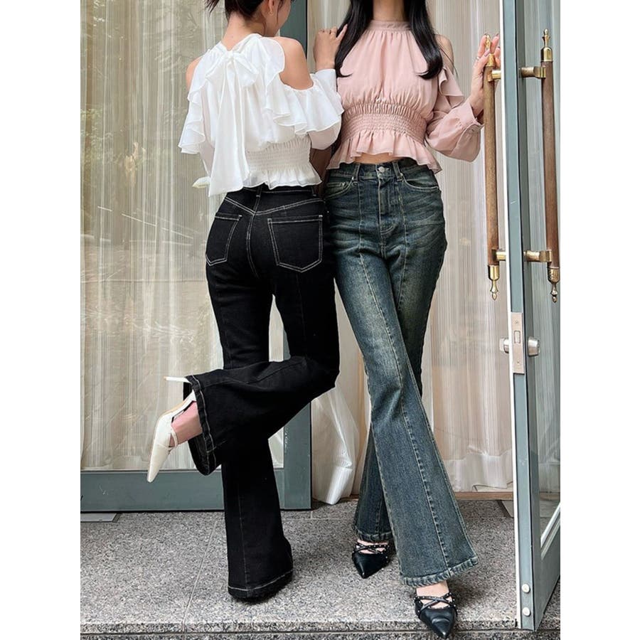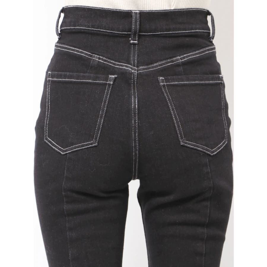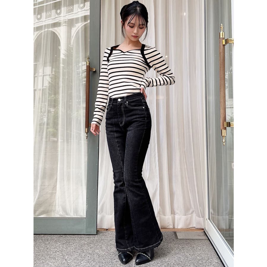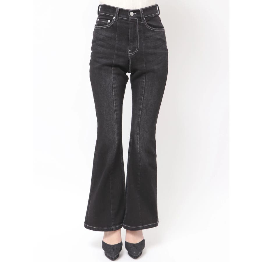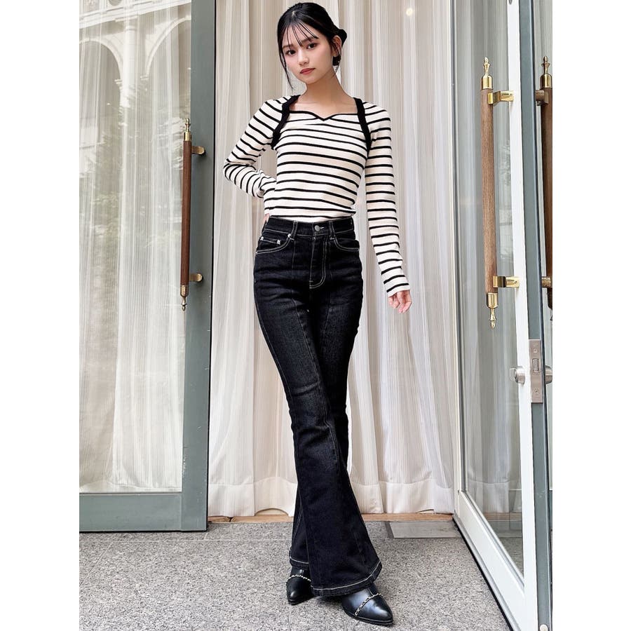 「脚長効果はそのままに、シンプルなデザインが欲しい!」という沢山のリクエストにお応えして、あの大バズりデニムから“ずっと履けるベーシックデニム”が登場!▽デザイン▽ウエストはキュッと細く、脚はとことん長く!計算されたウエストシルエットと裾まで伸びたセンタータックがスタイルアップ効果を高めます。ヒップのVデザインとポケットの位置を高く設定していることでヒップアップ見えし、後ろ姿まで抜かりなく♪脚を細く長く見せるフレアデザインで、ヒールでもスニーカーでも美脚効果抜群◎XS・S・Mの3サイズ展開でピッタリフィットします。▽カラー▽トレンドのヴィンテージ加工をほどこした黒・青の2色展開。▽スタイリング▽キレイ目なブラウスからカジュアルなトップスまでどんなトップスにも万能にマッチします。冬のアウター合わせでもしっかり細見えするデニムです♪1本持っているとオールシーズン活躍します◎