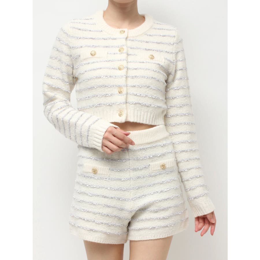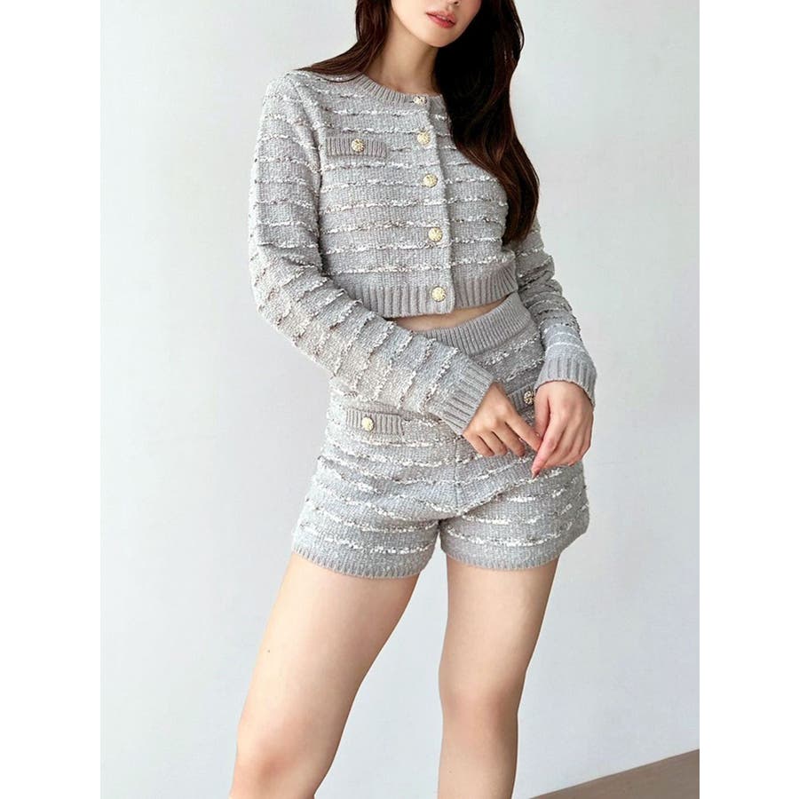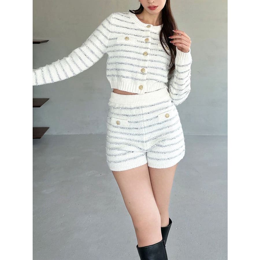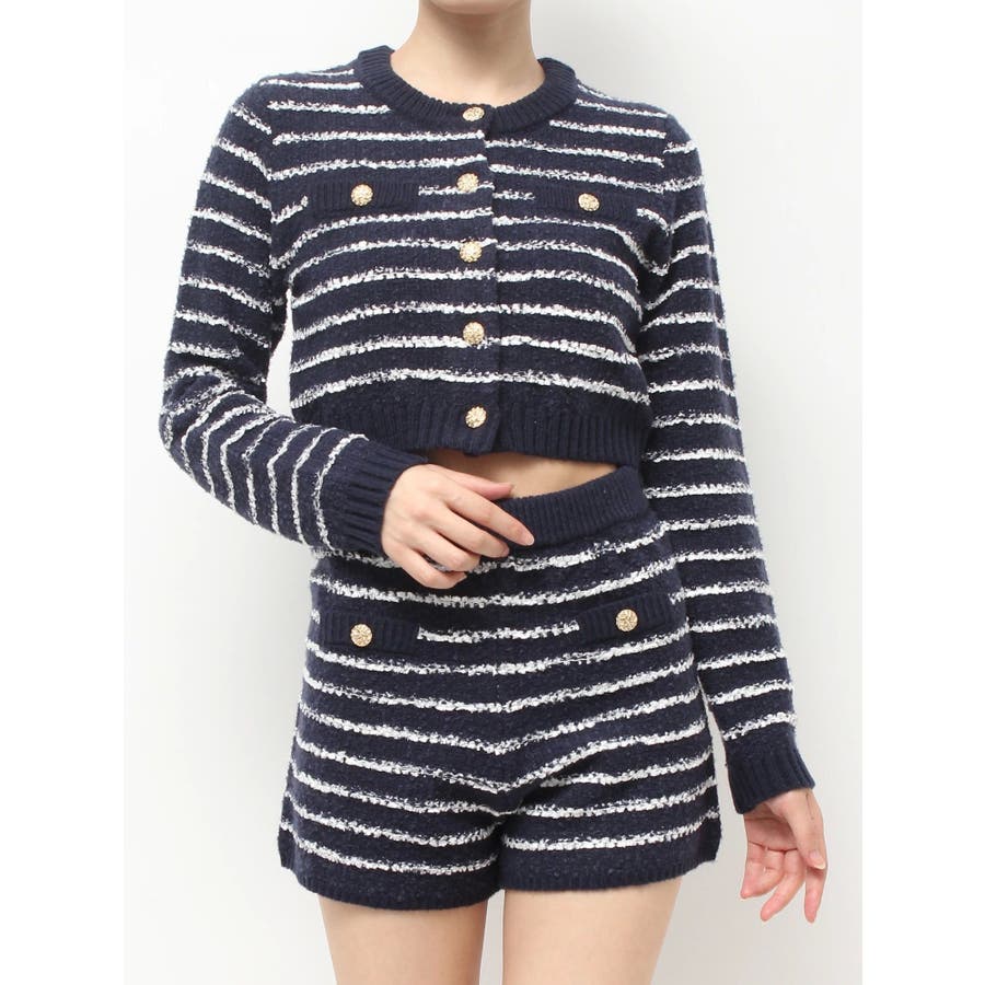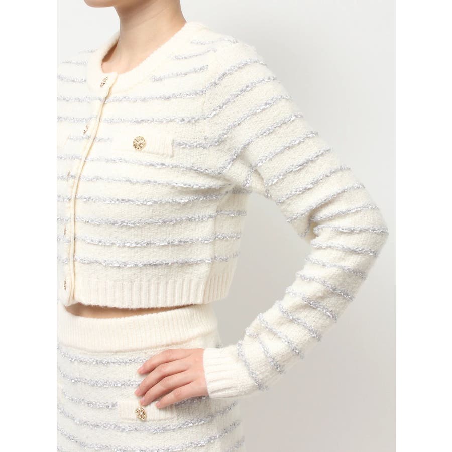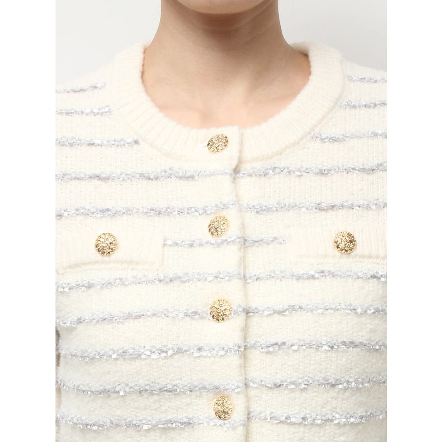 \展示会人気NO.1/オリジナルのボーダーツイードが目を惹くニットカーディガン▽デザイン▽表情豊かなテキスタイルが独自の風合いを生み、1枚で華やかなニットに仕上げました。ボーダーツイードがシーズンムードを高め、ゴールドボタンが高級感を高めます。クロップド丈なので上半身をコンパクトに見せるスタイルアップ効果抜群!カーディガンとしてもトップスとしても着用できるので着回しの幅が広がります。▽カラー▽白・グレー・ネイビーの3色展開。▽スタイリング▽同色のニットパンツを合わせればセットアップ着用が可能◎デニムからスカートまでどんなボトムにも合わせやすく、秋口~春先まで長く使えるアイテムです。【セットアップアイテムはコチラ】>>ツイードボーダーニットパンツ※着用画像はフラッシュの加減で実際の製品と色味等が異なる場合がございますので、生地のズームアップ画像をご確認ください。※ご利用の端末画面の設定により実際の商品と色味が異なる場合がございます。【商品特徴】透け感:なし伸縮性:あり生地の厚さ:普通サイズ感:普通裏地:なしポケット:なし