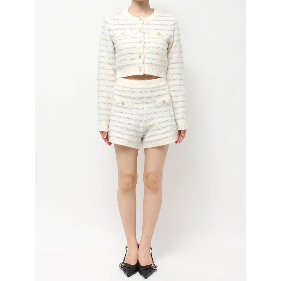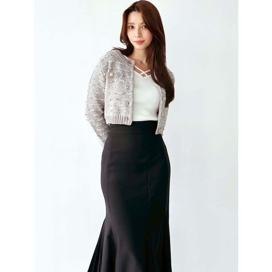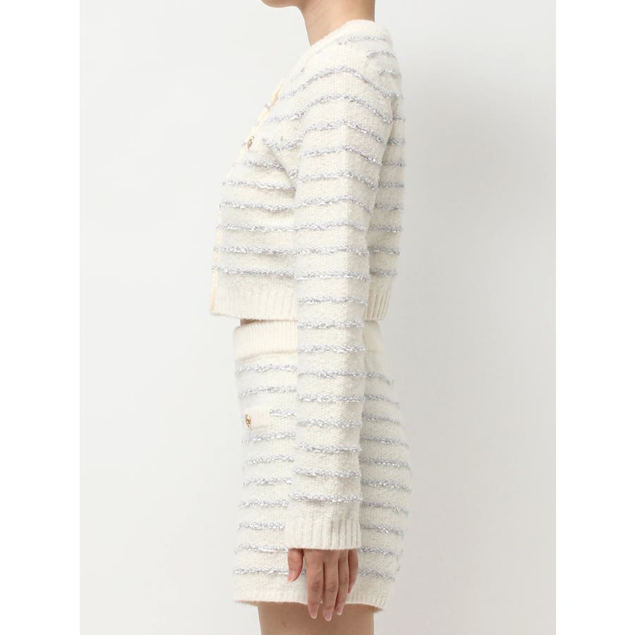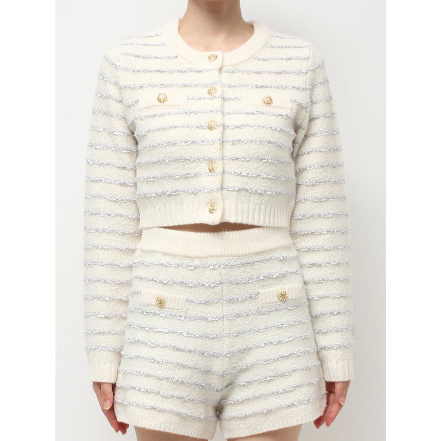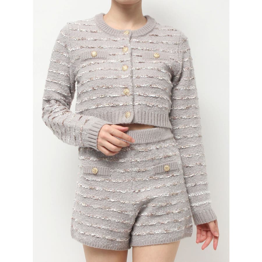 \展示会人気NO.1/オリジナルのボーダーツイードが目を惹くニットカーディガン▽デザイン▽表情豊かなテキスタイルが独自の風合いを生み、1枚で華やかなニットに仕上げました。ボーダーツイードがシーズンムードを高め、ゴールドボタンが高級感を高めます。クロップド丈なので上半身をコンパクトに見せるスタイルアップ効果抜群!カーディガンとしてもトップスとしても着用できるので着回しの幅が広がります。▽カラー▽白・グレー・ネイビーの3色展開。▽スタイリング▽同色のニットパンツを合わせればセットアップ着用が可能◎デニムからスカートまでどんなボトムにも合わせやすく、秋口~春先まで長く使えるアイテムです。【セットアップアイテムはコチラ】>>ツイードボーダーニットパンツ※着用画像はフラッシュの加減で実際の製品と色味等が異なる場合がございますので、生地のズームアップ画像をご確認ください。※ご利用の端末画面の設定により実際の商品と色味が異なる場合がございます。【商品特徴】透け感:なし伸縮性:あり生地の厚さ:普通サイズ感:普通裏地:なしポケット:なし