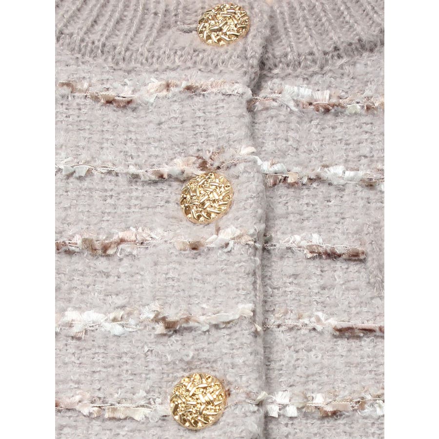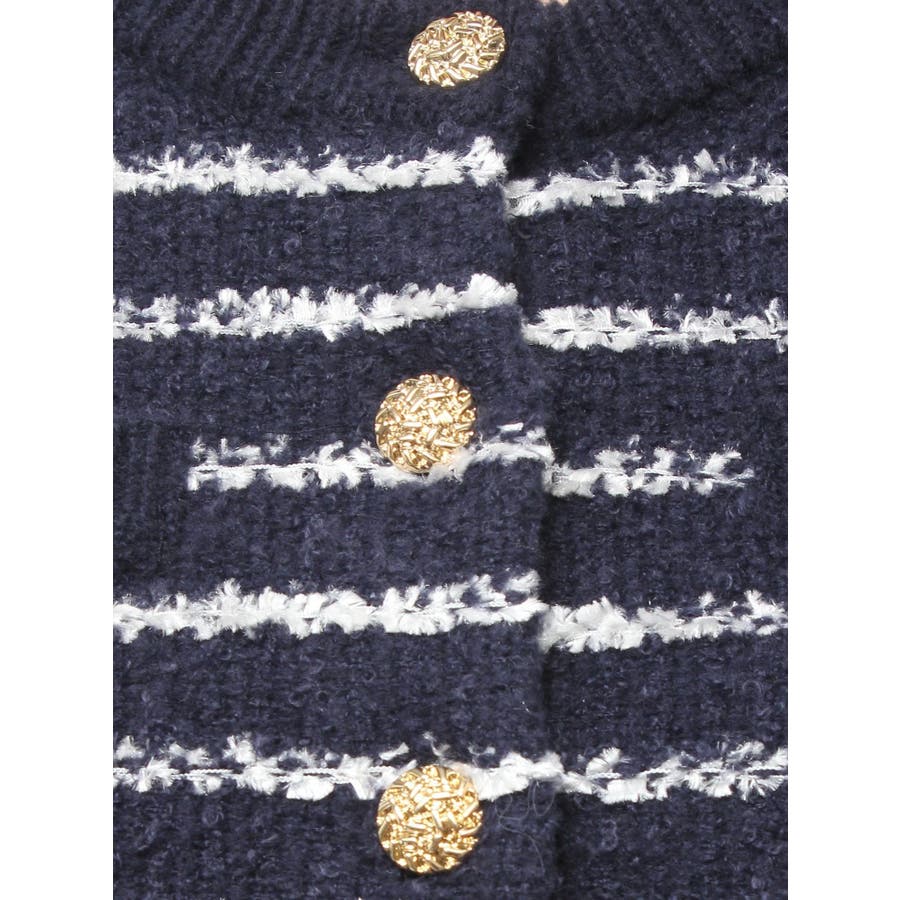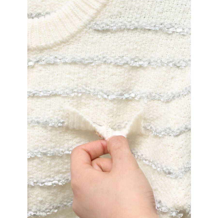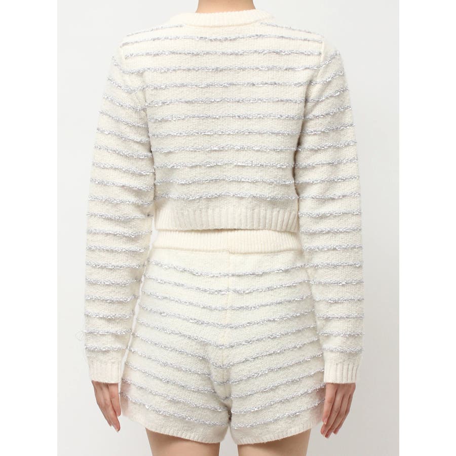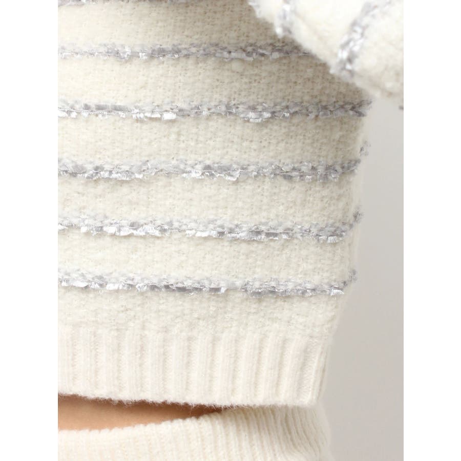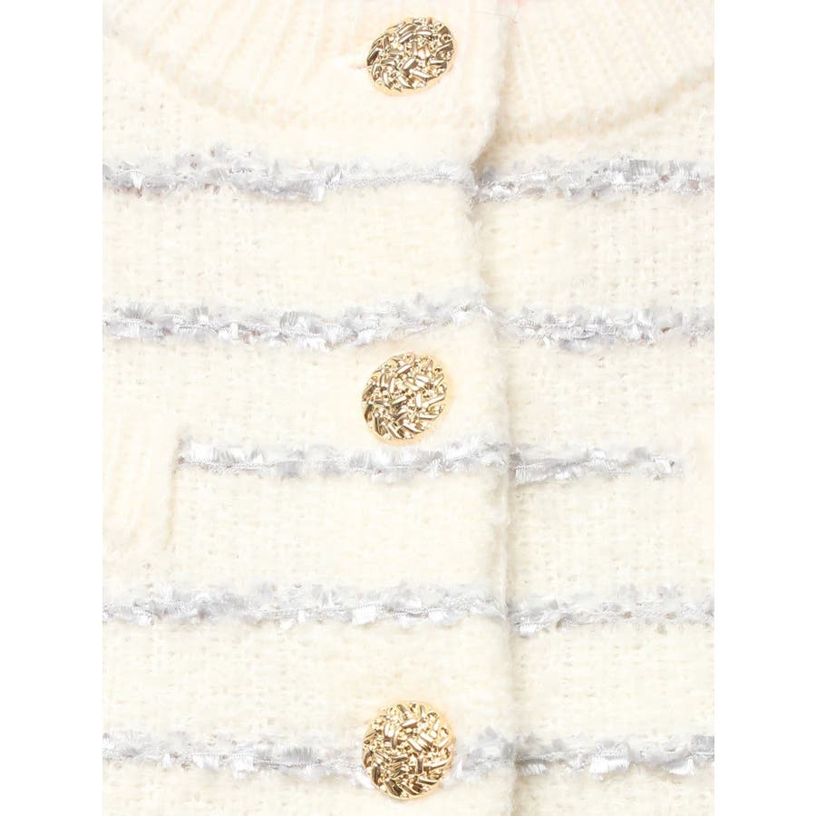 \展示会人気NO.1/オリジナルのボーダーツイードが目を惹くニットカーディガン▽デザイン▽表情豊かなテキスタイルが独自の風合いを生み、1枚で華やかなニットに仕上げました。ボーダーツイードがシーズンムードを高め、ゴールドボタンが高級感を高めます。クロップド丈なので上半身をコンパクトに見せるスタイルアップ効果抜群!カーディガンとしてもトップスとしても着用できるので着回しの幅が広がります。▽カラー▽白・グレー・ネイビーの3色展開。▽スタイリング▽同色のニットパンツを合わせればセットアップ着用が可能◎デニムからスカートまでどんなボトムにも合わせやすく、秋口~春先まで長く使えるアイテムです。【セットアップアイテムはコチラ】>>ツイードボーダーニットパンツ※着用画像はフラッシュの加減で実際の製品と色味等が異なる場合がございますので、生地のズームアップ画像をご確認ください。※ご利用の端末画面の設定により実際の商品と色味が異なる場合がございます。【商品特徴】透け感:なし伸縮性:あり生地の厚さ:普通サイズ感:普通裏地:なしポケット:なし