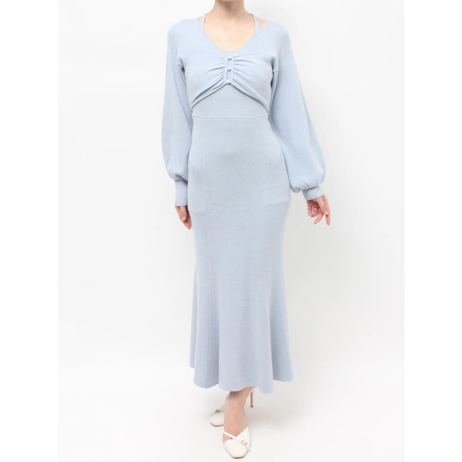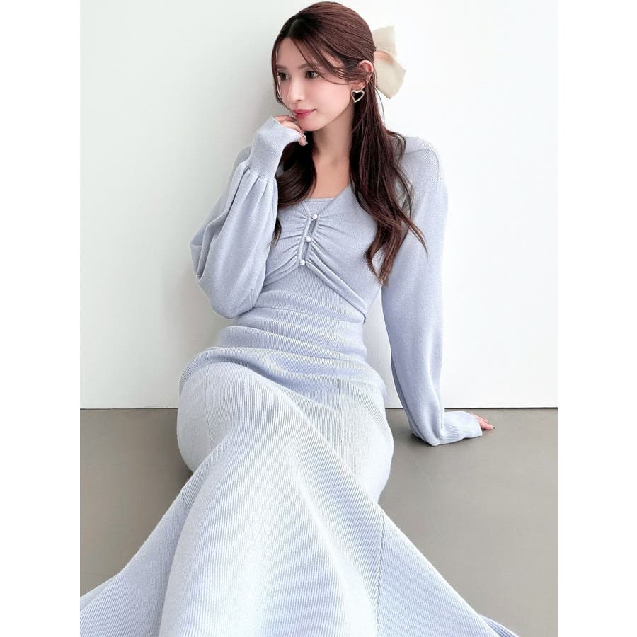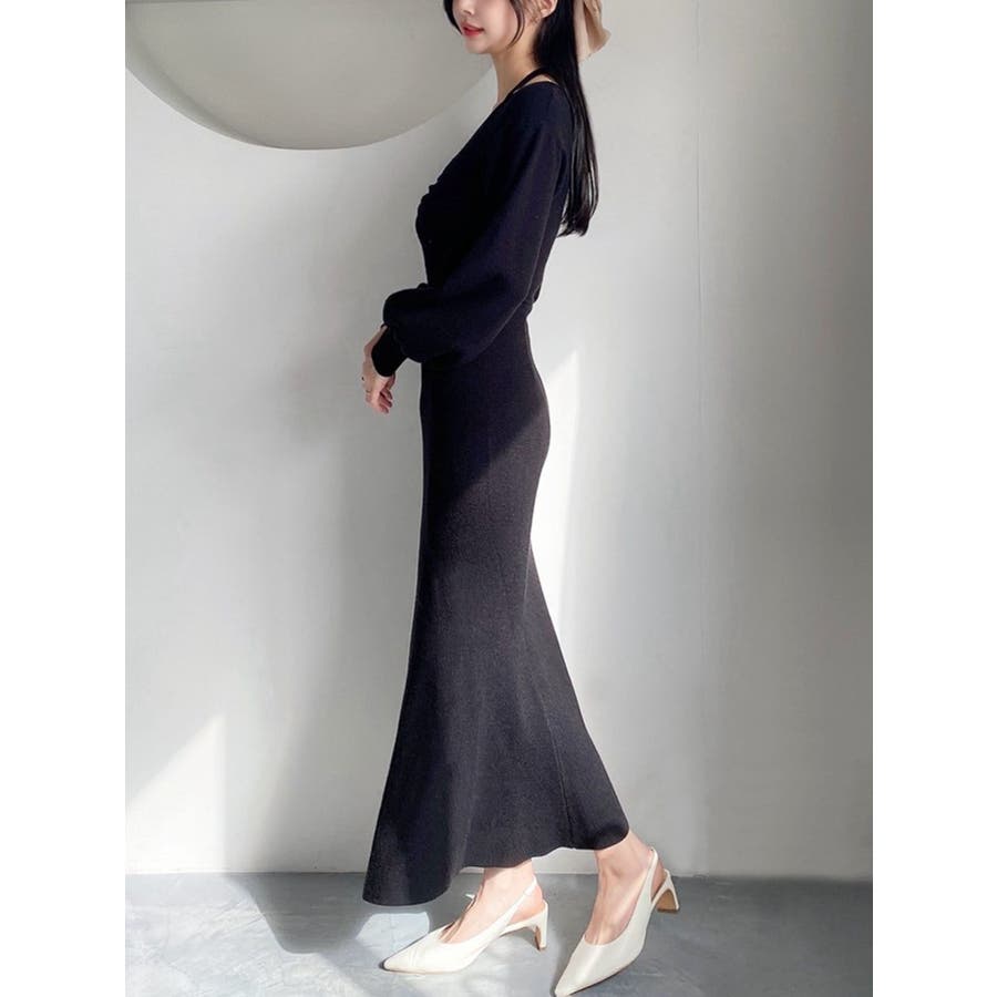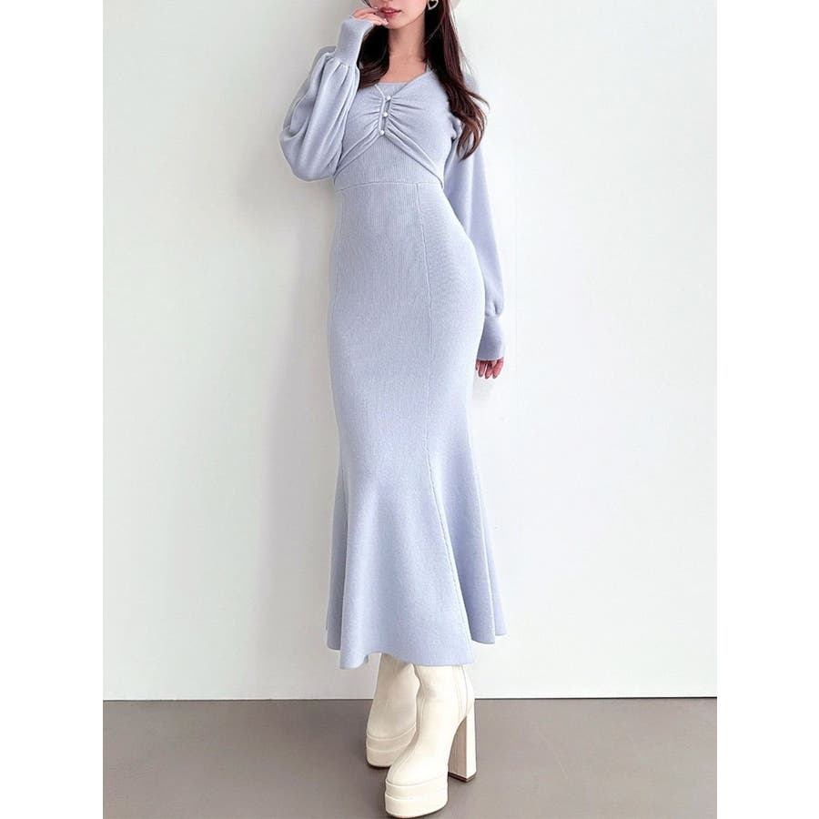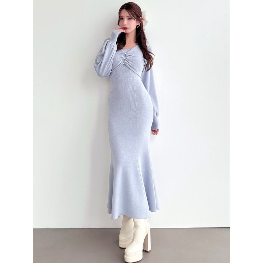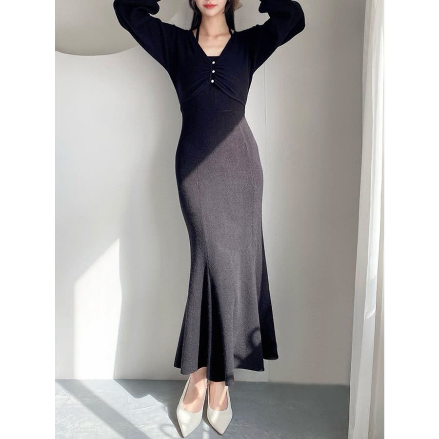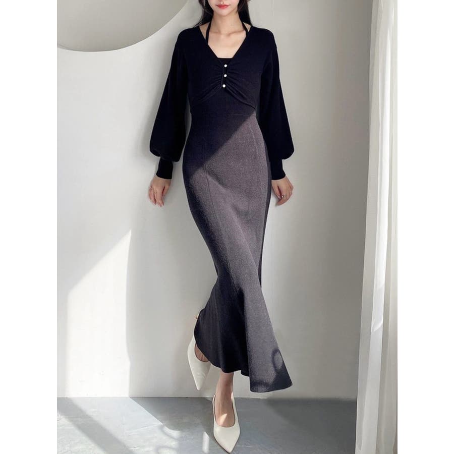 毎年大人気のワンピースが今年も登場!▽デザイン▽クロップド丈のニットカーディガンとマーメイドワンピースのドッキングデザインで1枚でデザイン性のあるレイヤード見えデザインにしました。裾に向かってゆるやかに広がったマーメイドシルエットが大人な印象に。カーディガンのフロントにギャザーを寄せたり、インナーのネックの後ろ部分はリボン結びにしたりとさりげなく女性らしいポイントをプラス。▽カラー▽白・黒・青の3色展開。▽スタイリング▽1枚でサラッと着用できてキレイ目コーデが完成。ボディにフィットするサイズ感なのでアウター羽織りもでき、ロングシーズン活躍します。