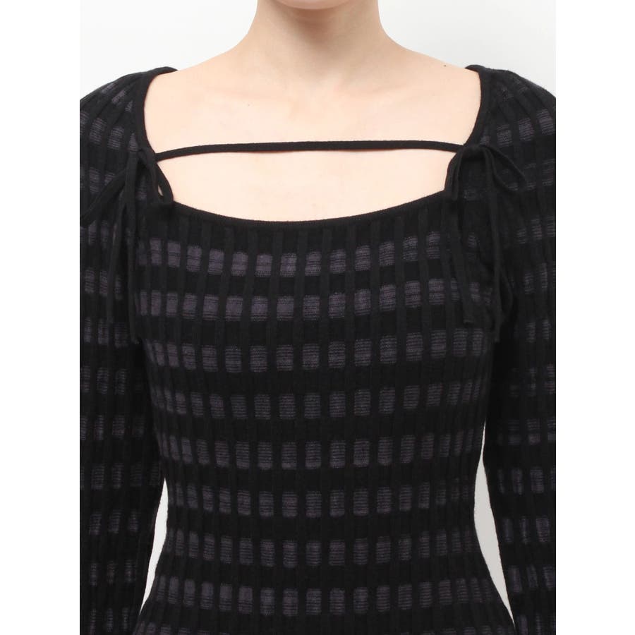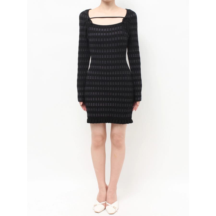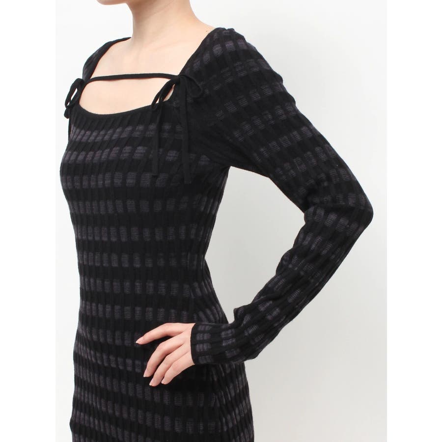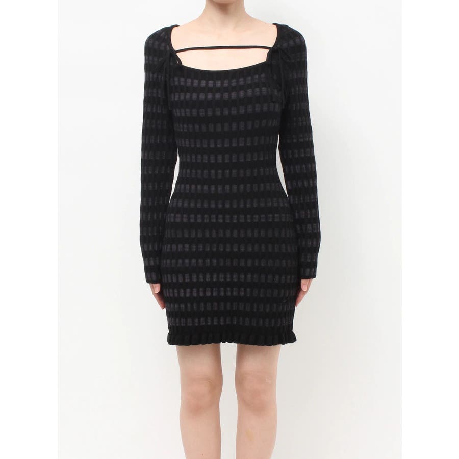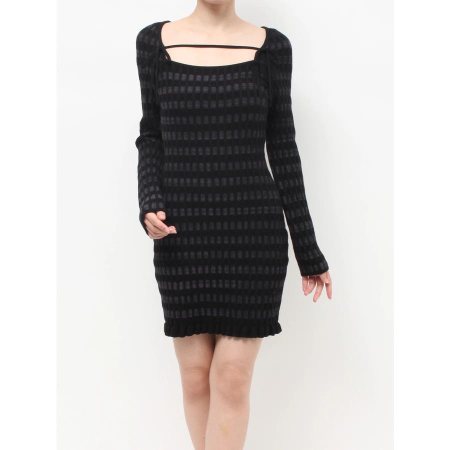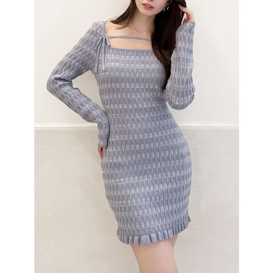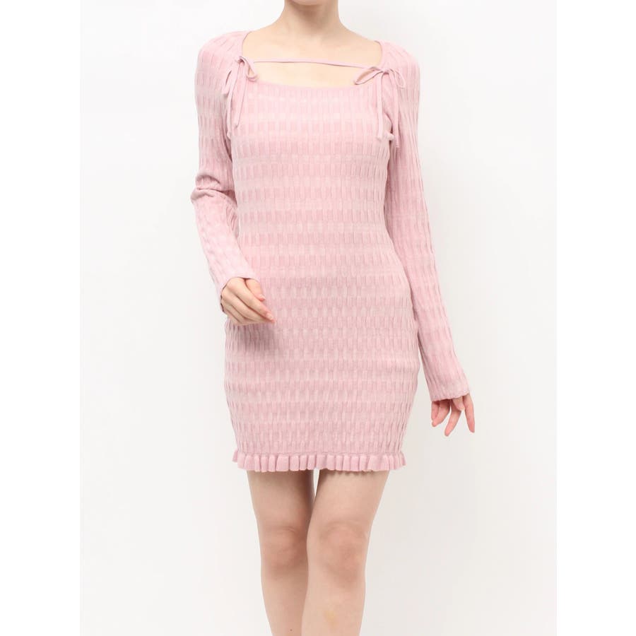 バスト開きとリボンデザインが女性らしさUPのミニワンピース▽デザイン▽表面感のある生地感のニットにリボンデザインをプラスした1枚。裾のフリルデザインやバスト開きの肌見せが可愛らしさをプラスします。タイトなシルエットで甘さを抑え、スタイルアップできるアイテムに仕上げました。▽カラー▽黒・青・ピンクの3色展開。▽スタイリング▽デザイン性があるワンピースなので1枚で女性らしくこなれ感のあるコーデが完成。タイトシルエットなのでアウターも羽織りやすく、春先まで長くお使いいただけます。