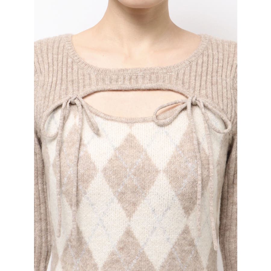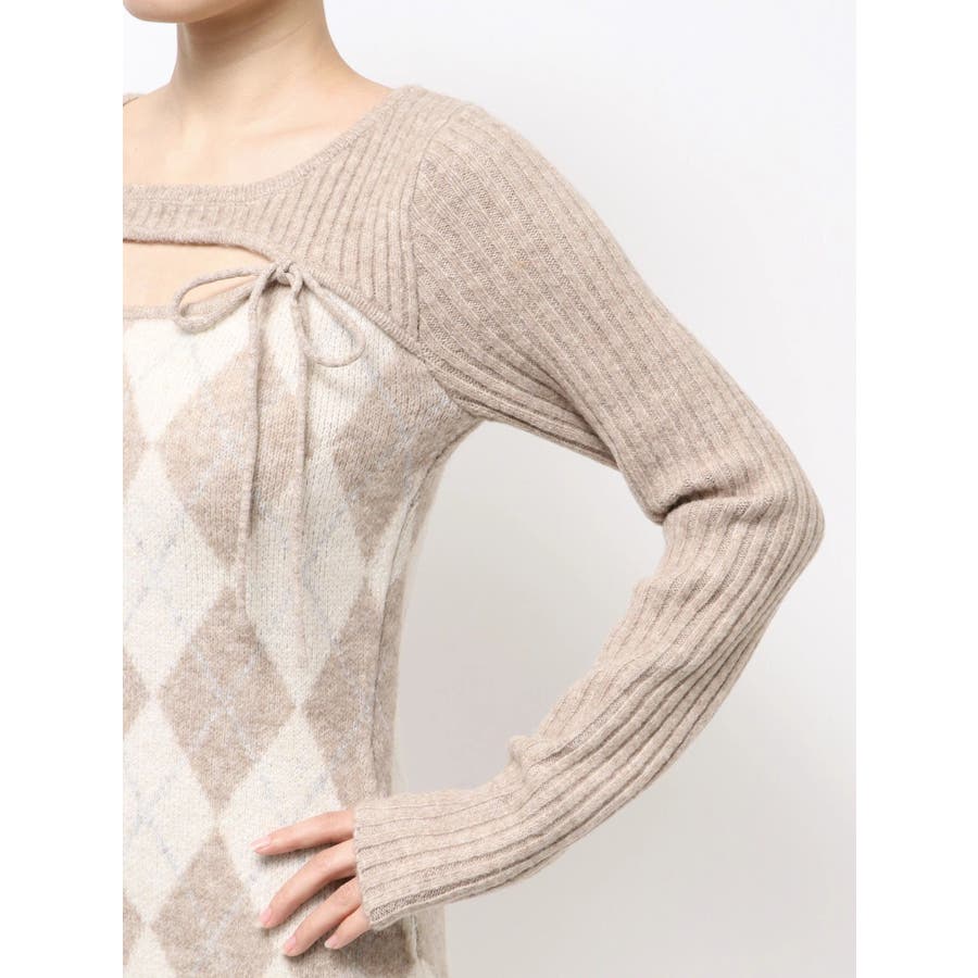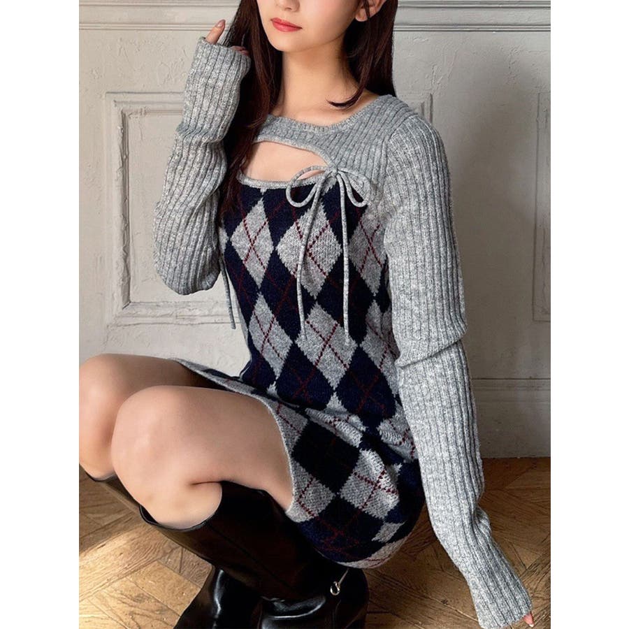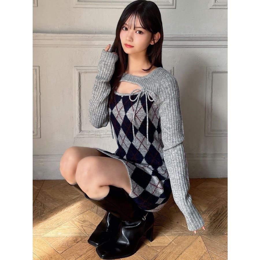 アーガイル柄と胸元のデザインがポイントのミニワンピ▽デザイン▽アーガイル柄がかわいらしいニットワンピ。胸元があいたデザインとリボンで女性らしい雰囲気に。ボディにフィットするコンパクトなシルエットでスタイルアップ効果も◎▽カラー▽グレー、黒、ベージュの3色展開。▽スタイリング▽1枚で仕上がるニットワンピです。ロングブーツを合わせたスタイリングがおすすめ◎デイリー使いだけでなくデートや女子会にもピッタリのアイテムです。
