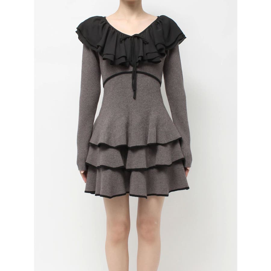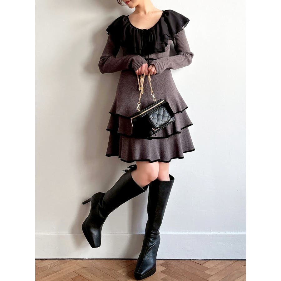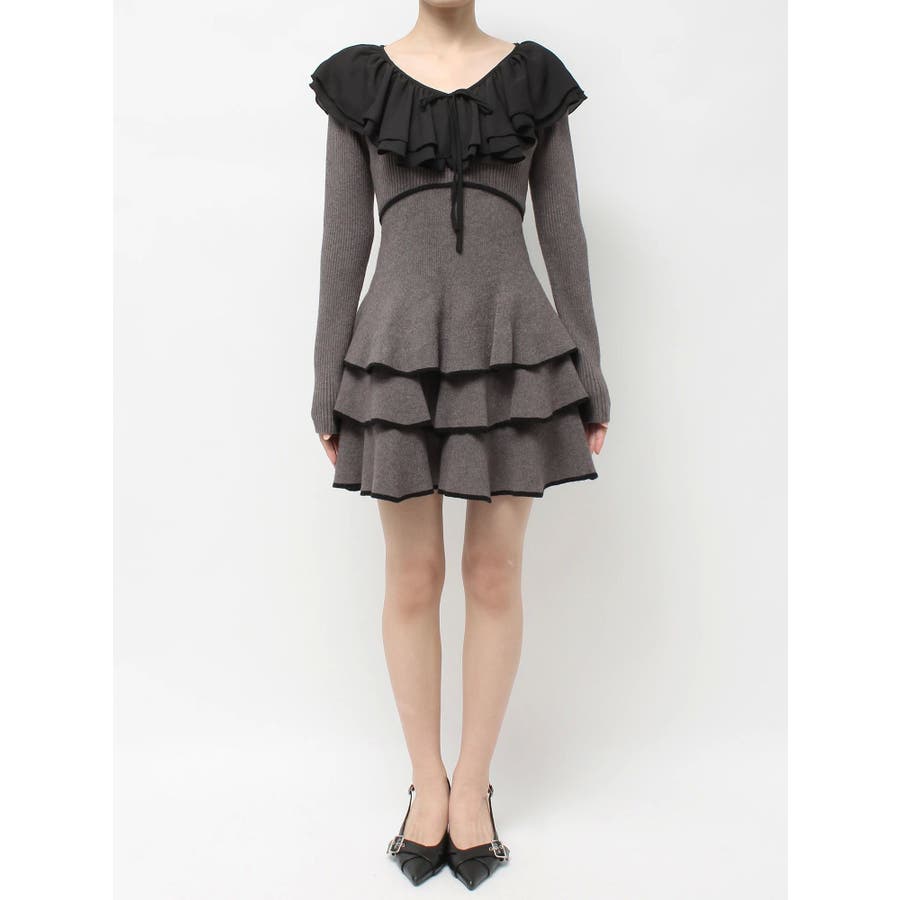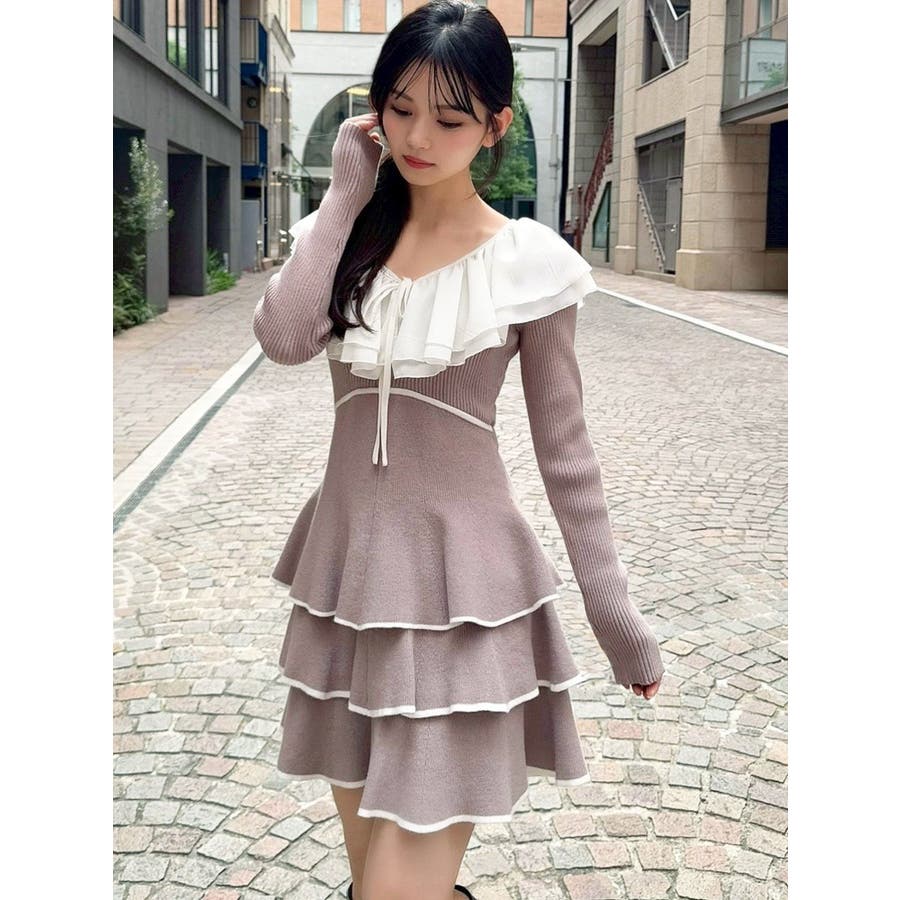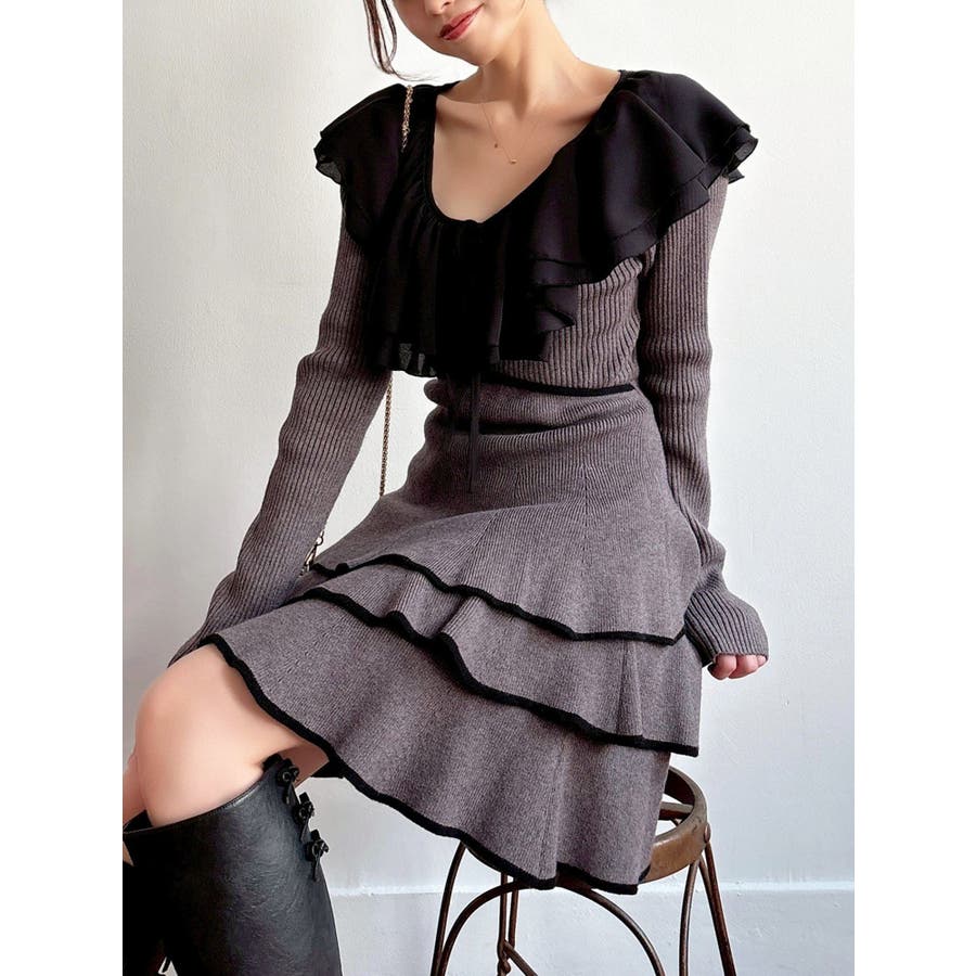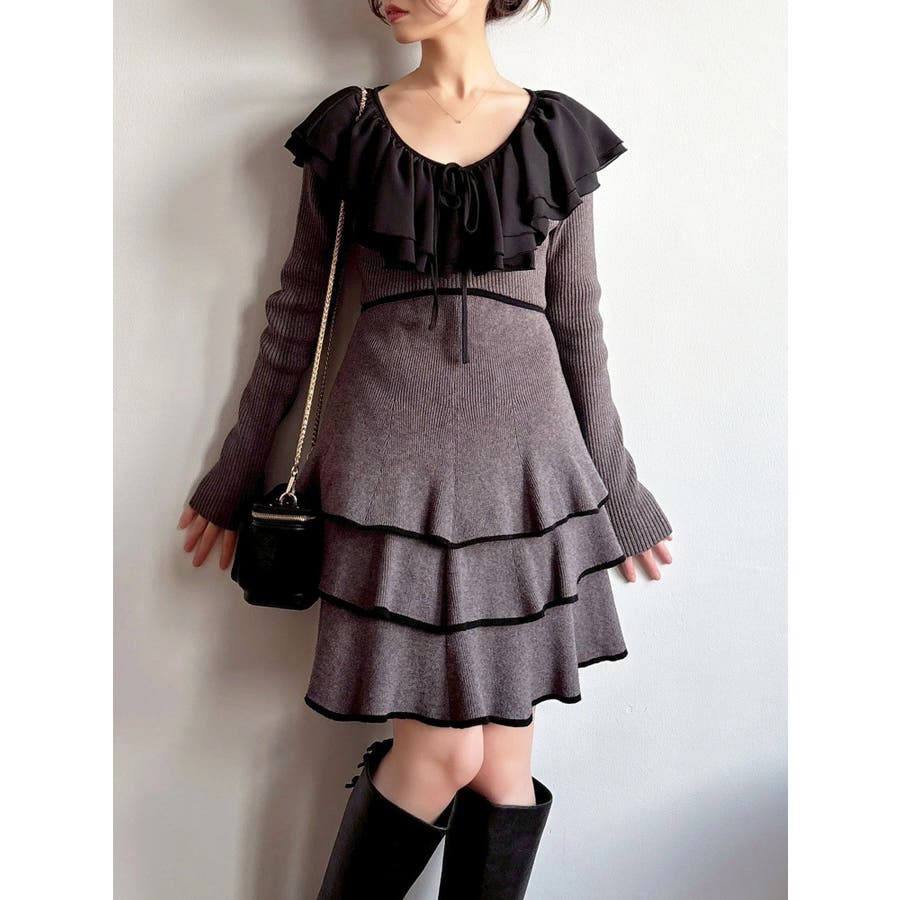 フリルデザインが目を惹くニットワンピース▽デザイン▽襟にフリルデザインがあることで顔周りが華やかに♪スカート部分もトレンド感のあるフリル連段デザインでボリューム感を出しました♪ウエストにはカーブ切り替えを入れたことでスッキリしたウエストラインに。バイカラーデザインが甘くなりすぎないメリハリ感をプラス。▽カラー▽黒・チャコールグレー・ベージュの3色展開。▽スタイリング▽ニットワンピなのでサラッと着れてフェミニンコーデに♪アウター合わせはもちろん、秋や春に1枚で着てもサマになるデザインです◎