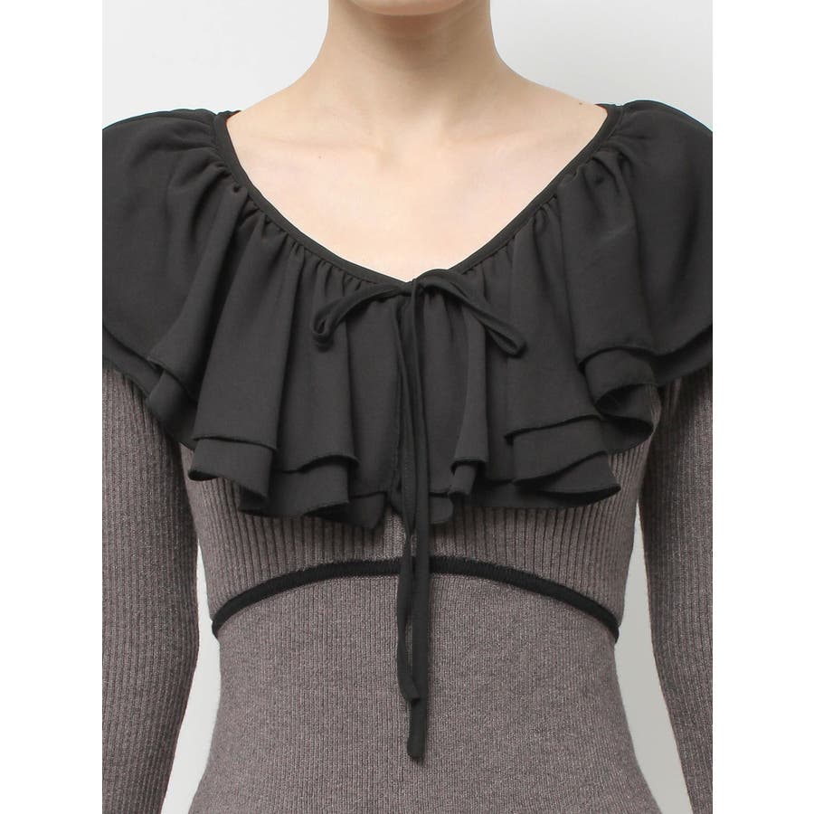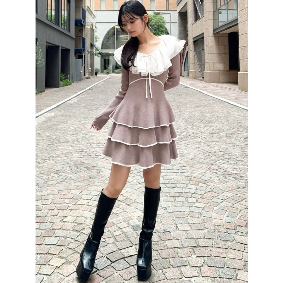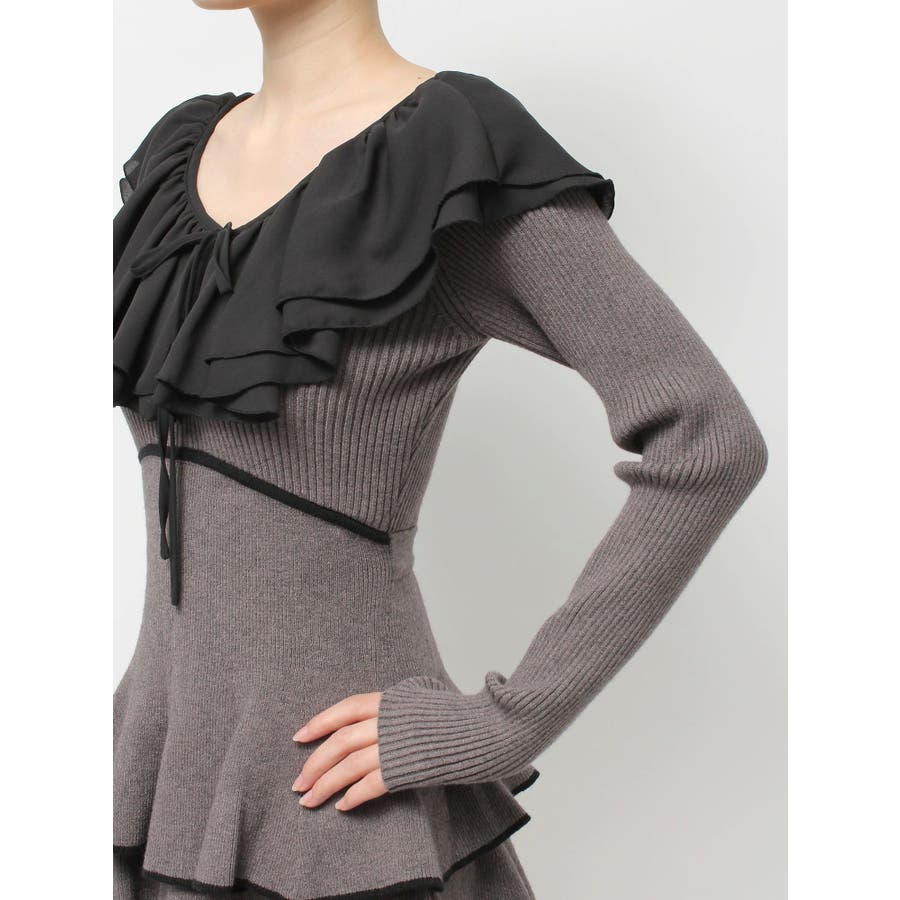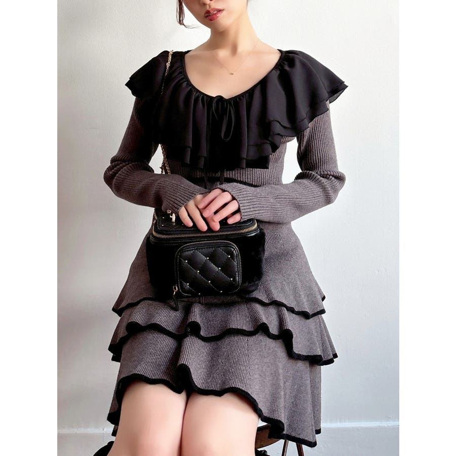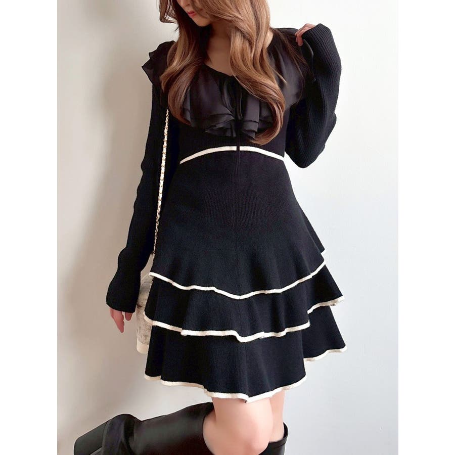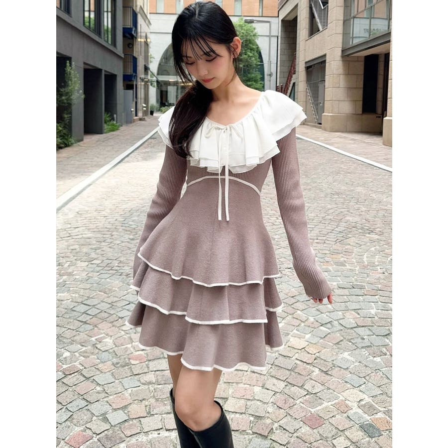 フリルデザインが目を惹くニットワンピース▽デザイン▽襟にフリルデザインがあることで顔周りが華やかに♪スカート部分もトレンド感のあるフリル連段デザインでボリューム感を出しました♪ウエストにはカーブ切り替えを入れたことでスッキリしたウエストラインに。バイカラーデザインが甘くなりすぎないメリハリ感をプラス。▽カラー▽黒・チャコールグレー・ベージュの3色展開。▽スタイリング▽ニットワンピなのでサラッと着れてフェミニンコーデに♪アウター合わせはもちろん、秋や春に1枚で着てもサマになるデザインです◎