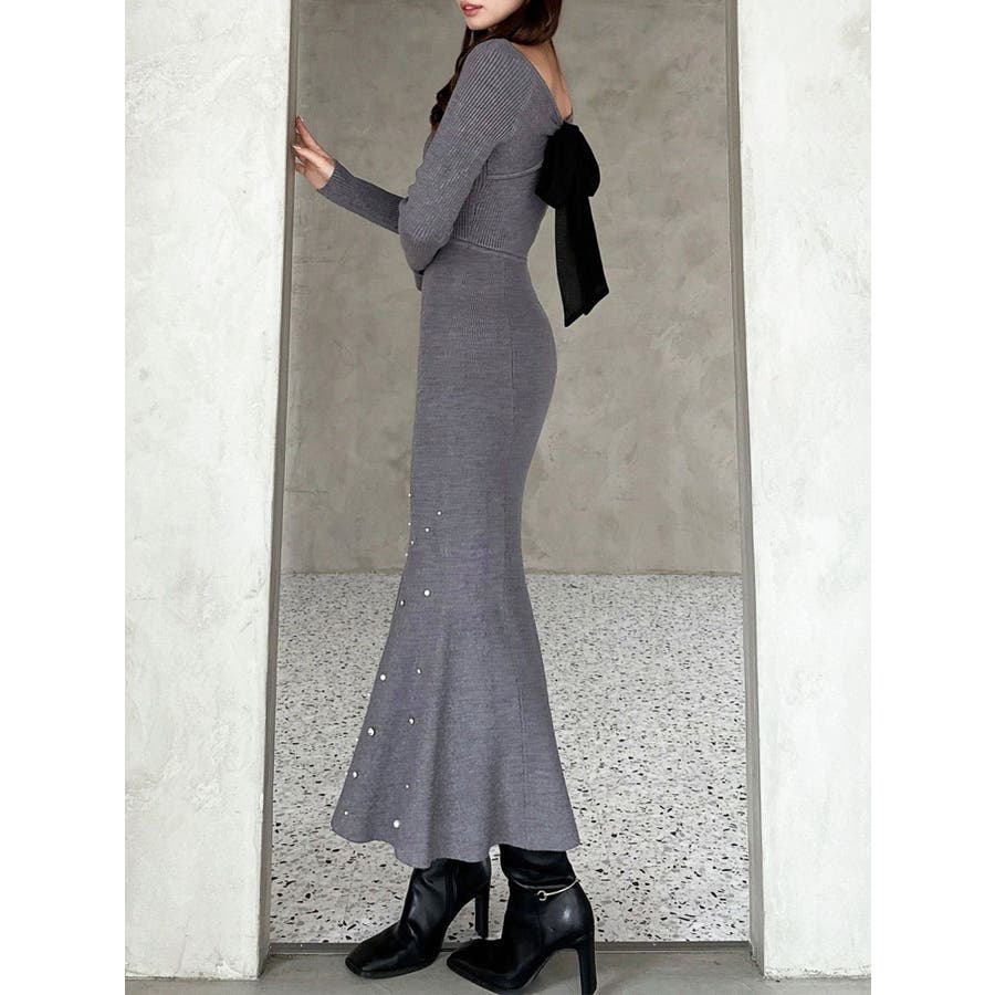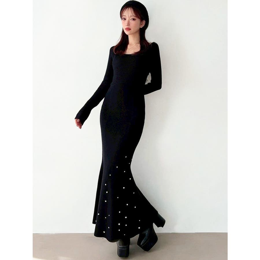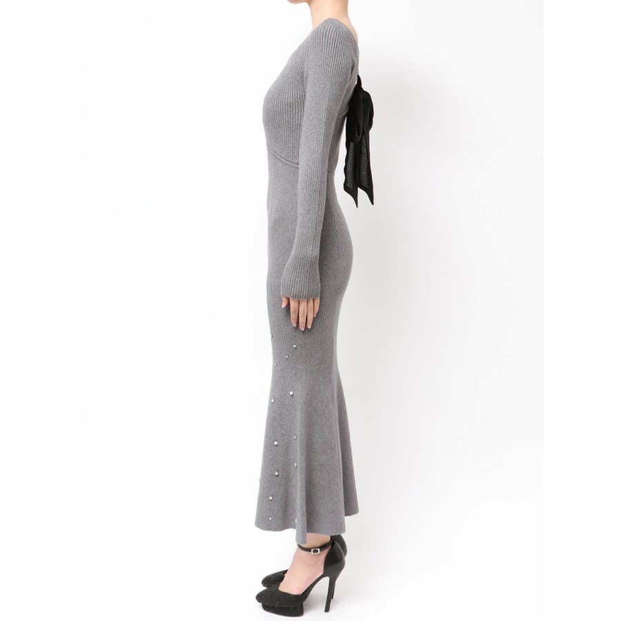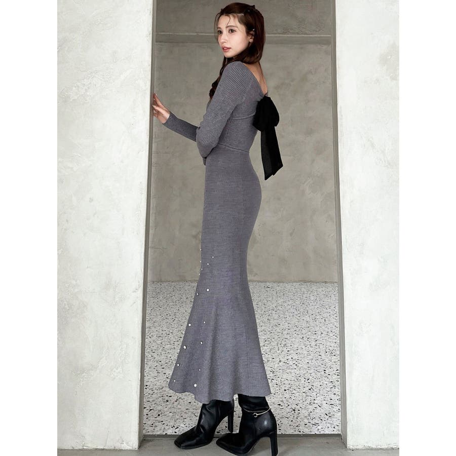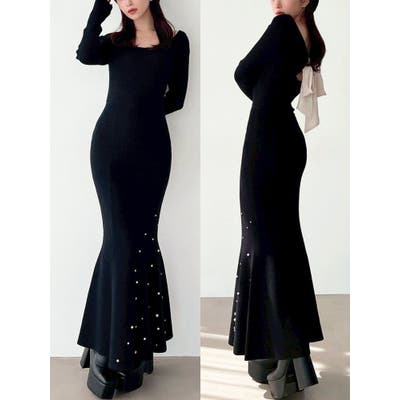 裾にビジューを散りばめたマーメイドワンピース▽デザイン▽裾にビジューとパールを散りばめ、煌めき感のあるワンピース。バックリボンデザインで後ろ姿まで可愛く♪ウエストのカーブ切り替えが着るだけでスタイルアップ見え!マーメイドシルエットが大人の女性らしさをプラスします。▽カラー▽黒・チャコールグレー・ピンクの3色展開。▽スタイリング▽1枚で上品なキレイ目コーデに。マーメイドシルエットなのでショート丈アウターと合わせると着ぶくれ感なくメリハリあるシルエットに。
