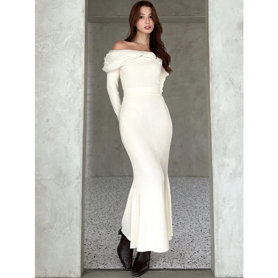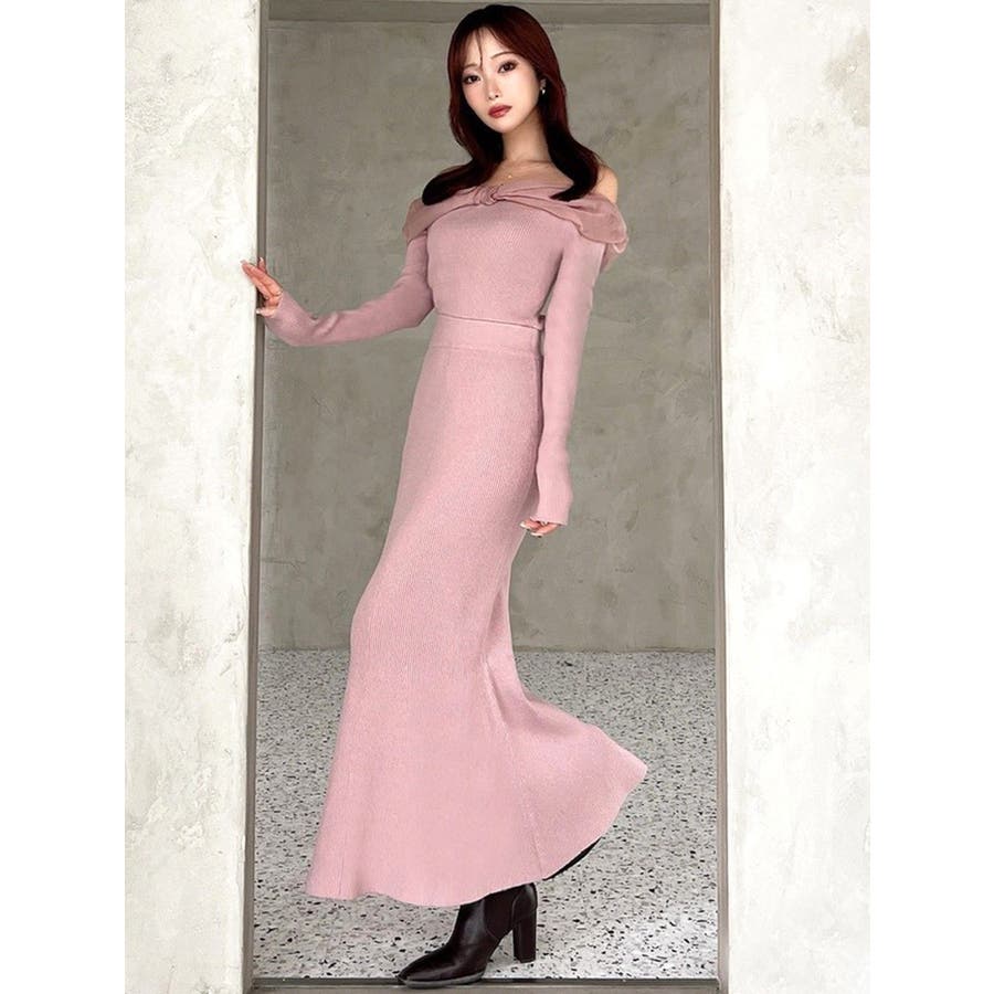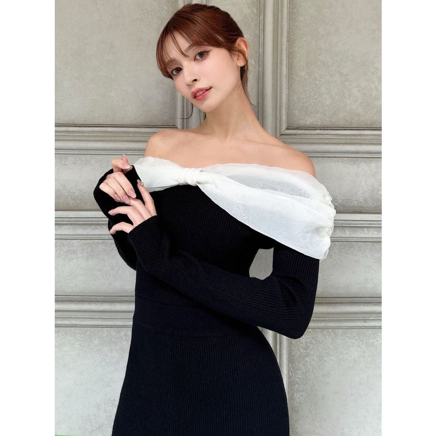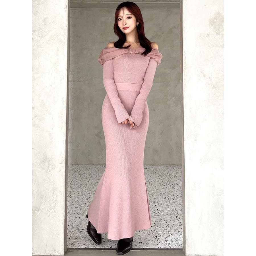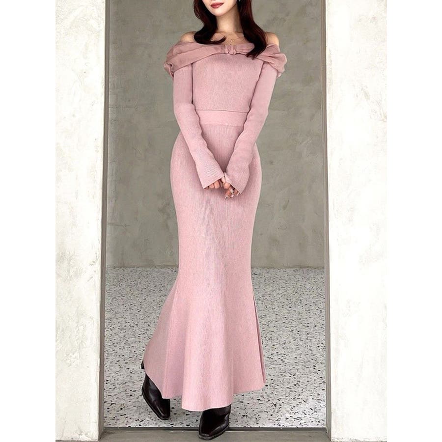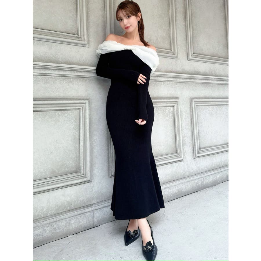 シアーリボンがポイントのマーメイドワンピース▽デザイン▽シアー素材のリボンとピタッとしたマーメイドシルエットが女性らしい雰囲気のワンピースです。オフショルデザインなので、程よい肌見せで抜け感のあるスタイリングに◎▽カラー▽白、黒、ピンクの3色展開。▽スタイリング▽1枚でコーデが決まるワンピースです。足元にはパンプスやショートブーツを合わせたキレイ目なスタイリングがおすすめ◎デートや記念日など特別な日にぴったりのアイテムです。