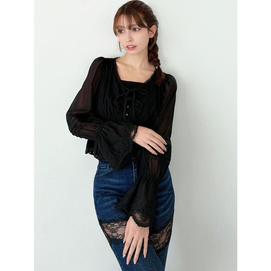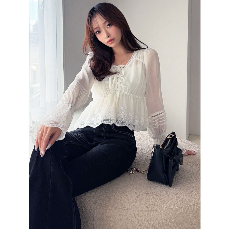 春らしいシフォン素材のブラウス▽デザイン▽ヘルシーなショート丈が新鮮なシフォンブラウス。チュールレースを贅沢に使用し、着るだけで華やかな印象を与えてくれるアイテムです。袖のバルーンデザインが柔らかな女性らしいニュアンスを添え、袖口はゴム仕様で快適な着心地に仕上げました。春にぴったりのさらりと軽やかな着心地です。▽カラー▽白、黒、ピンクの3色展開。▽スタイリング▽1枚で春らしい印象になる華やかなトップス。デニムなどでカジュアルダウンしたスタイリングがおすすめ◎足元はパンプスを合わていただくとバランスのいいコーディネートに仕上がります。