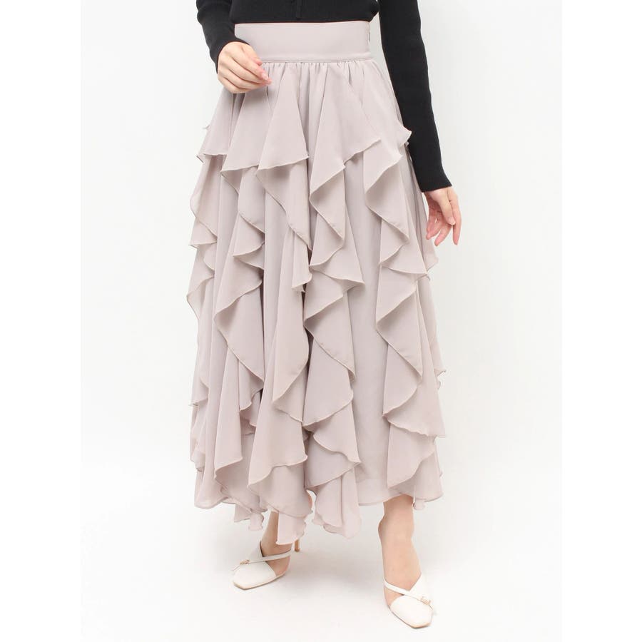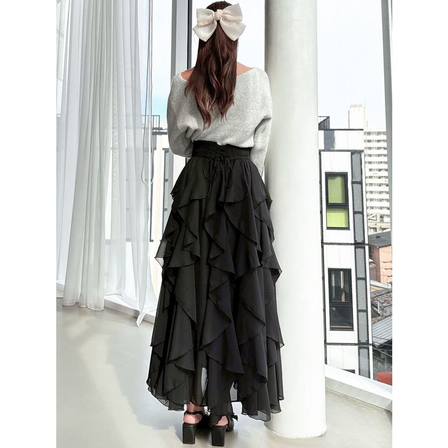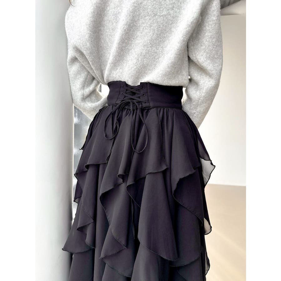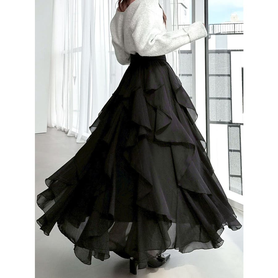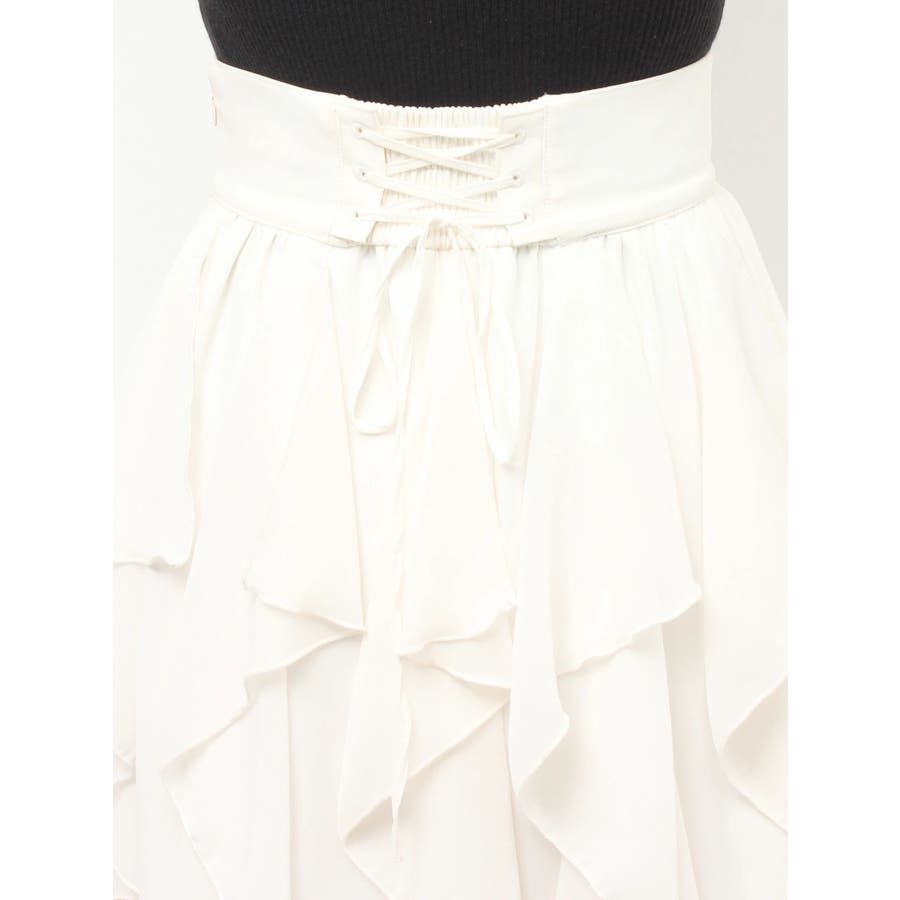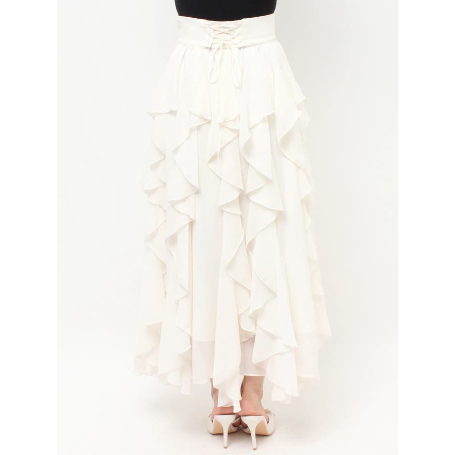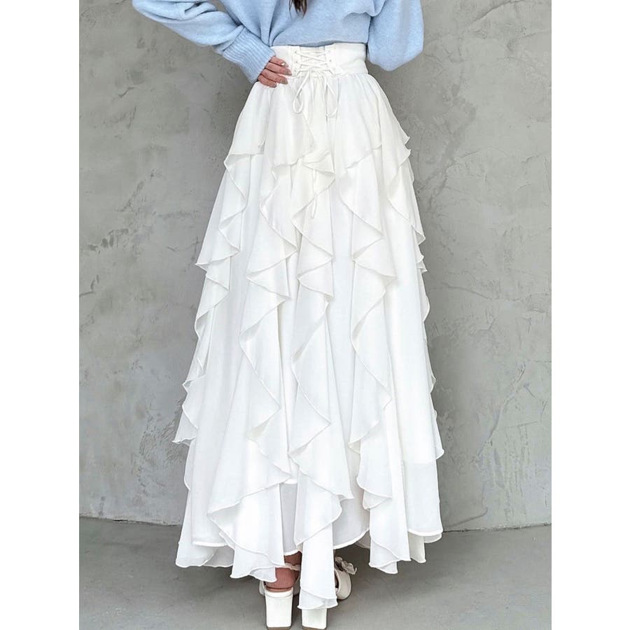 ウエストをギュっと絞れるフレアスカート▽デザイン▽バックウエストはレースアップデザインにしたことで調節でき、ウエストの細見えが叶う1枚。たっぷりとシフォン生地を使用したフレアスカートで、カスケードデザインでボリューム感もありながらフリルの動きのあるデザインで女性らしいスカートに。動くたびにフワッとしたシルエットになり春らしい華やかさをコーデにプラスします。ボリューム感がありながらも透け感のある生地で軽やかな印象に仕上げました。▽カラー▽白・黒・ベージュの3色展開。▽スタイリング▽ニットからブラウスまで様々なトップスと好相性。コーデの主役になるスカートで春先まで長く活躍します♪