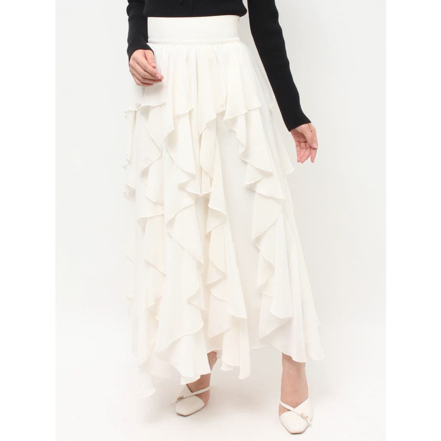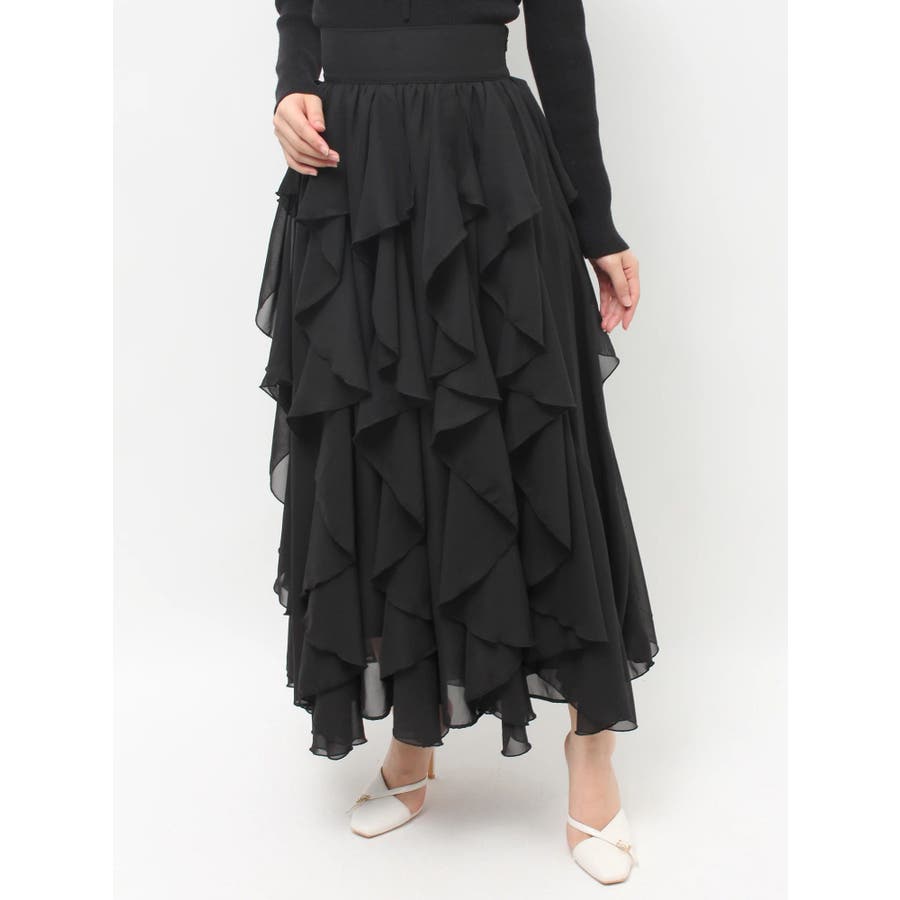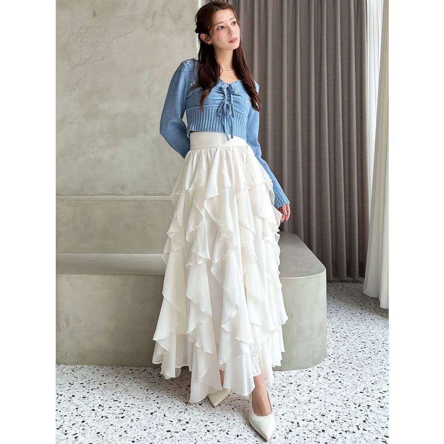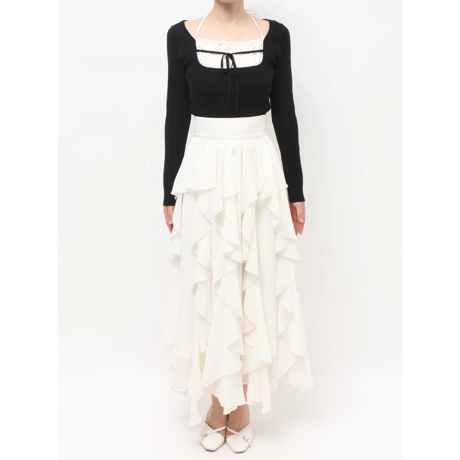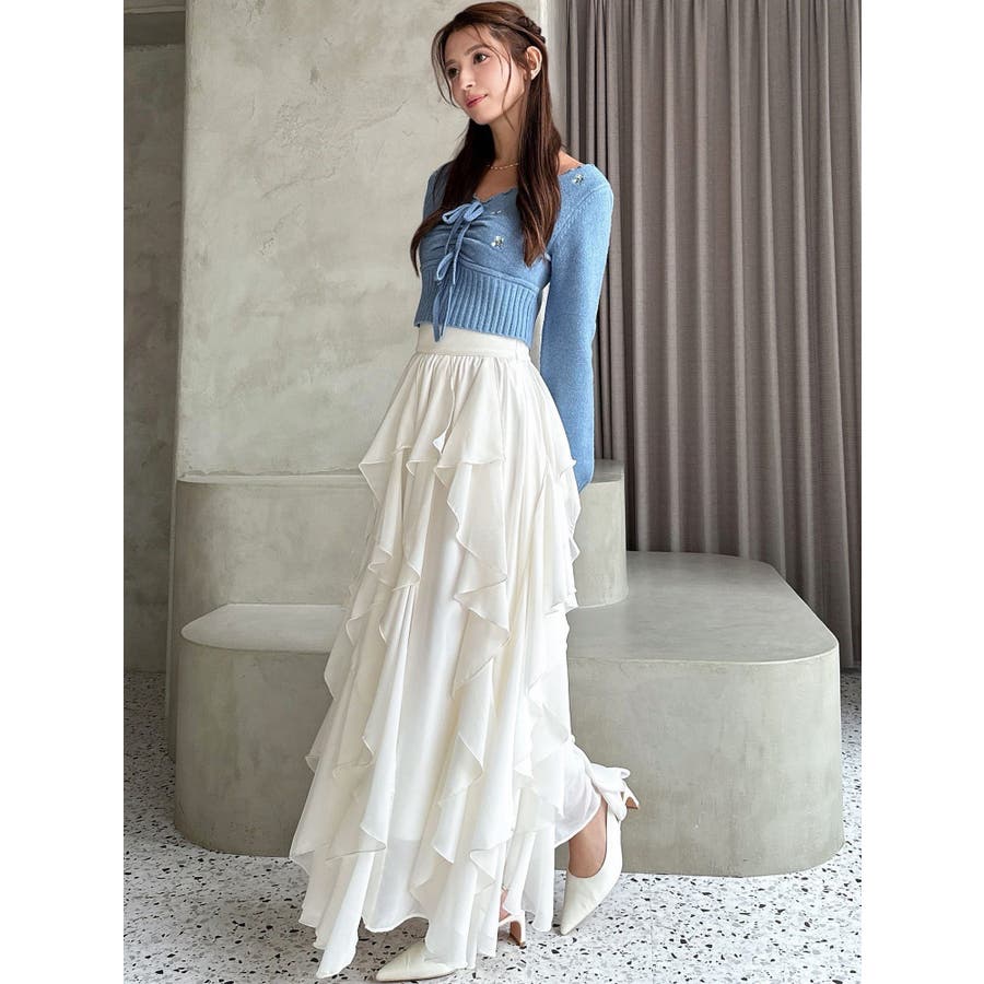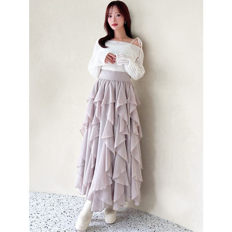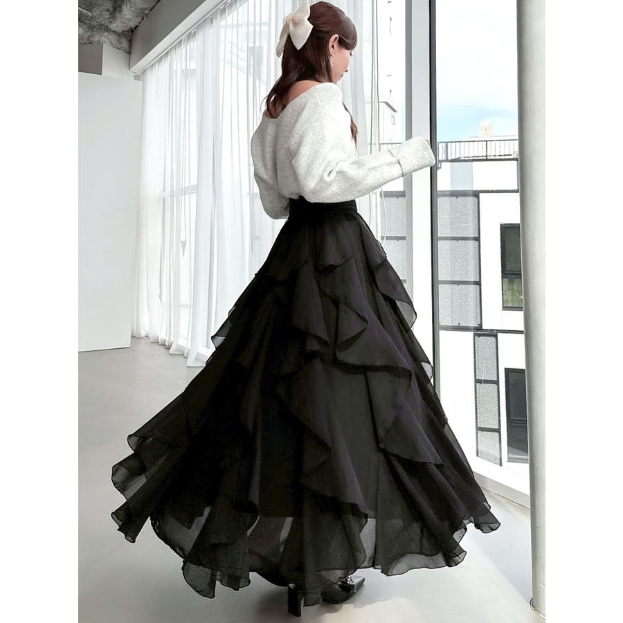 ウエストをギュっと絞れるフレアスカート▽デザイン▽バックウエストはレースアップデザインにしたことで調節でき、ウエストの細見えが叶う1枚。たっぷりとシフォン生地を使用したフレアスカートで、カスケードデザインでボリューム感もありながらフリルの動きのあるデザインで女性らしいスカートに。動くたびにフワッとしたシルエットになり春らしい華やかさをコーデにプラスします。ボリューム感がありながらも透け感のある生地で軽やかな印象に仕上げました。▽カラー▽白・黒・ベージュの3色展開。▽スタイリング▽ニットからブラウスまで様々なトップスと好相性。コーデの主役になるスカートで春先まで長く活躍します♪