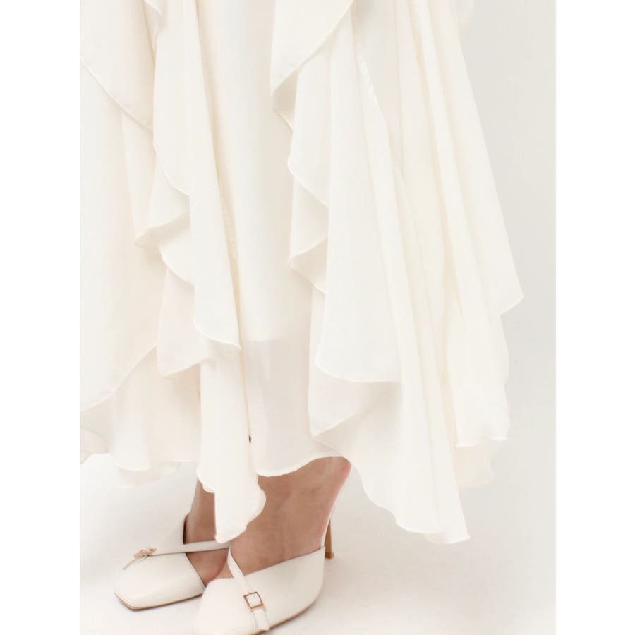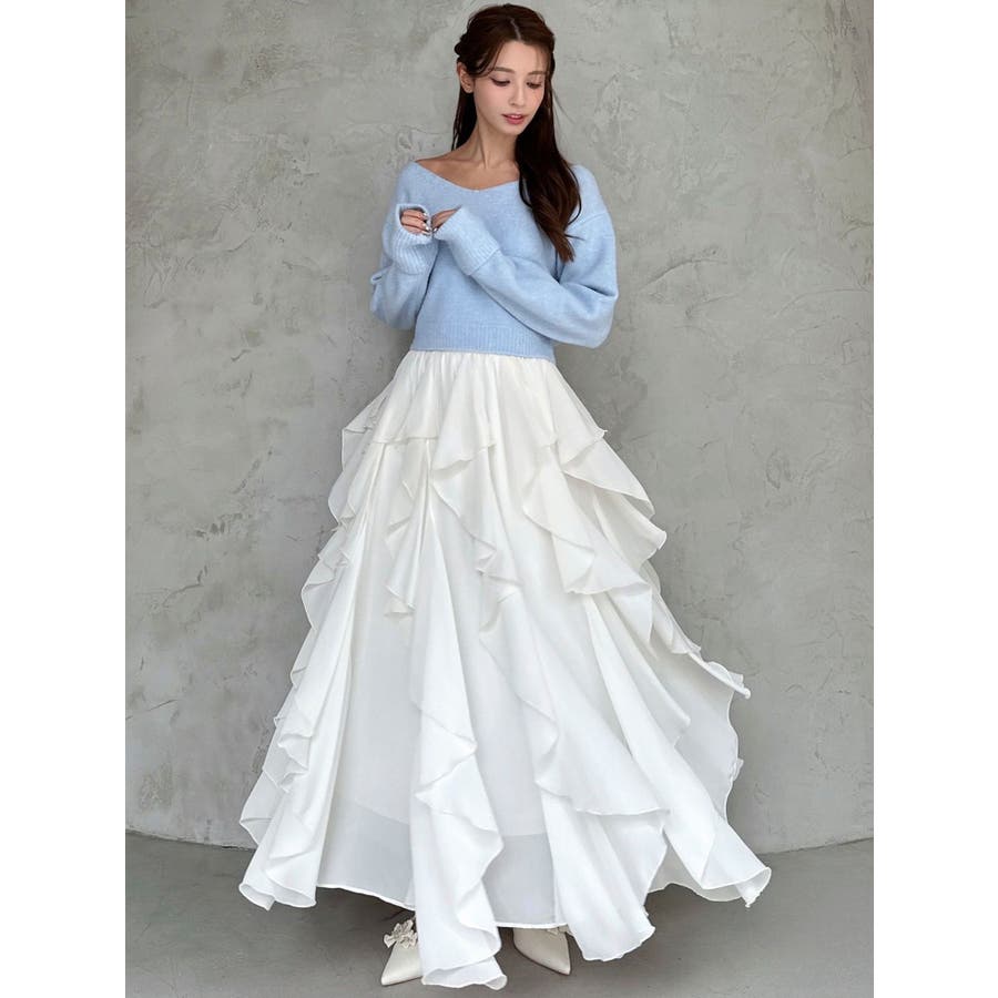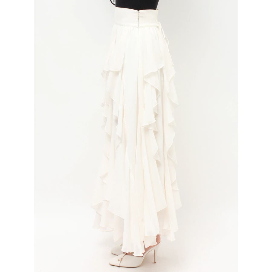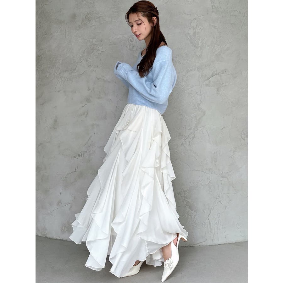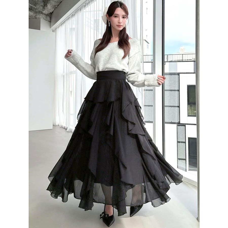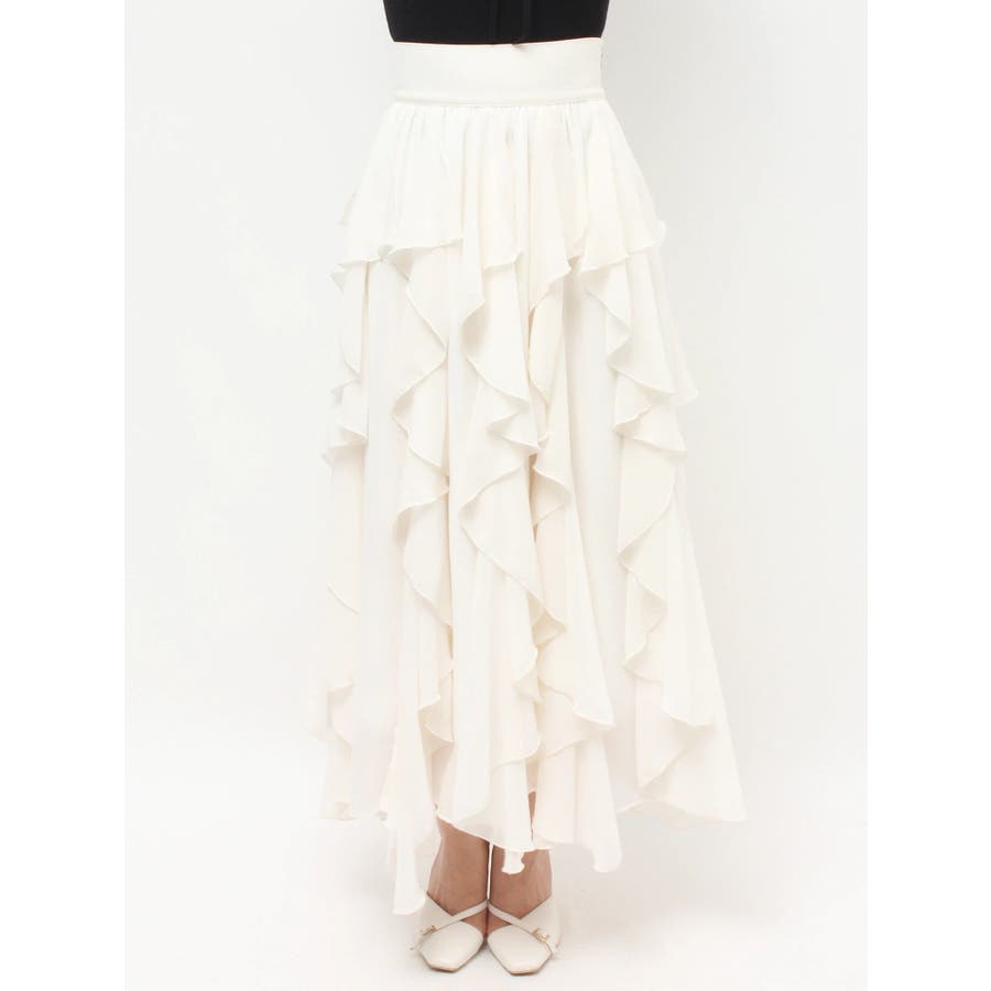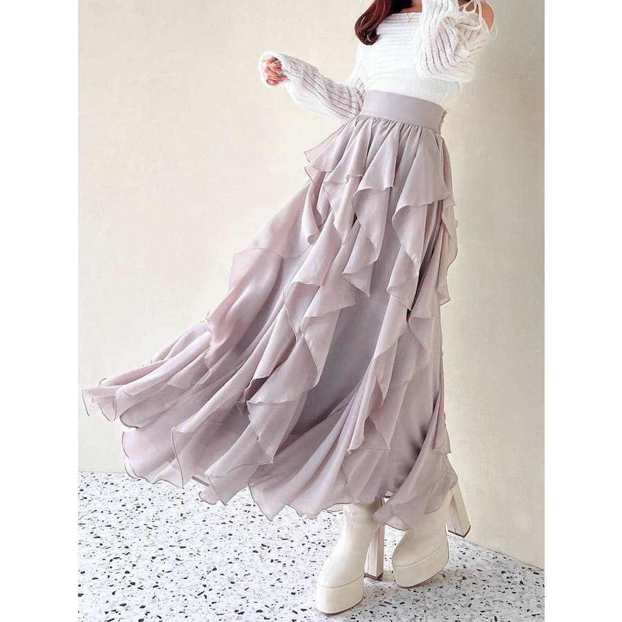 ウエストをギュっと絞れるフレアスカート▽デザイン▽バックウエストはレースアップデザインにしたことで調節でき、ウエストの細見えが叶う1枚。たっぷりとシフォン生地を使用したフレアスカートで、カスケードデザインでボリューム感もありながらフリルの動きのあるデザインで女性らしいスカートに。動くたびにフワッとしたシルエットになり春らしい華やかさをコーデにプラスします。ボリューム感がありながらも透け感のある生地で軽やかな印象に仕上げました。▽カラー▽白・黒・ベージュの3色展開。▽スタイリング▽ニットからブラウスまで様々なトップスと好相性。コーデの主役になるスカートで春先まで長く活躍します♪