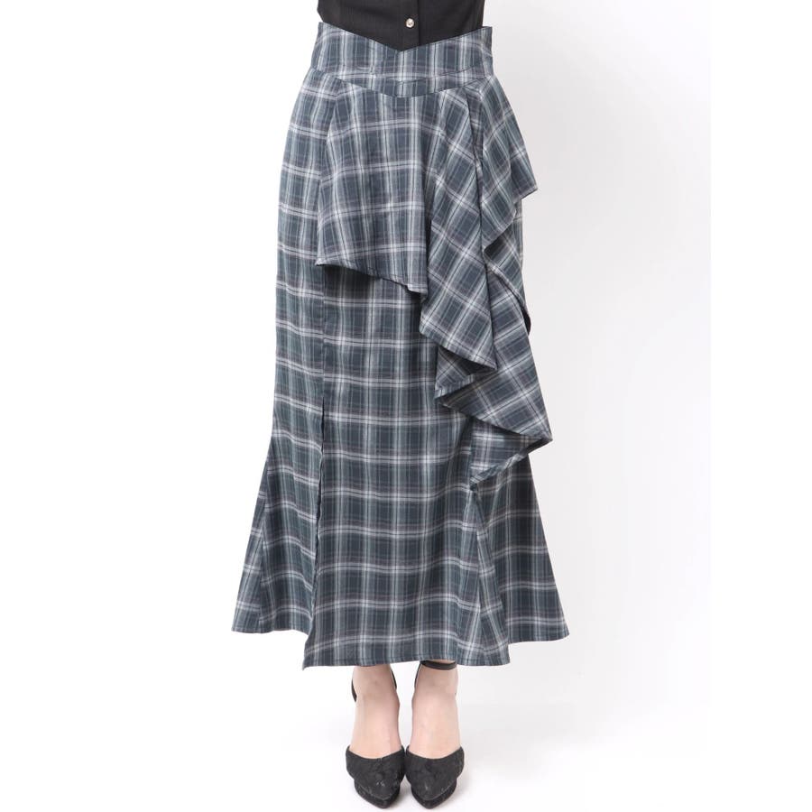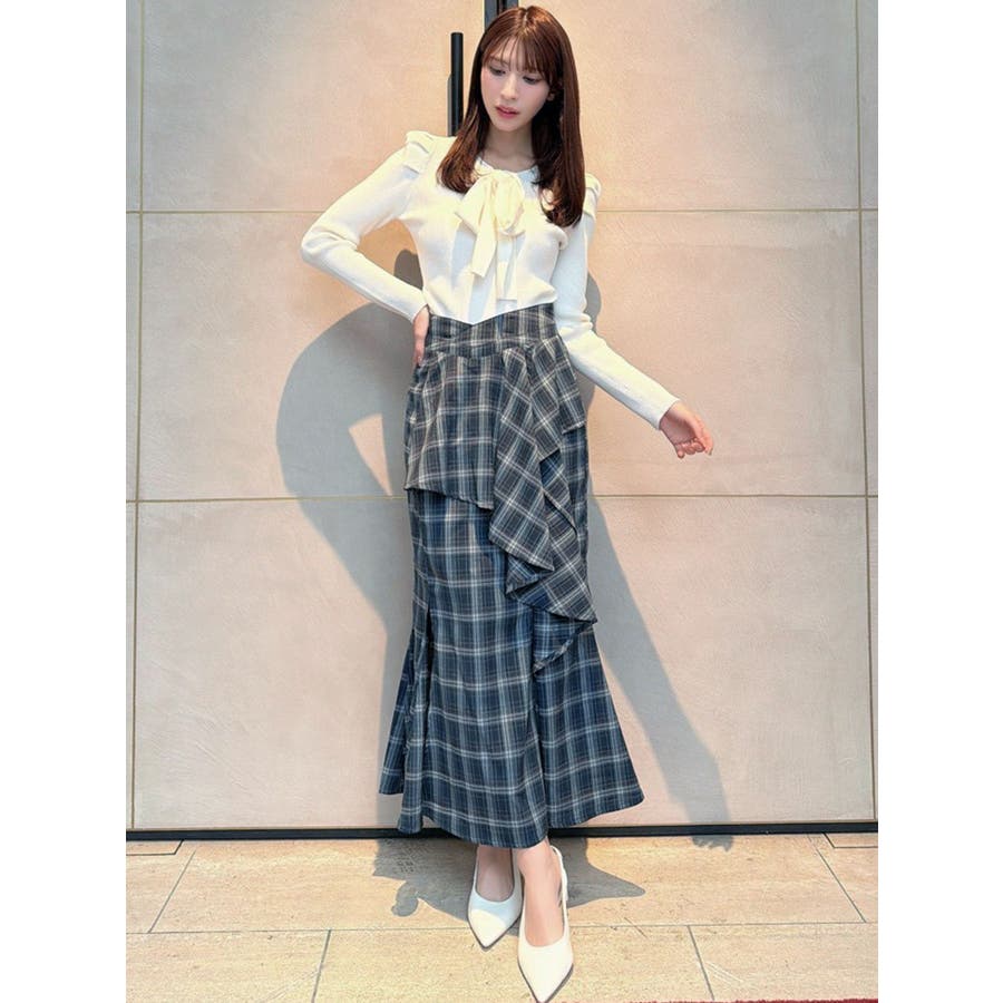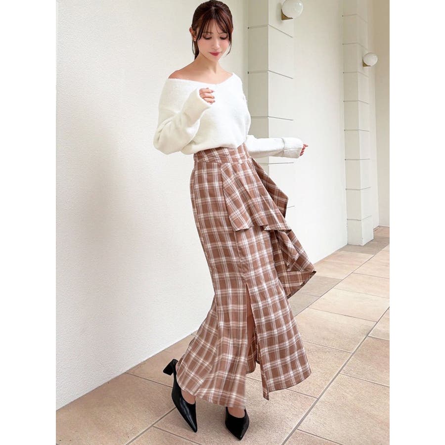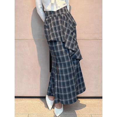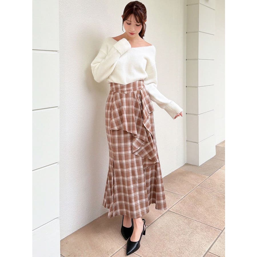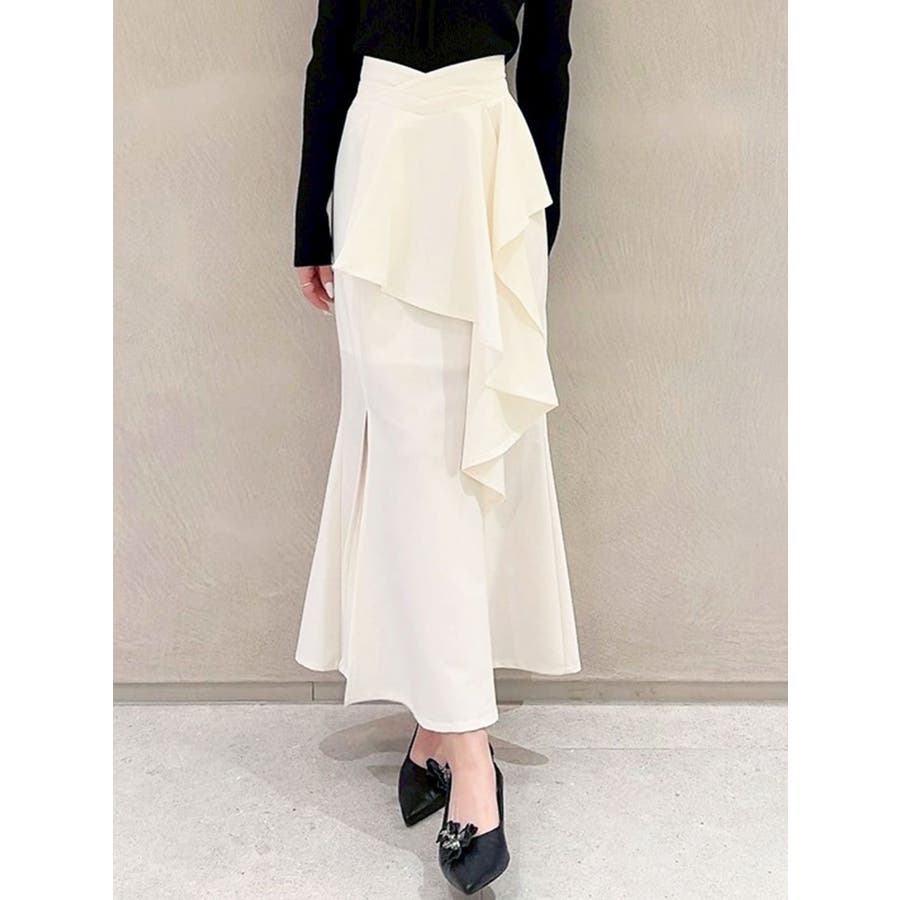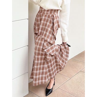 ラッフルデザインが華やかさをプラスするマーメイドスカート▽デザイン▽アシンメトリーなラッフルデザインがポイント!ハイウエストでウエストラインはV字になっているためウエストの細見え効果がUP◎裾に向かってゆるやかに広がるマーメイドシルエットで大人な女性らしい雰囲気をプラスします。▽カラー▽ベーシックで使いやすい無地の白と、チェック柄のネイビー・ベージュの3色展開。▽スタイリング▽ベーシックなスカートなので1枚持っているとシーズンレスに活躍します。ブラウスやニットなどどんなトップスにもマッチし、デイリーからオフィスコーデまで様々なシーンに幅広く活躍します。