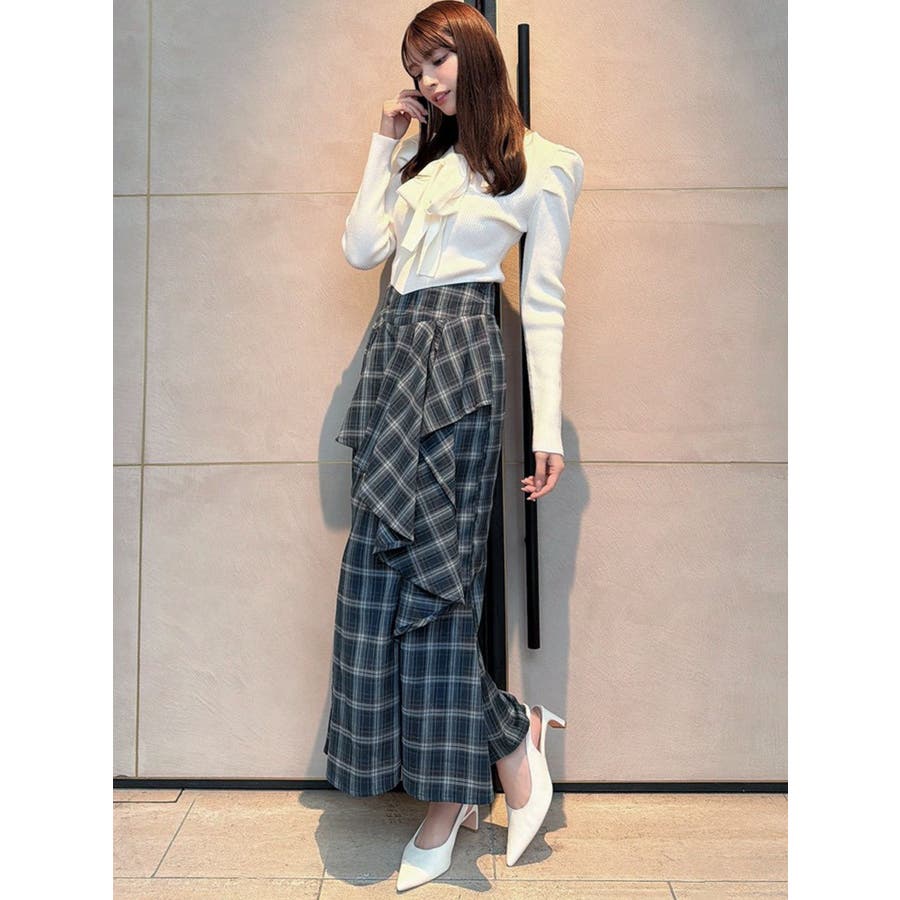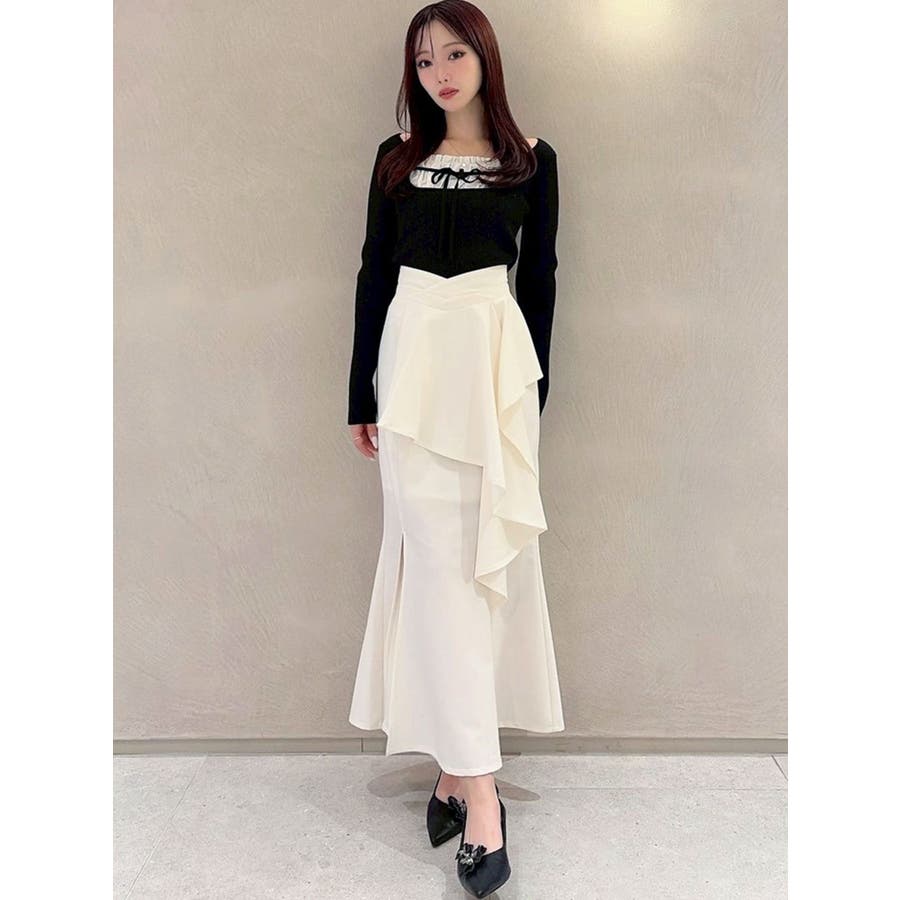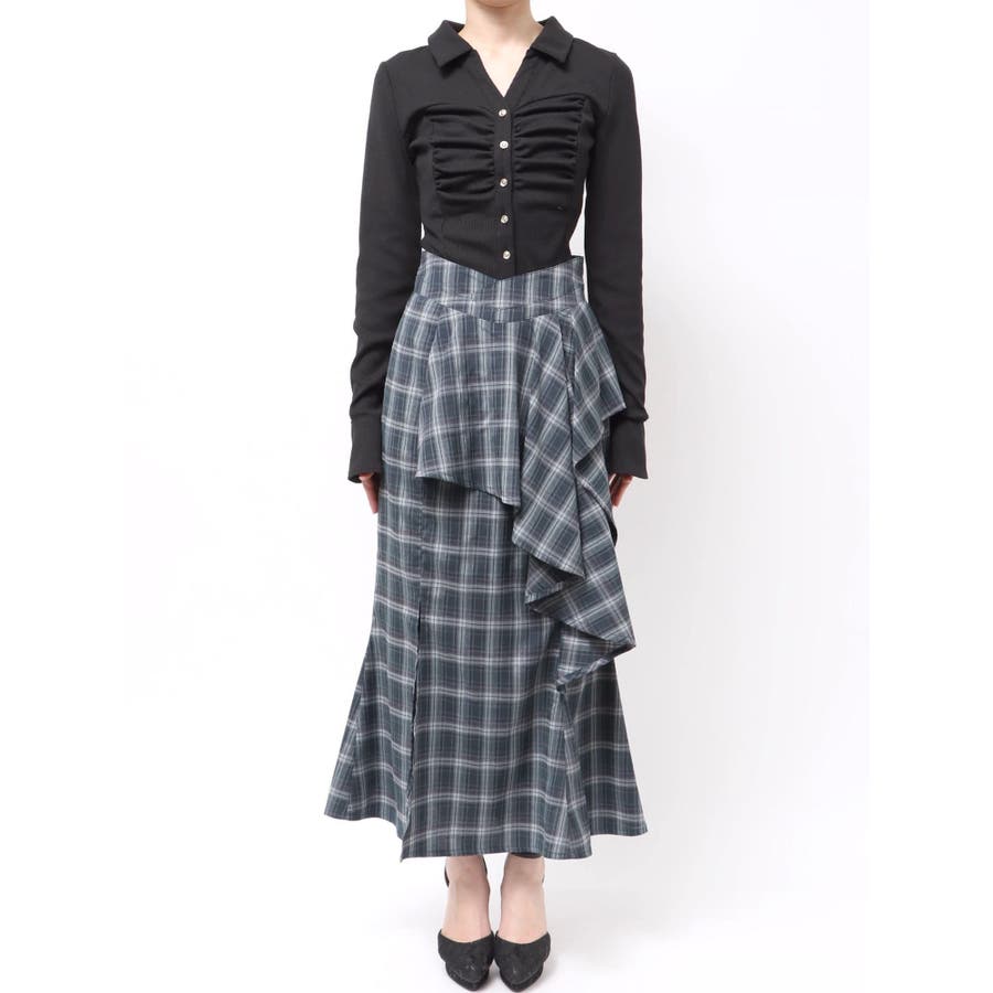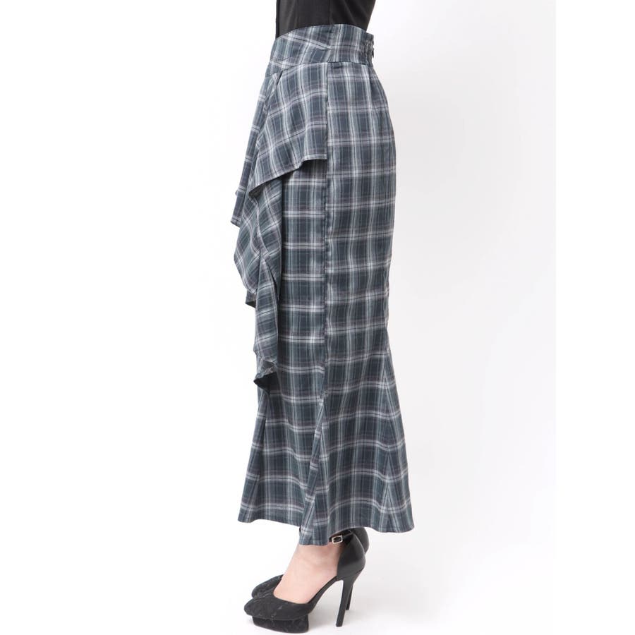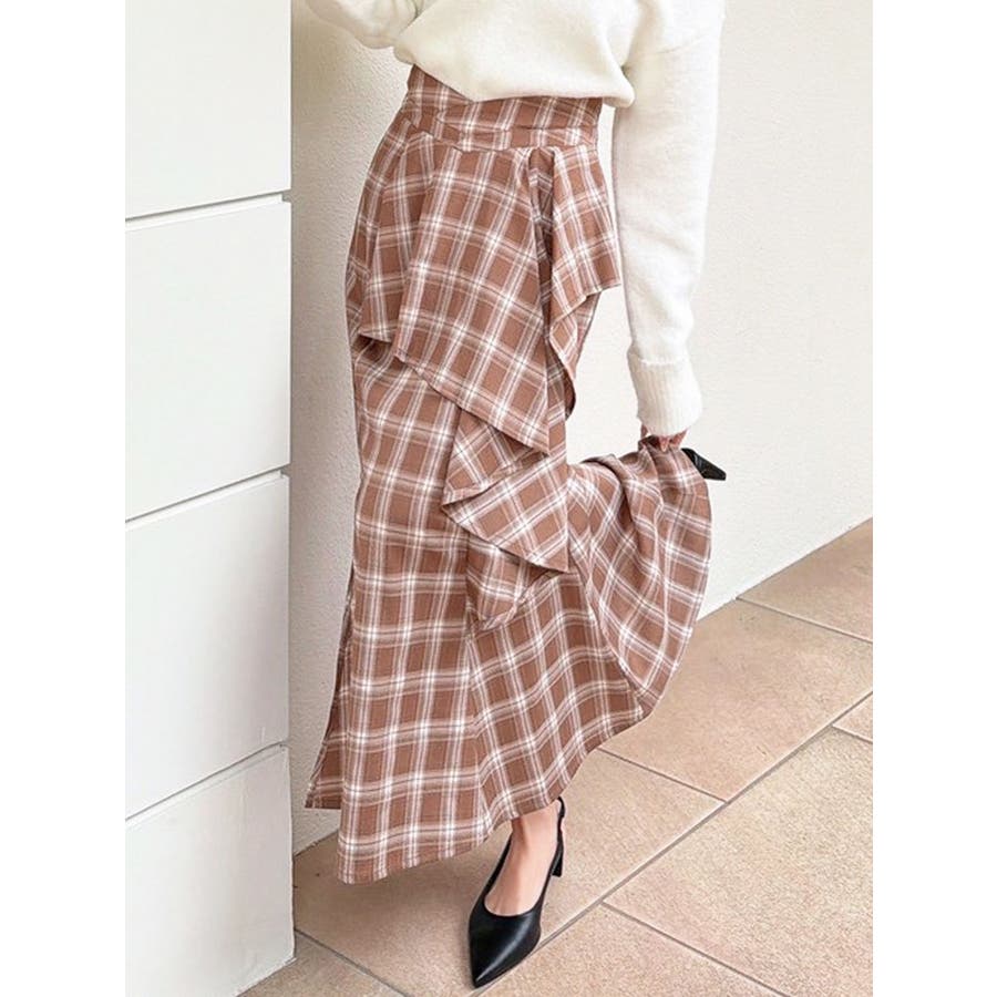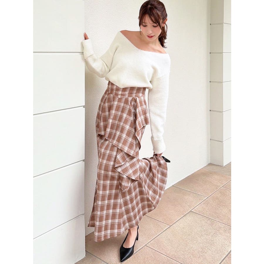ラッフルデザインが華やかさをプラスするマーメイドスカート▽デザイン▽アシンメトリーなラッフルデザインがポイント!ハイウエストでウエストラインはV字になっているためウエストの細見え効果がUP◎裾に向かってゆるやかに広がるマーメイドシルエットで大人な女性らしい雰囲気をプラスします。▽カラー▽ベーシックで使いやすい無地の白と、チェック柄のネイビー・ベージュの3色展開。▽スタイリング▽ベーシックなスカートなので1枚持っているとシーズンレスに活躍します。ブラウスやニットなどどんなトップスにもマッチし、デイリーからオフィスコーデまで様々なシーンに幅広く活躍します。