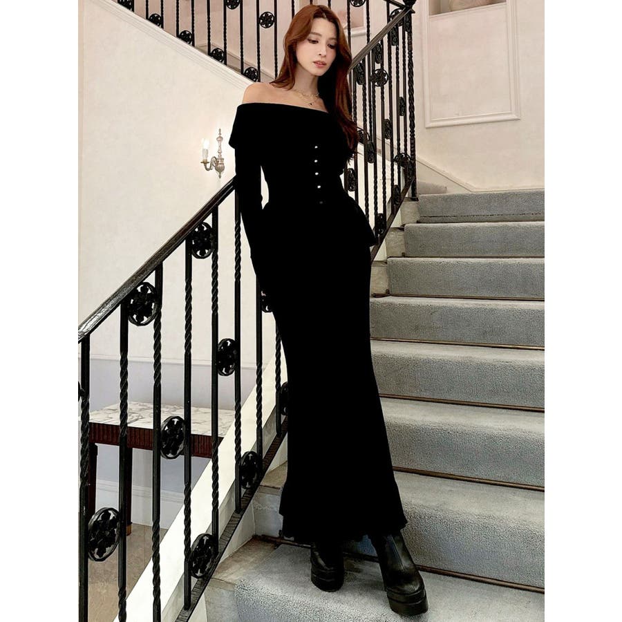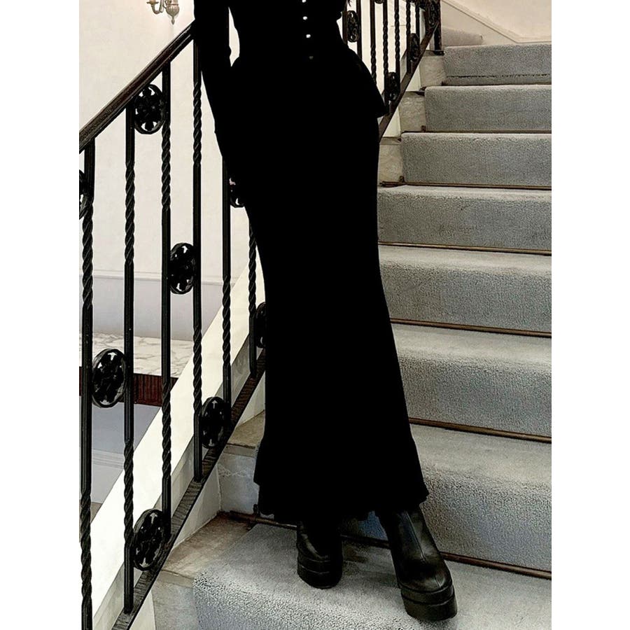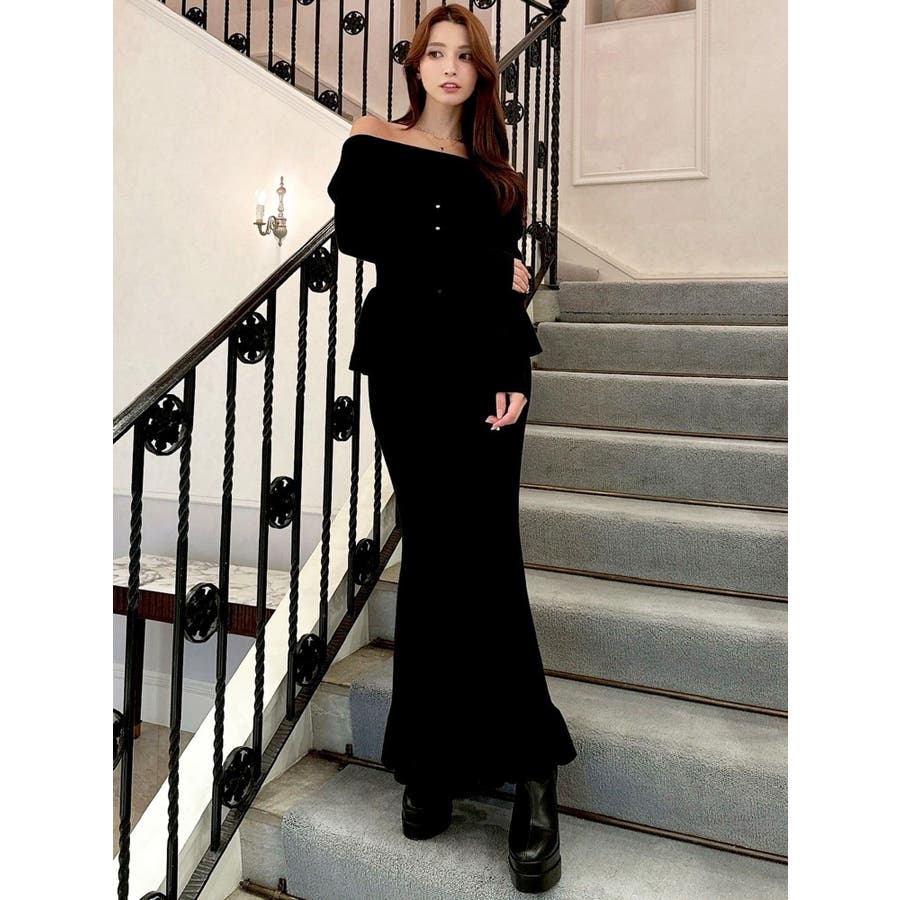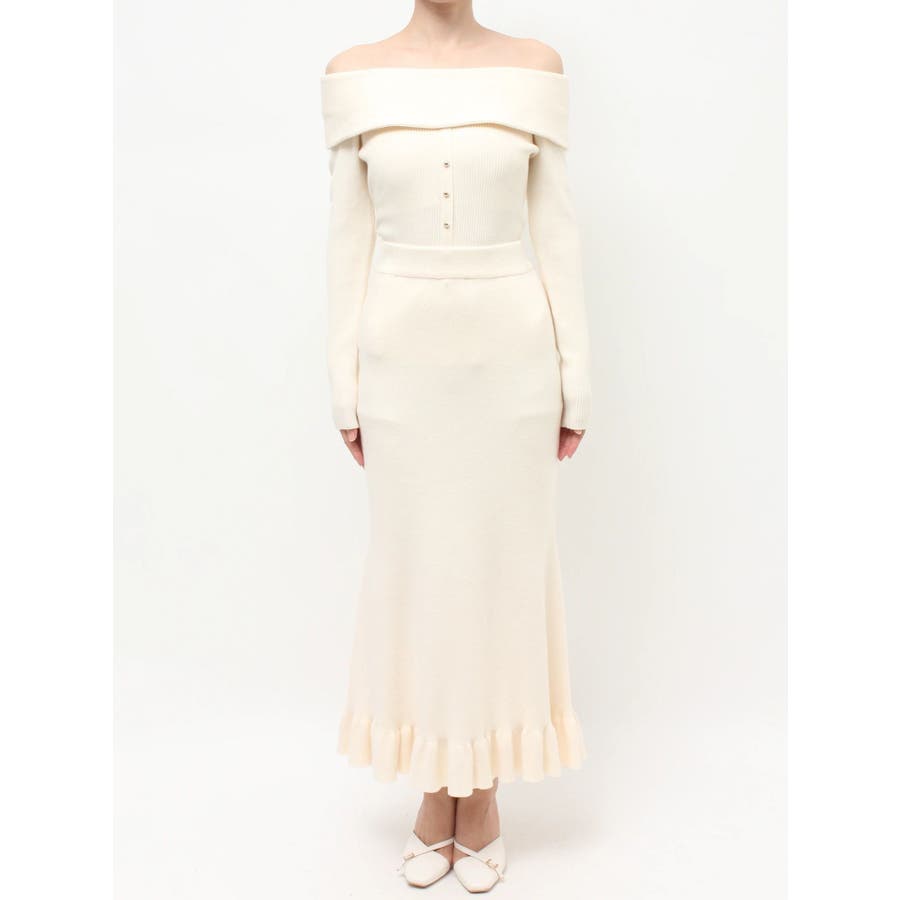 ボディラインが綺麗に見えるマーメイドシルエットのニットスカート▽デザイン▽Iラインに近いゆるやかなマーメイドシルエットにすることでボディラインを拾いすぎずタイトな印象に仕上げました。裾はフリルデザインにしたことで可愛らしい印象に。ハイウエストでウエストはゴム仕様になっているのでスタイルアップしつつストレスフリーに着用できます♪▽カラー▽白・黒の2色展開。▽スタイリング▽同色のオフショルニットと合わせれば女性らしい雰囲気のセットアップコーデが完成◎シンプルなデザインのスカートなのでお持ちのトップスとも合わせやすく、ロングシーズン活躍すること間違いなし!【セットアップアイテムはコチラ】>>オフショルペプラムニットトップス