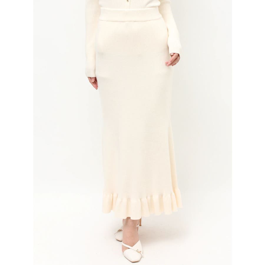 ボディラインが綺麗に見えるマーメイドシルエットのニットスカート▽デザイン▽Iラインに近いゆるやかなマーメイドシルエットにすることでボディラインを拾いすぎずタイトな印象に仕上げました。裾はフリルデザインにしたことで可愛らしい印象に。ハイウエストでウエストはゴム仕様になっているのでスタイルアップしつつストレスフリーに着用できます♪▽カラー▽白・黒の2色展開。▽スタイリング▽同色のオフショルニットと合わせれば女性らしい雰囲気のセットアップコーデが完成◎シンプルなデザインのスカートなのでお持ちのトップスとも合わせやすく、ロングシーズン活躍すること間違いなし!【セットアップアイテムはコチラ】>>オフショルペプラムニットトップス※着用画像はフラッシュの加減で実際の製品と色味等が異なる場合がございますので、生地のズームアップ画像をご確認ください。※ご利用の端末画面の設定により実際の商品と色味が異なる場合がございます。【商品特徴】透け感:なし伸縮性:あり生地の厚さ:普通サイズ感:普通裏地:なしポケット:なし