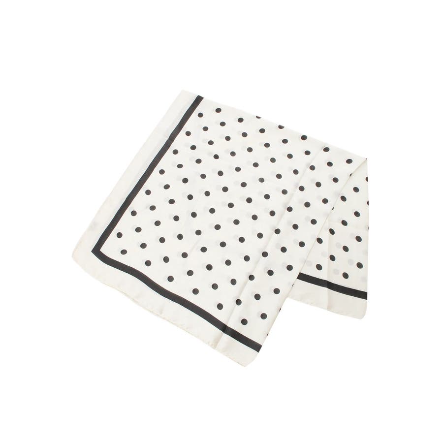 ドット柄が可愛い大判スカーフ▽デザイン▽光沢感と表面感のある美しい生地で、コーデのポイント使いがしやすいクラシカルなドット柄。バッグにつけたりヘアアレンジに使ったり、様々な使い方が可能です♪大判サイズなので首巻きや肩がけなどファッションにも取り入れやすいサイズ感で一気にトレンドスタイルが作れるアイテム。白・黒のベーシックカラーです。