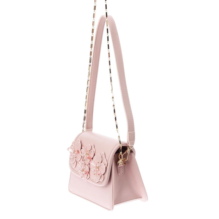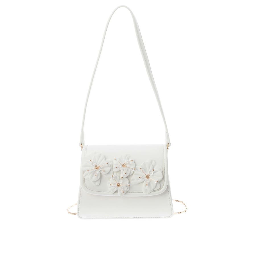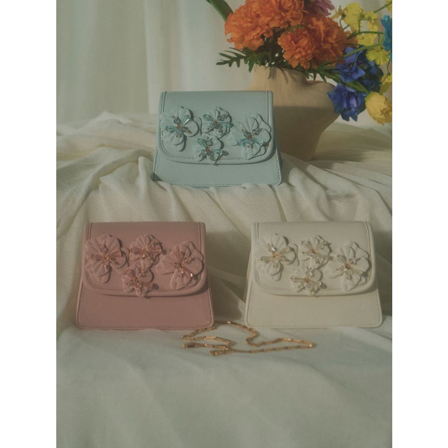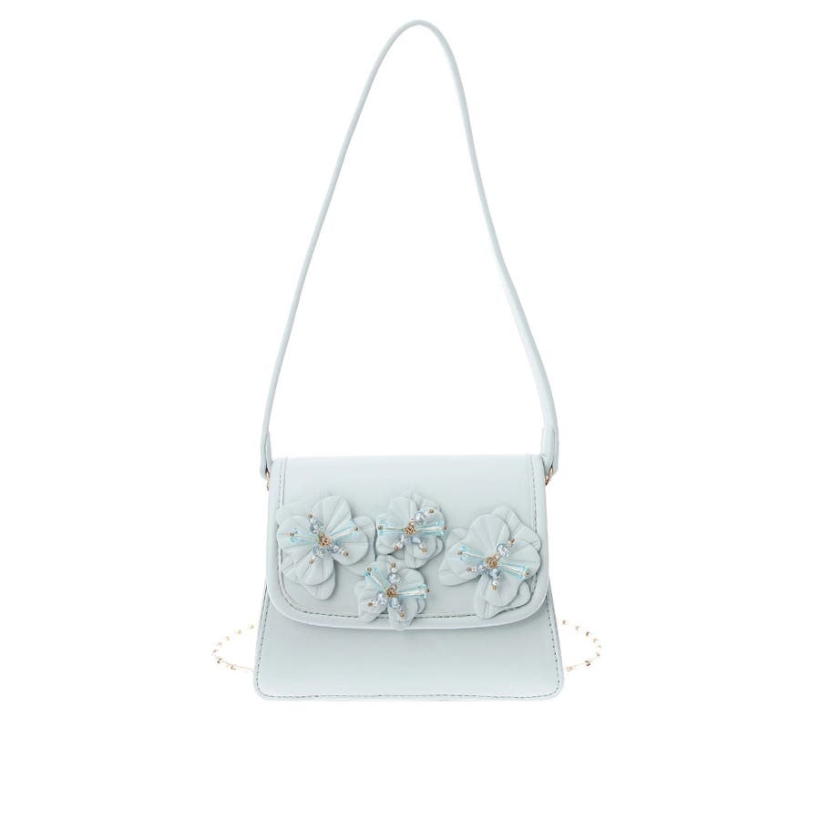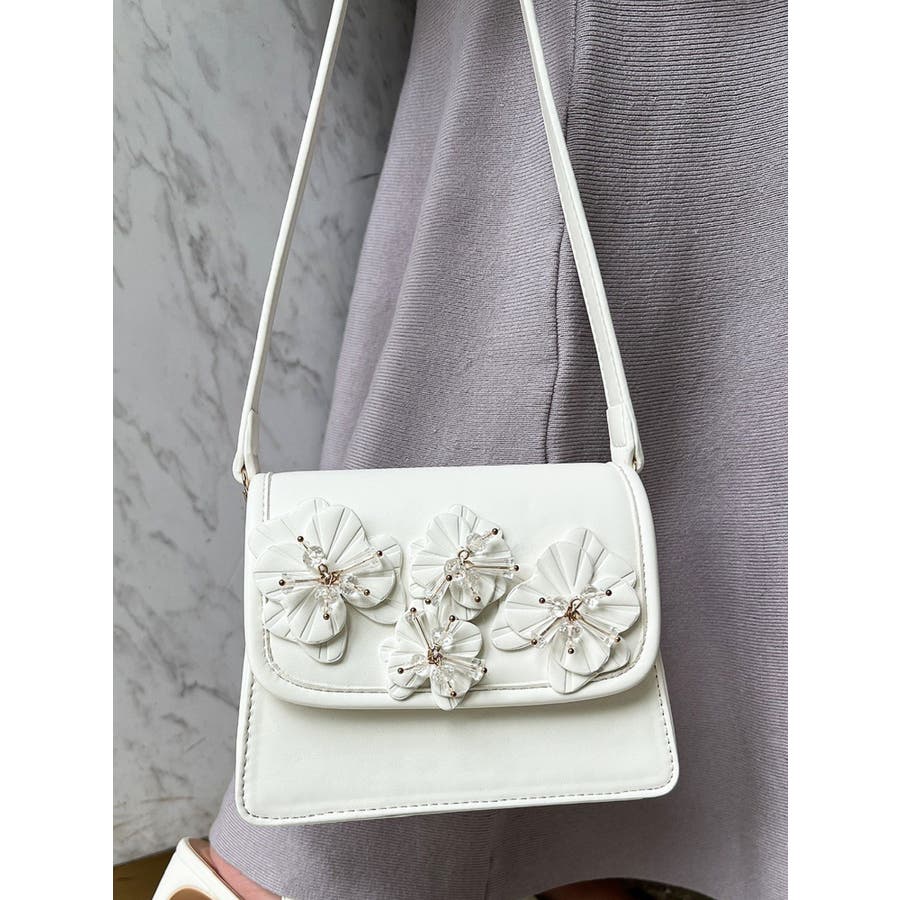 立体的なフラワーモチーフがポイントのコンパクトバッグ▽デザイン▽上品な光沢のフェイクレザー生地で華やかさUP。フラワーモチーフにはクリア素材のビーズを付けたことで立体的なデザインに仕上げました。ショルダーバッグとしてもハンドバッグとしても使える2WAY仕様♪普段のお出かけにはもちろん、パーティーシーンやオケージョン等にもお使いいただけるバッグです。▽カラー▽白・青・ピンクの3色展開。