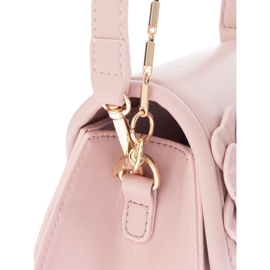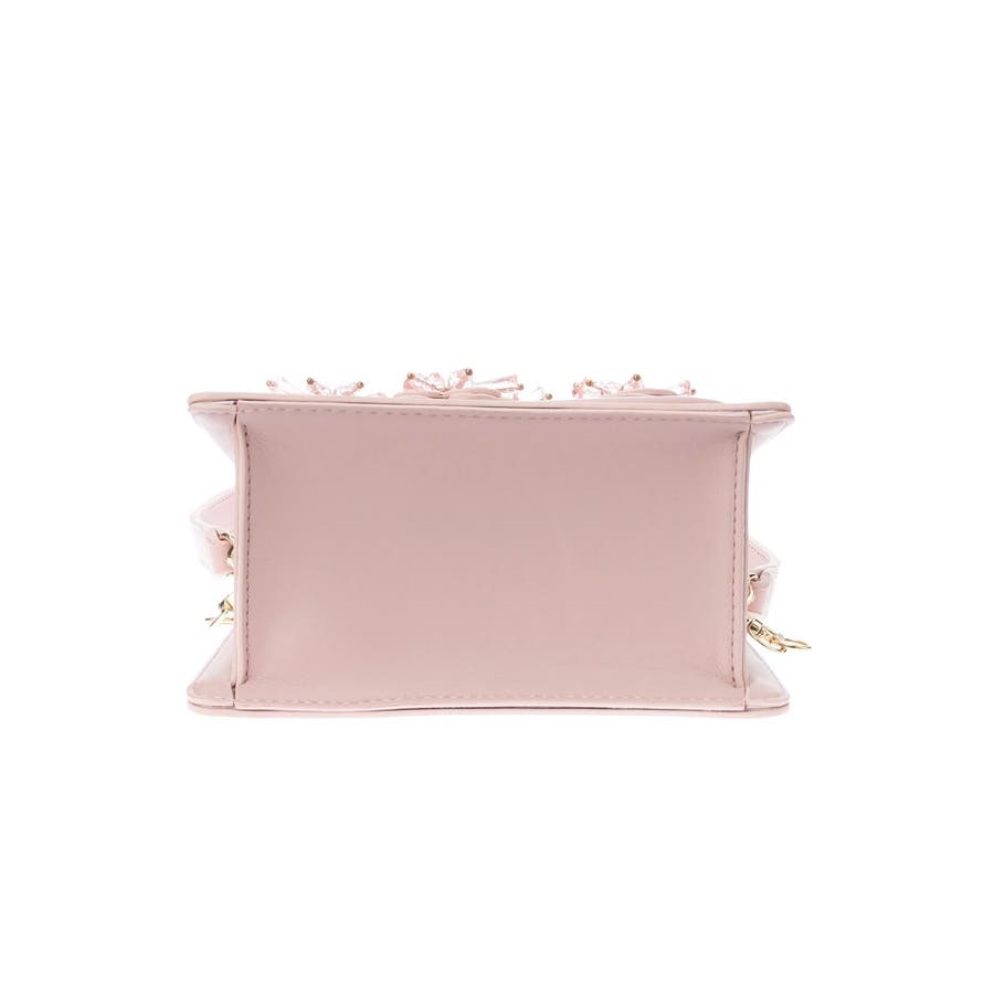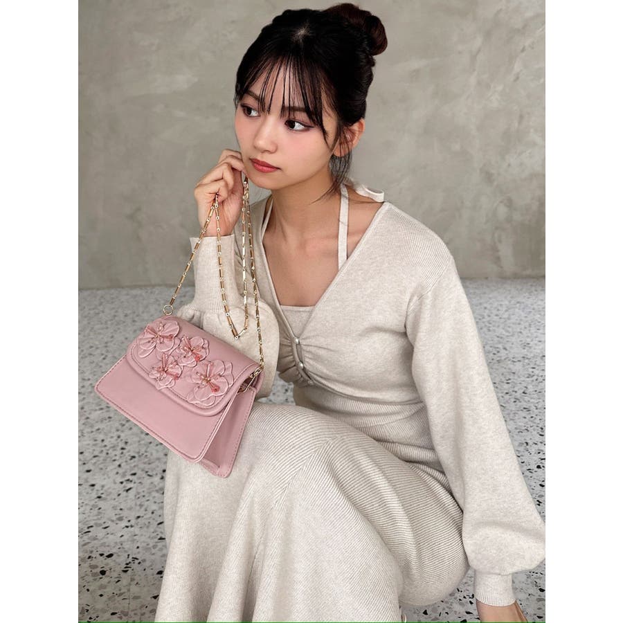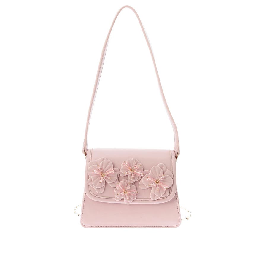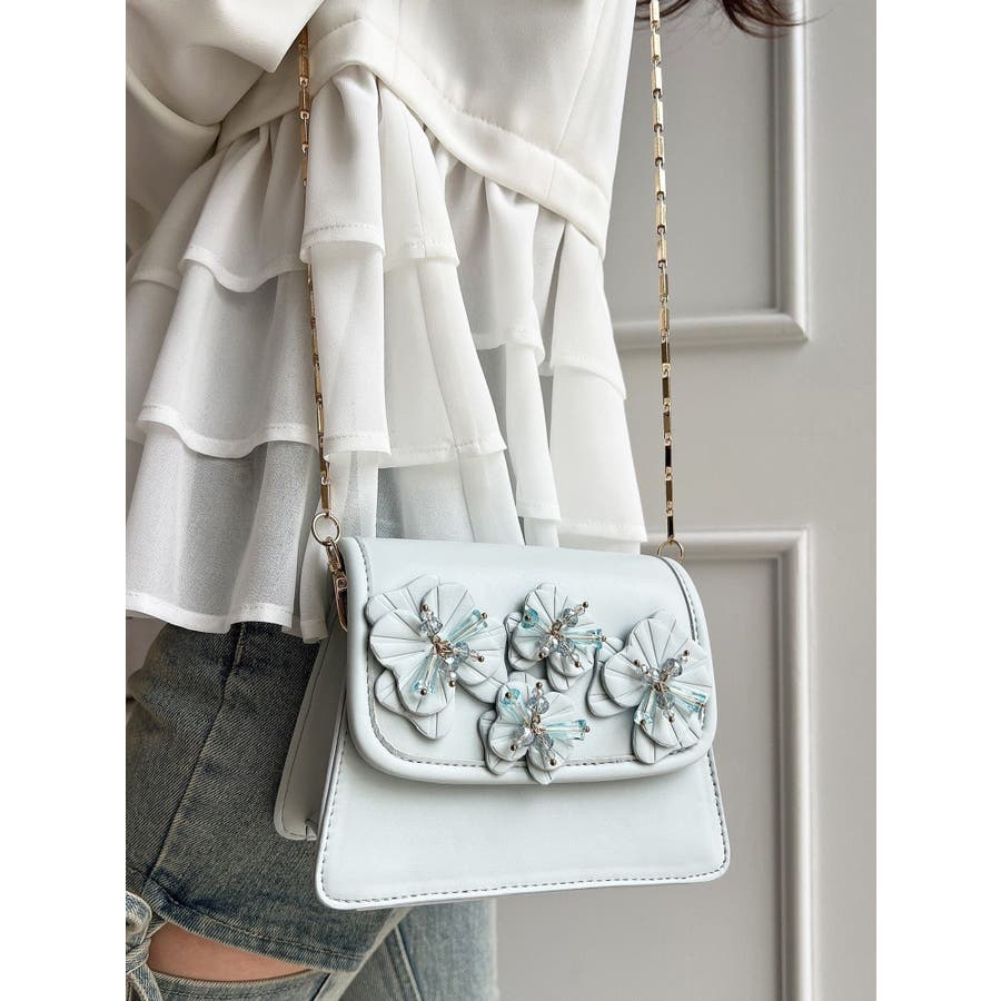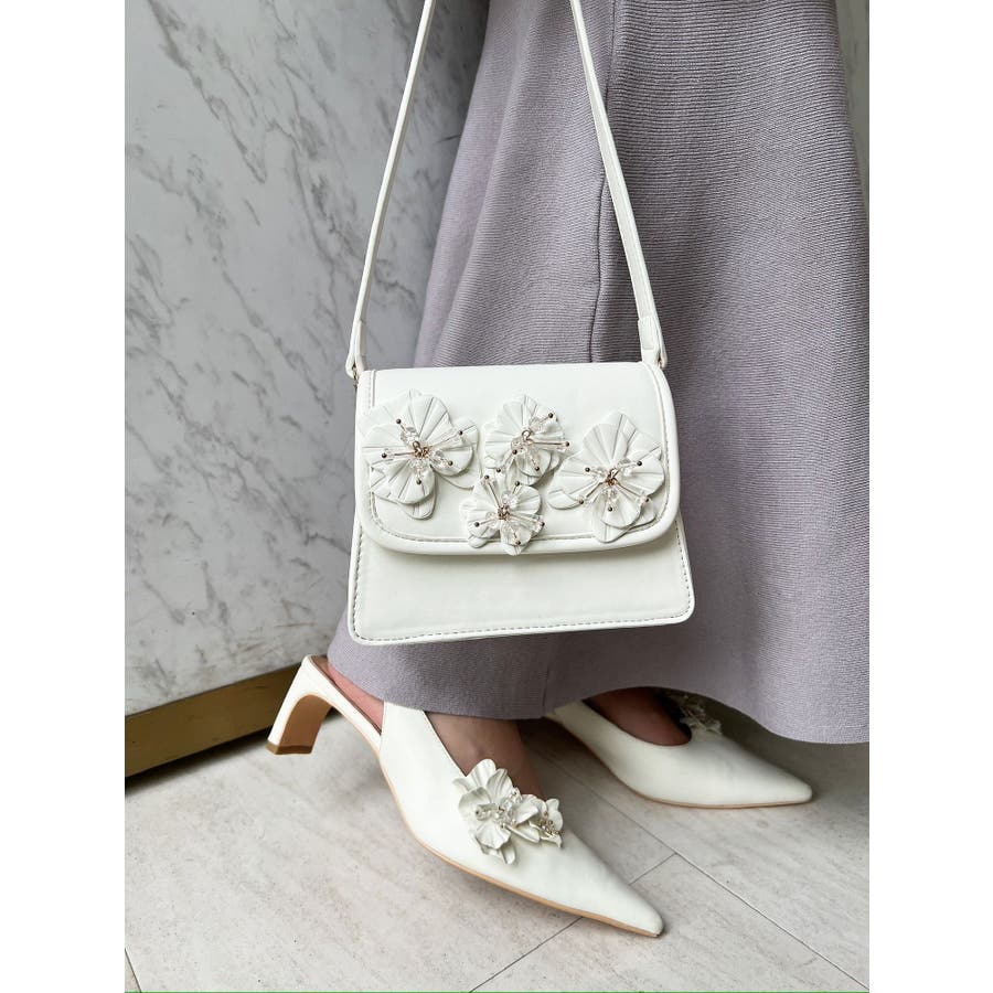 立体的なフラワーモチーフがポイントのコンパクトバッグ▽デザイン▽上品な光沢のフェイクレザー生地で華やかさUP。フラワーモチーフにはクリア素材のビーズを付けたことで立体的なデザインに仕上げました。ショルダーバッグとしてもハンドバッグとしても使える2WAY仕様♪普段のお出かけにはもちろん、パーティーシーンやオケージョン等にもお使いいただけるバッグです。▽カラー▽白・青・ピンクの3色展開。