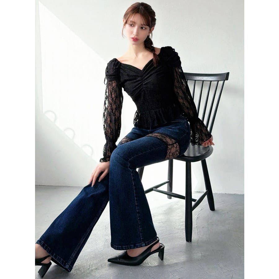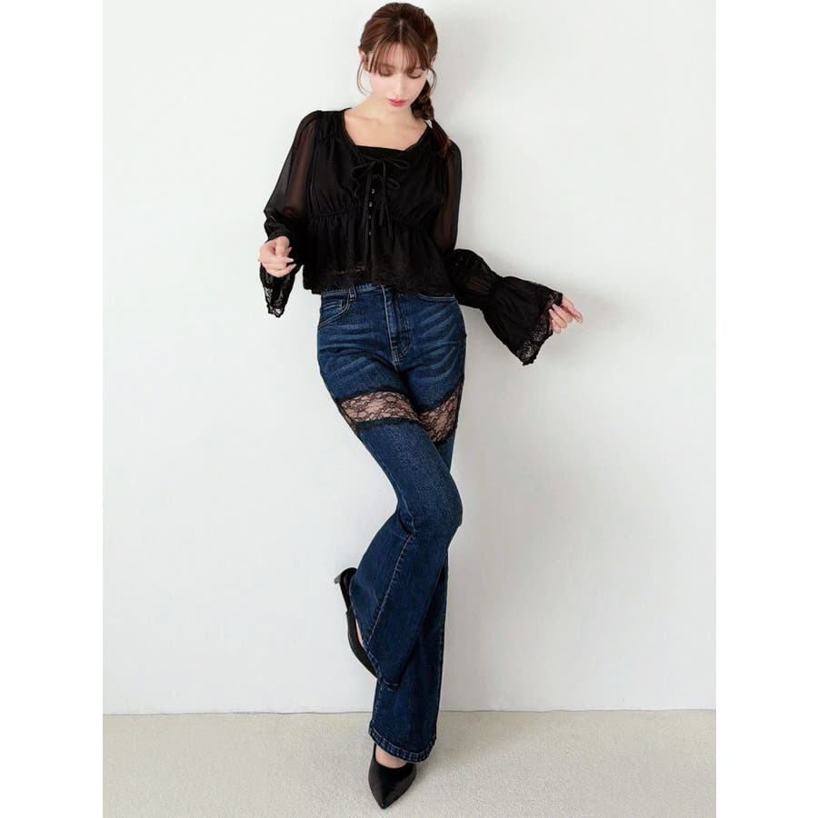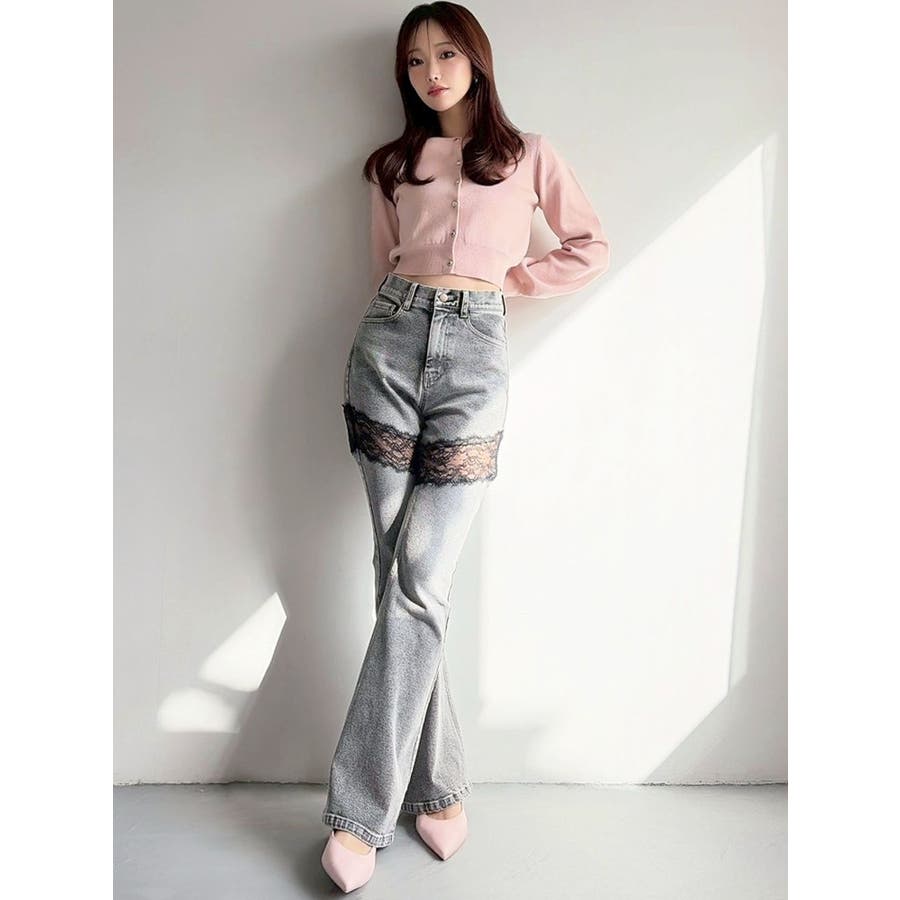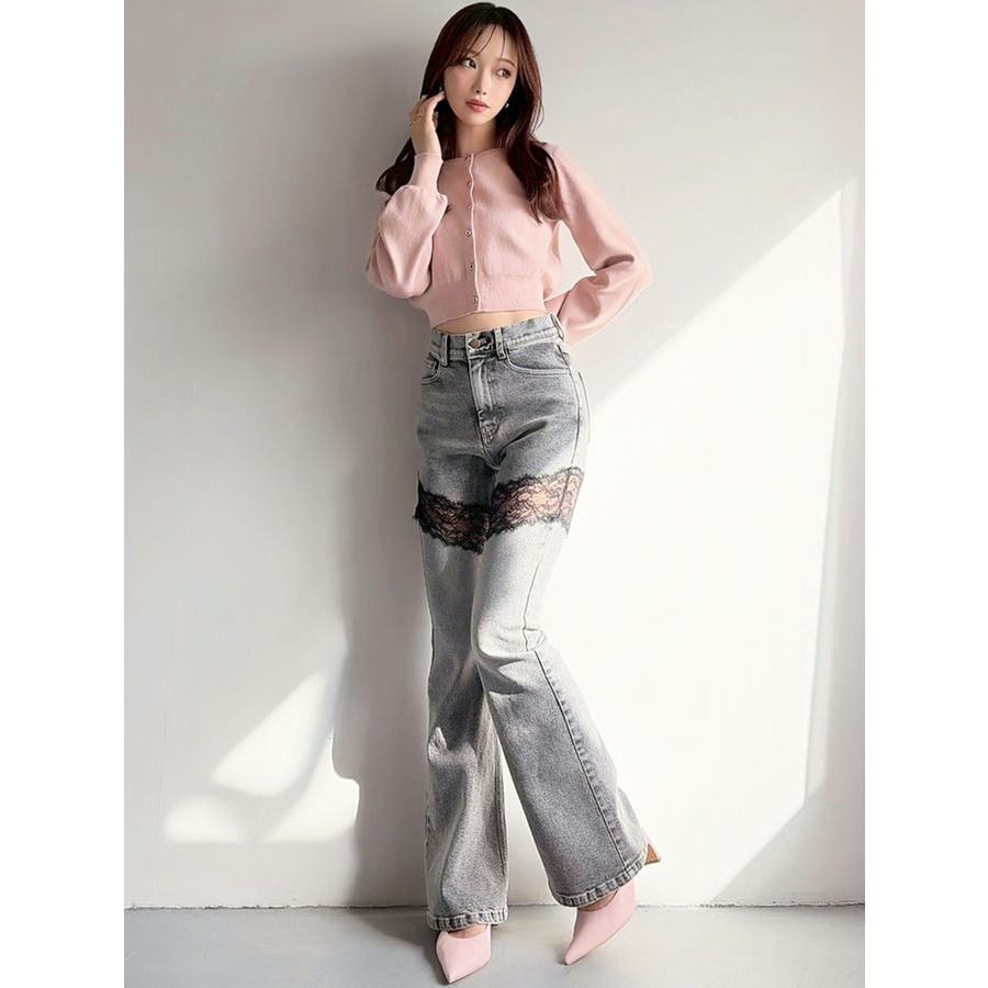 レースデザインがエレガントな印象のフレアデニム▽デザイン▽ドッキングデザインがコーデのアクセントになるフレアデニム。カジュアルなデニム生地にレースをドッキングさせ、エレガントな雰囲気に仕上げました。程よい肌見せとフレアのシルエットが女性らしさを演出してくれます◎レースのカットをななめに入れているので、足が長く見えスタイルアップ効果も抜群▽カラー▽グレー、インディゴの2色展開。▽スタイリング▽レーストップスやカーディガンなどのフェミニンなアイテムはもちろん、パーカーやTシャツなどのカジュアルなアイテムを合わせるのもおすすめ◎足元にはパンプスを合わせていただくと、トレンド感のあるコーデに仕上がります♪
