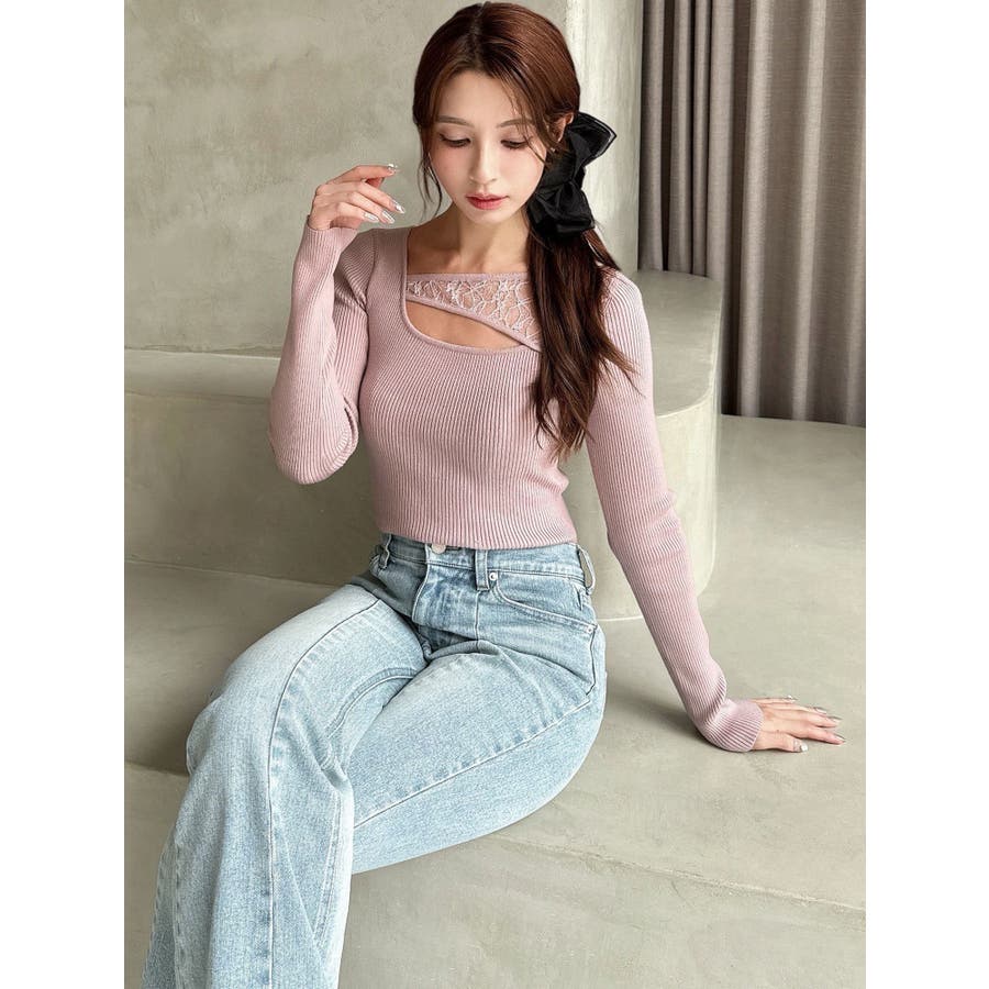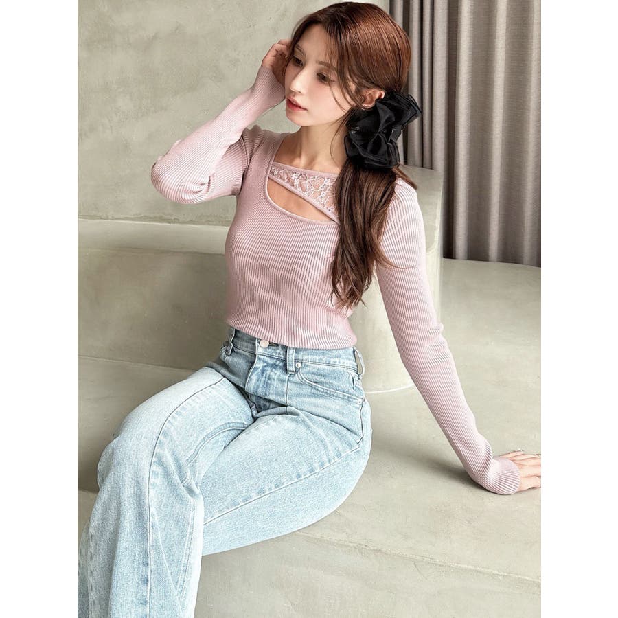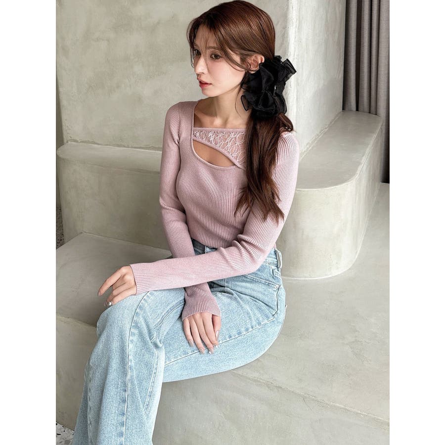 バストのレースデザインがワンポイントの春ニット▽デザイン▽リブニット素材でボディにフィットするシンプルニットに、バスト開きのデザインとレースドッキングデザインを加えた1枚。程よいレースの透け感とバスト開きの肌見せが女性らしさをUP。アシンメトリーなネックデザインでシンプルすぎない印象に仕上げました。▽カラー▽白・黒・ピンクの3色展開。▽スタイリング▽インしやすい丈感でボトムに合わせやすい着回し万能ニット。スカートでフェミニンコーデも、デニムで程よくキレイ目なコーデも♪タイトなサイズ感で薄手のアウターのインナーにもピッタリ◎※着用画像はフラッシュの加減で実際の製品と色味等が異なる場合がございますので、生地のズームアップ画像をご確認ください。※ご利用の端末画面の設定により実際の商品と色味が異なる場合がございます。【商品特徴】透け感:なし伸縮性:あり生地の厚さ:薄手サイズ感:普通裏地:なしポケット:なし