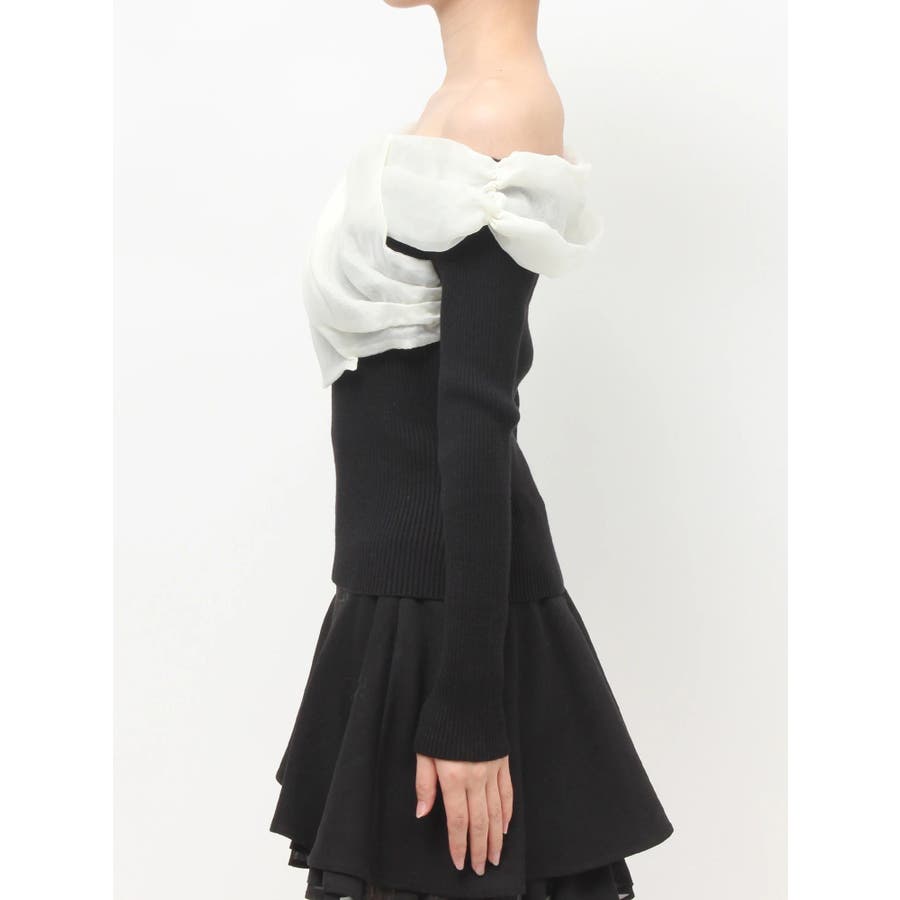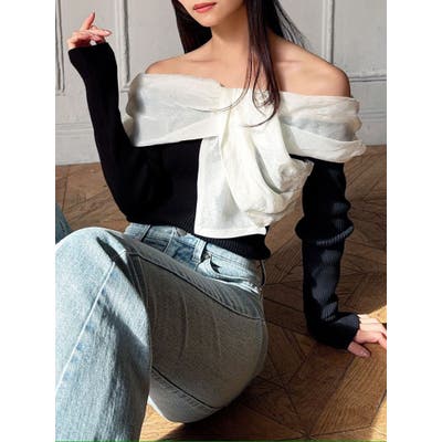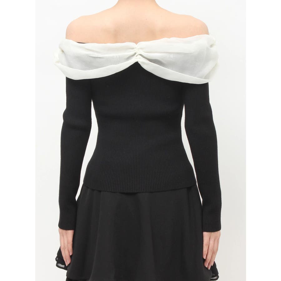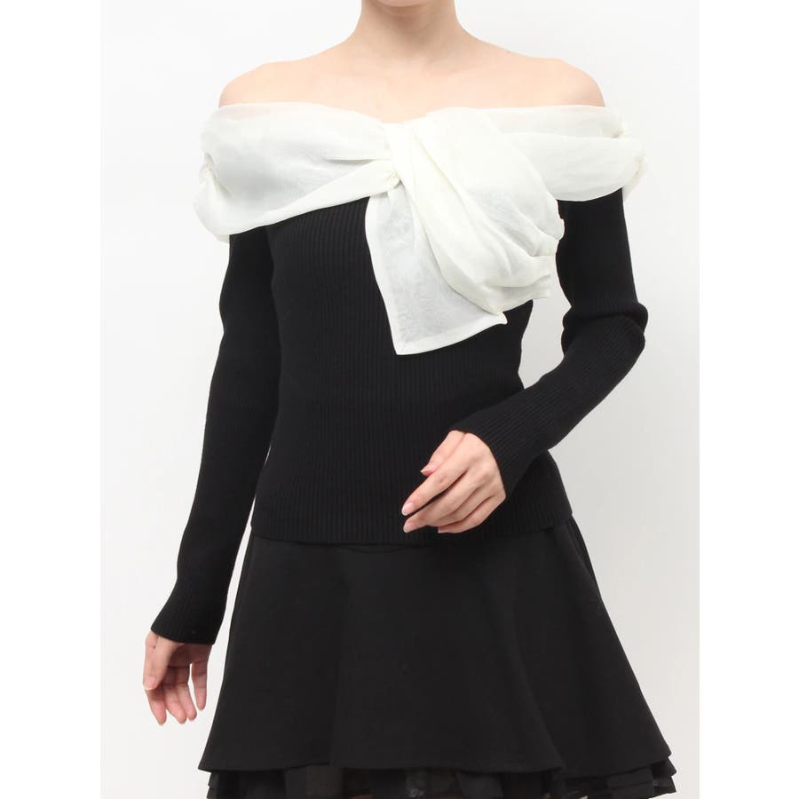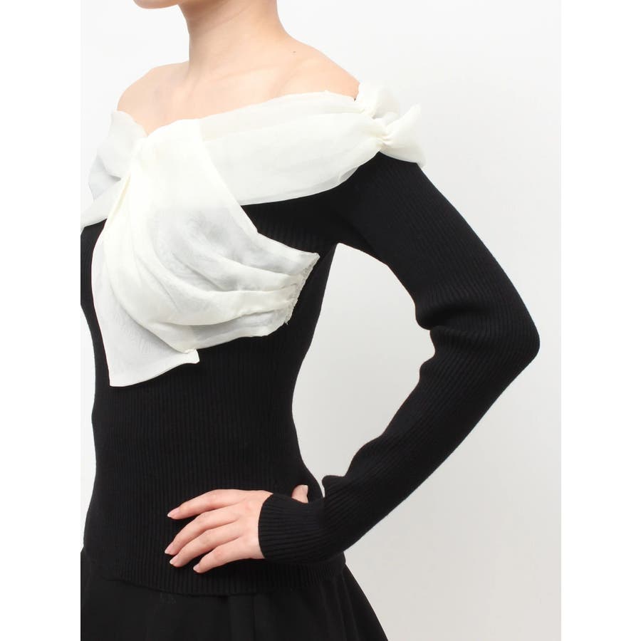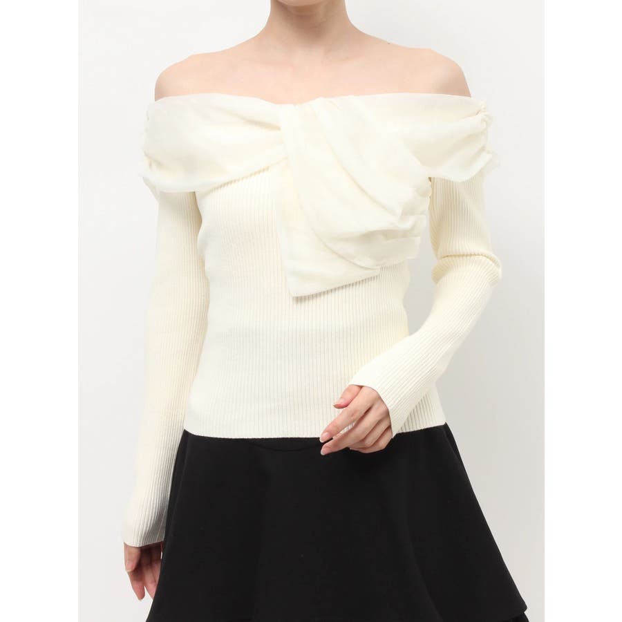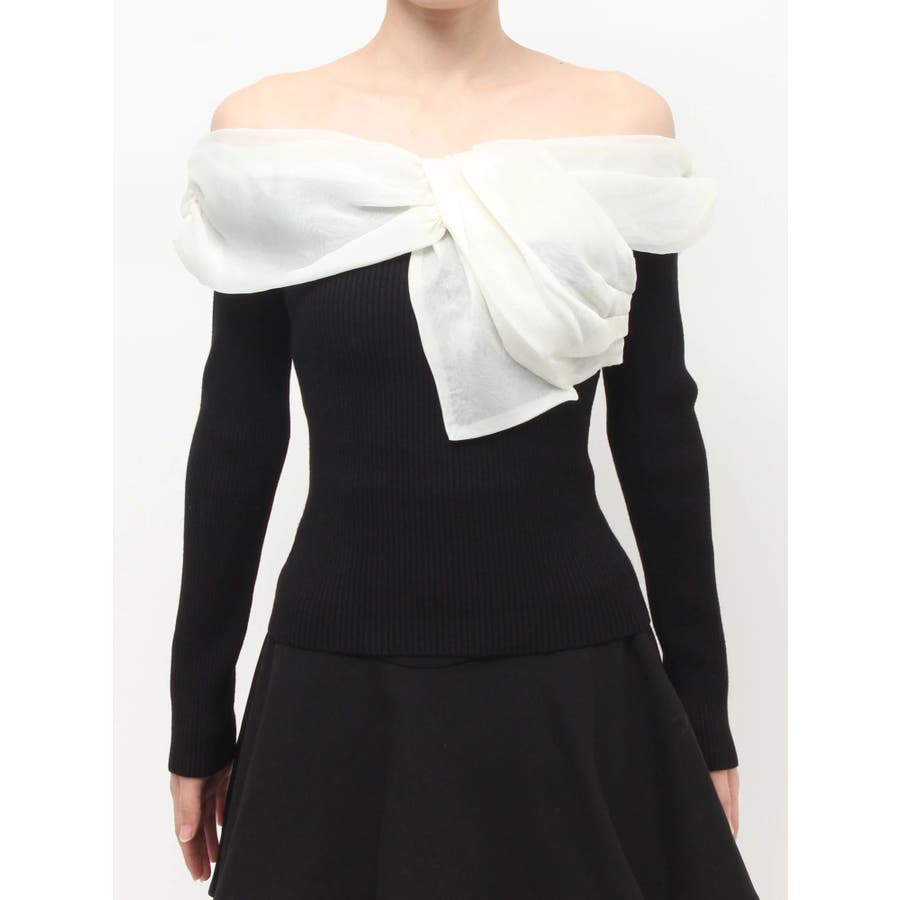 オーガンジーをあしらったフェミニンなニットトップス▽デザイン▽タイトに編まれたニットに軽やかなオーガンジーを幾重にも重ねたニットプルオーバー。意外性のある組み合わせがフレッシュなムードを漂わせます。ソフトでしなやかなボディに、アクセサリーのように配されたオーガンジーリボンが印象的な1枚。▽カラー▽白、黒、」オレンジの3色展開。▽スタイリング▽マーメイドスカートやフレアスカートに合わせたきれいめのスタイリングはもちろんデニムと合わせたカジュアルなスタイルもおすすめです◎