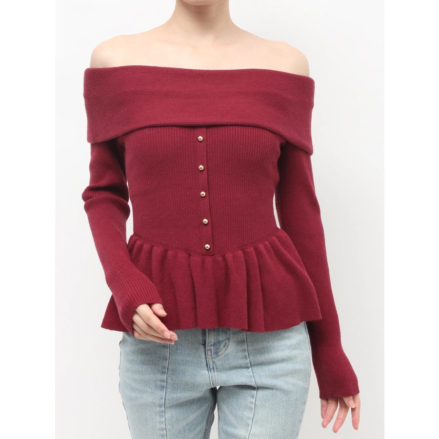 上品で女性らしいデザインのオフショルニット▽デザイン▽オフショルでデコルテが綺麗に見えるデザインニット。ペプラムシルエットで大人っぽさのある女性らしい印象に。小ぶりのゴールドボタンをつけたことで上品さをプラス。シンプルながらシルエットにもこだわったアイテムです。▽カラー▽白・黒・赤・ピンクの4色展開。▽スタイリング▽白・黒は同素材のマーメイドスカート合わせでセットアップ着用が可能◎デニムやストレートパンツなど、お持ちのボトムにも合わせやすく着回しの幅が広がる万能春ニットです。【セットアップアイテムはコチラ】>>ヘムフリルマーメイドニットスカート※着用画像はフラッシュの加減で実際の製品と色味等が異なる場合がございますので、生地のズームアップ画像をご確認ください。※ご利用の端末画面の設定により実際の商品と色味が異なる場合がございます。【商品特徴】透け感:なし伸縮性:ややあり生地の厚さ:薄手サイズ感:普通裏地:なしポケット:なし